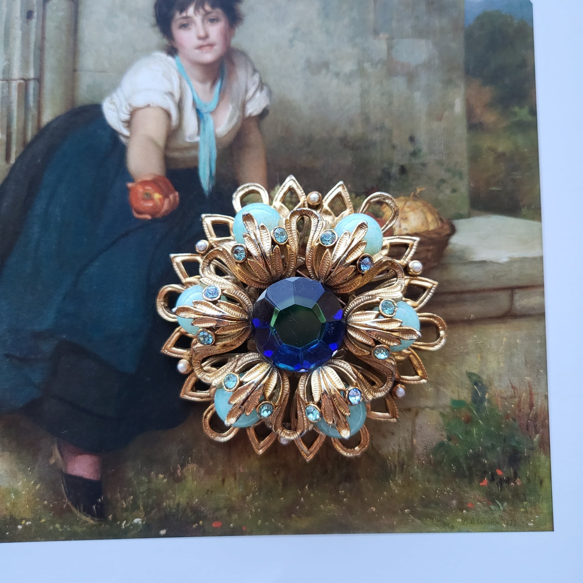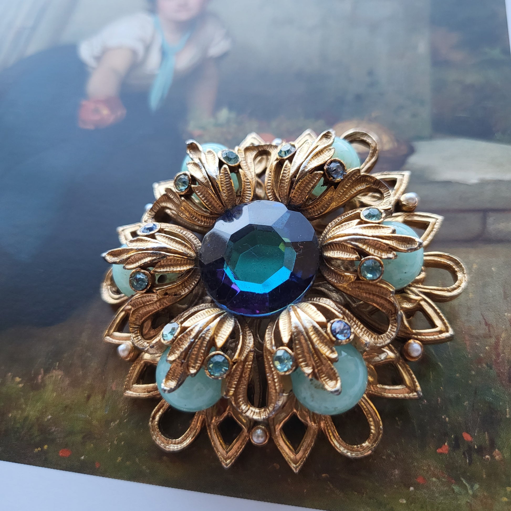 Astatement brooch by Sphinx with different shades and shapes of blue stones and seed pearl set in gold plated metal