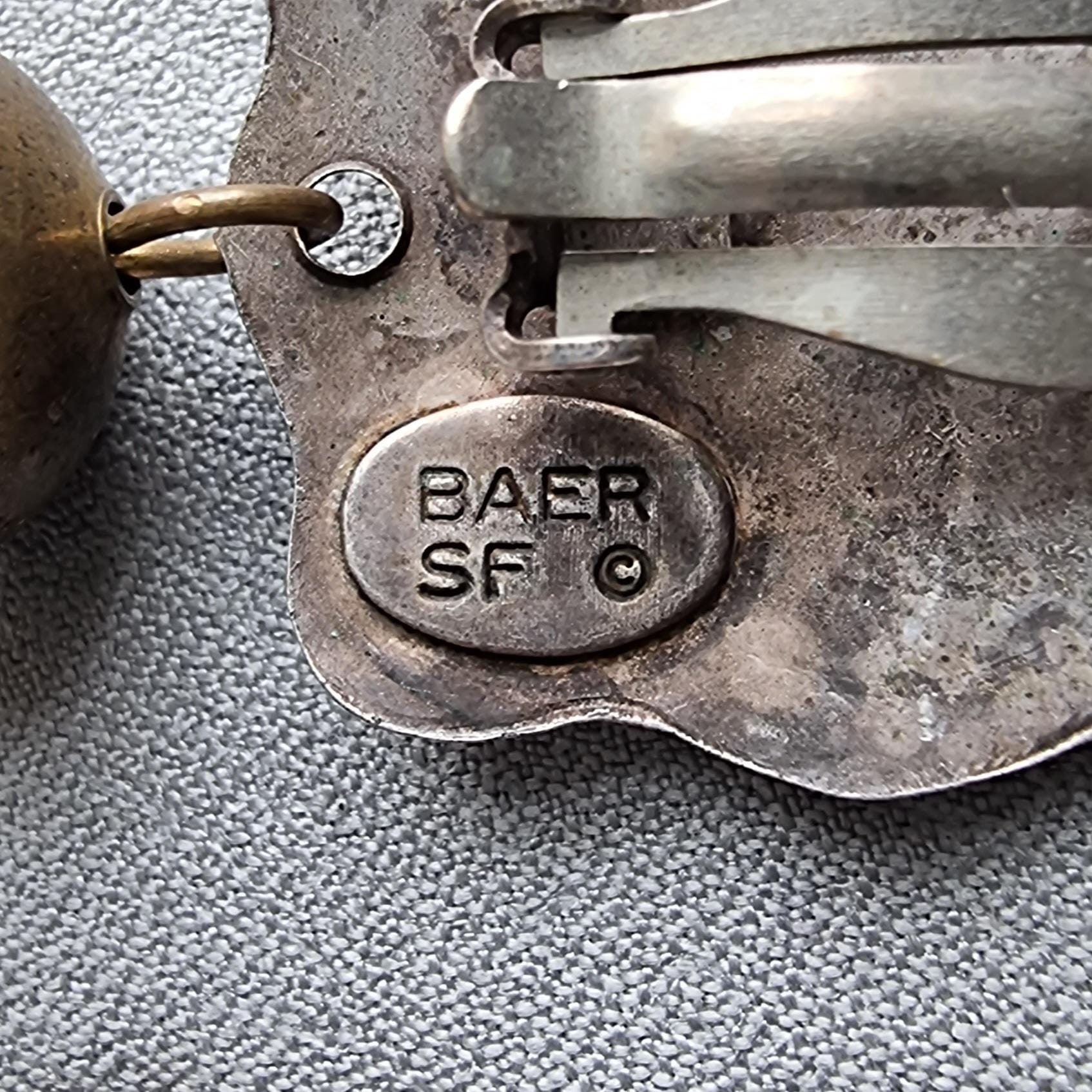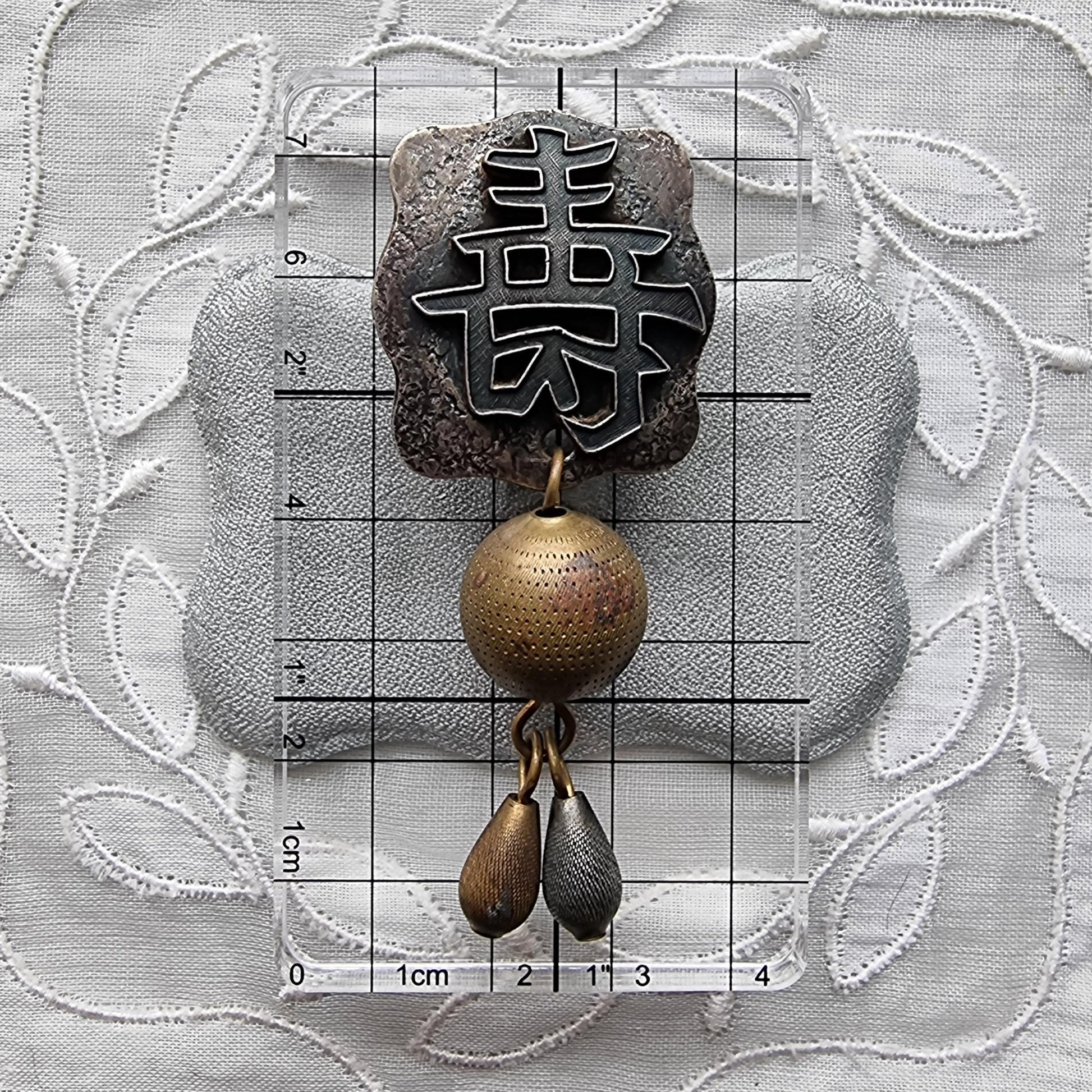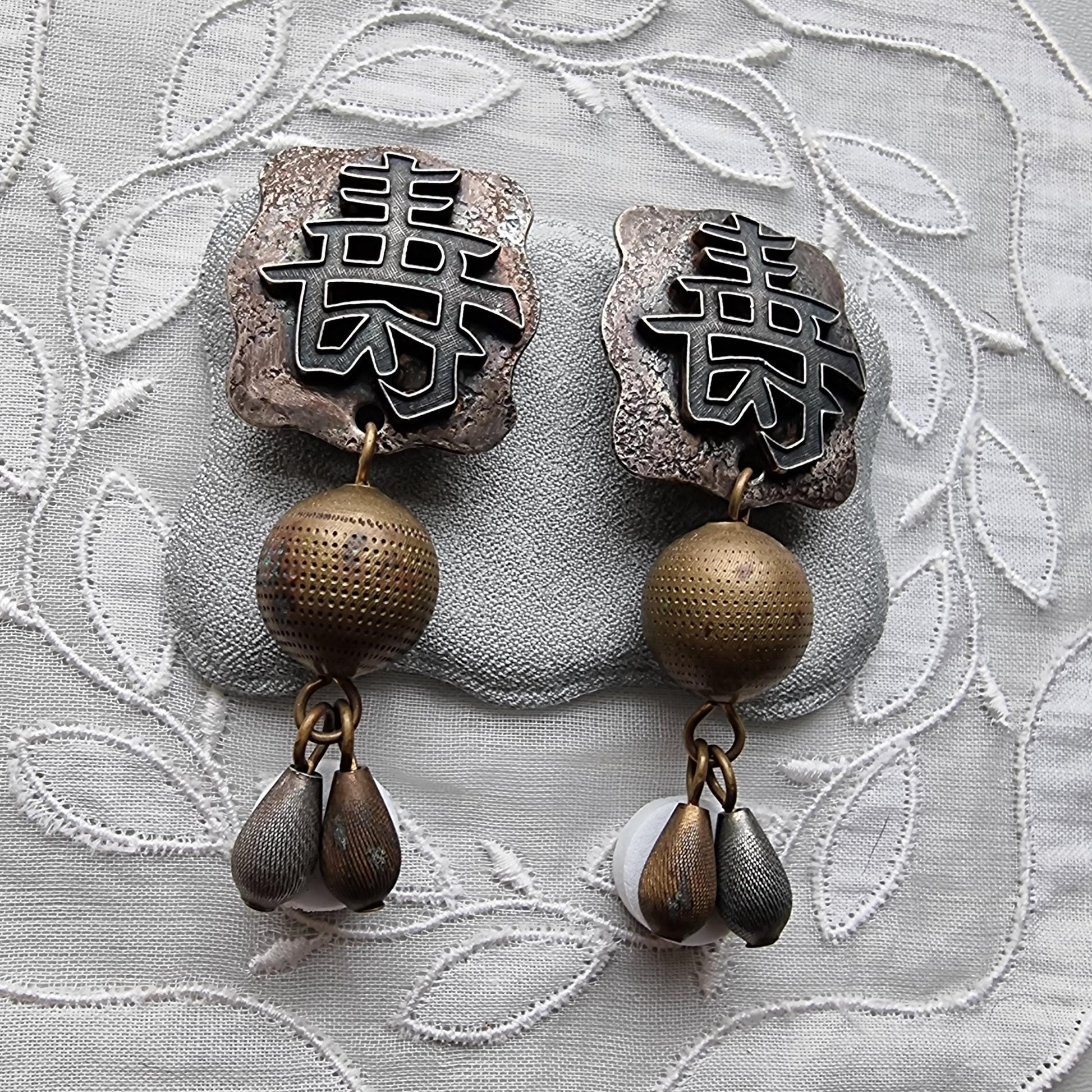 A stunning pair of clip on earrings by Marjorie Baer with a Chinese character for life and ball drops in brass and silver tone metal