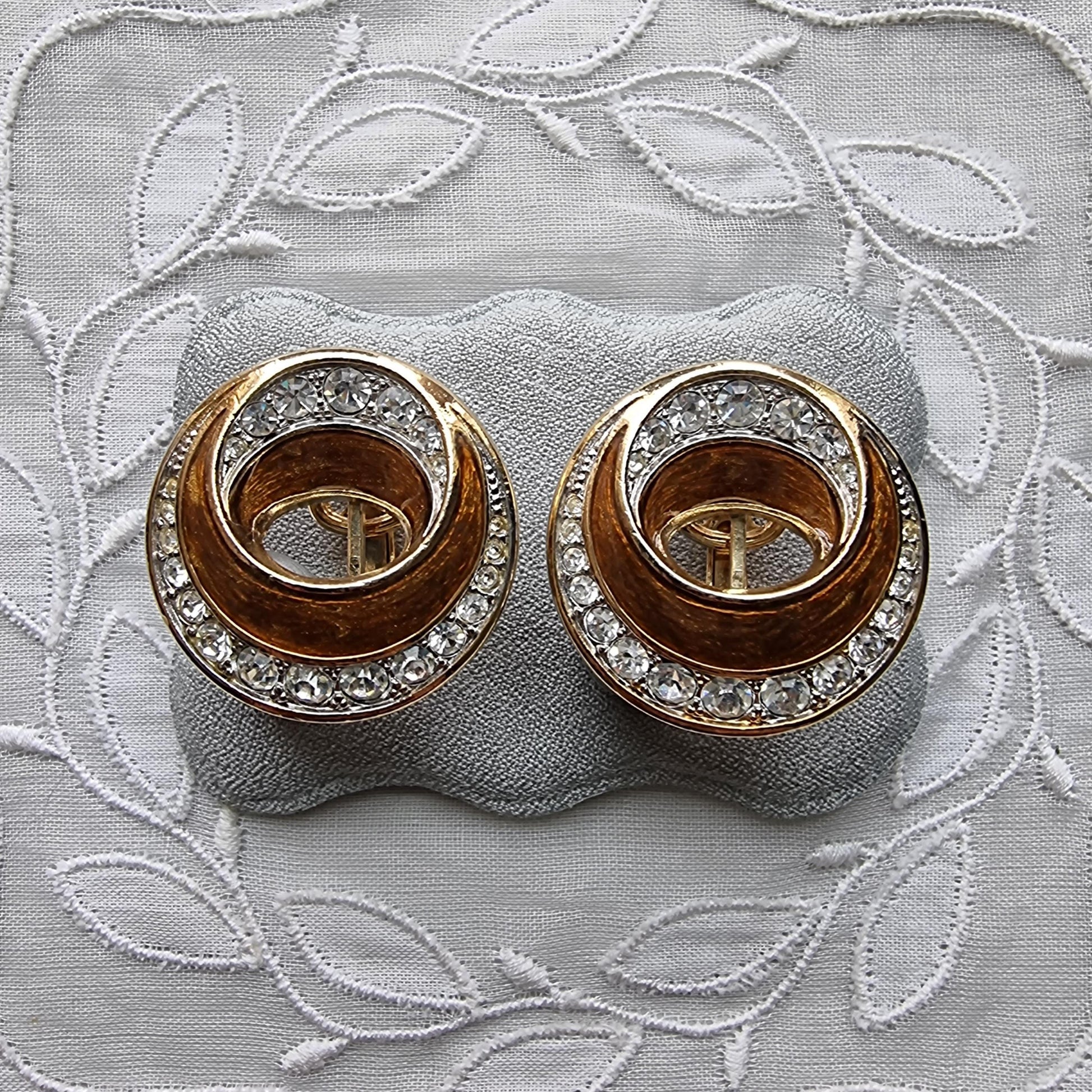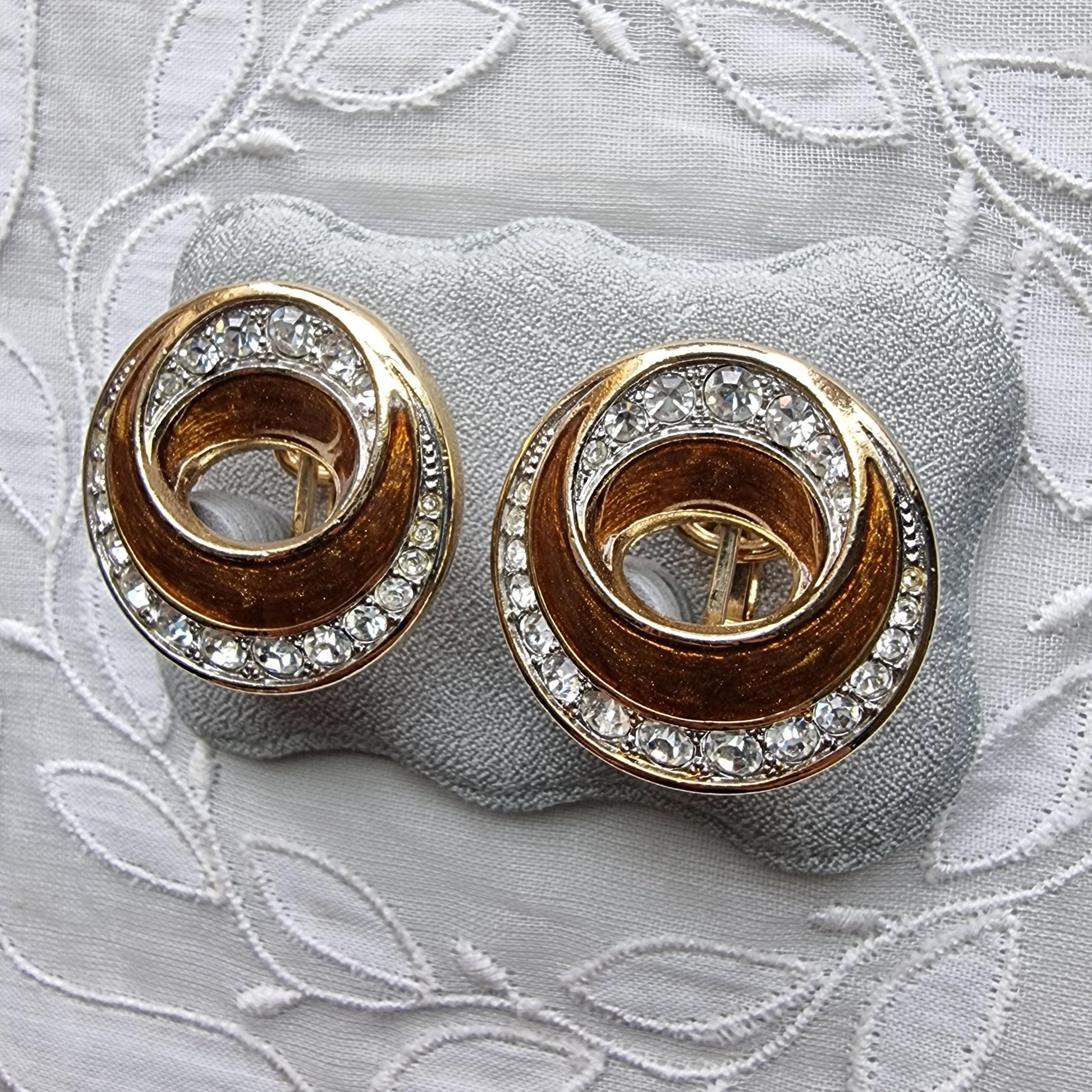 An elegant pair of round clip on earrings by Bergdorf Goodman with brown enamel and clear crystals on gold plated metal