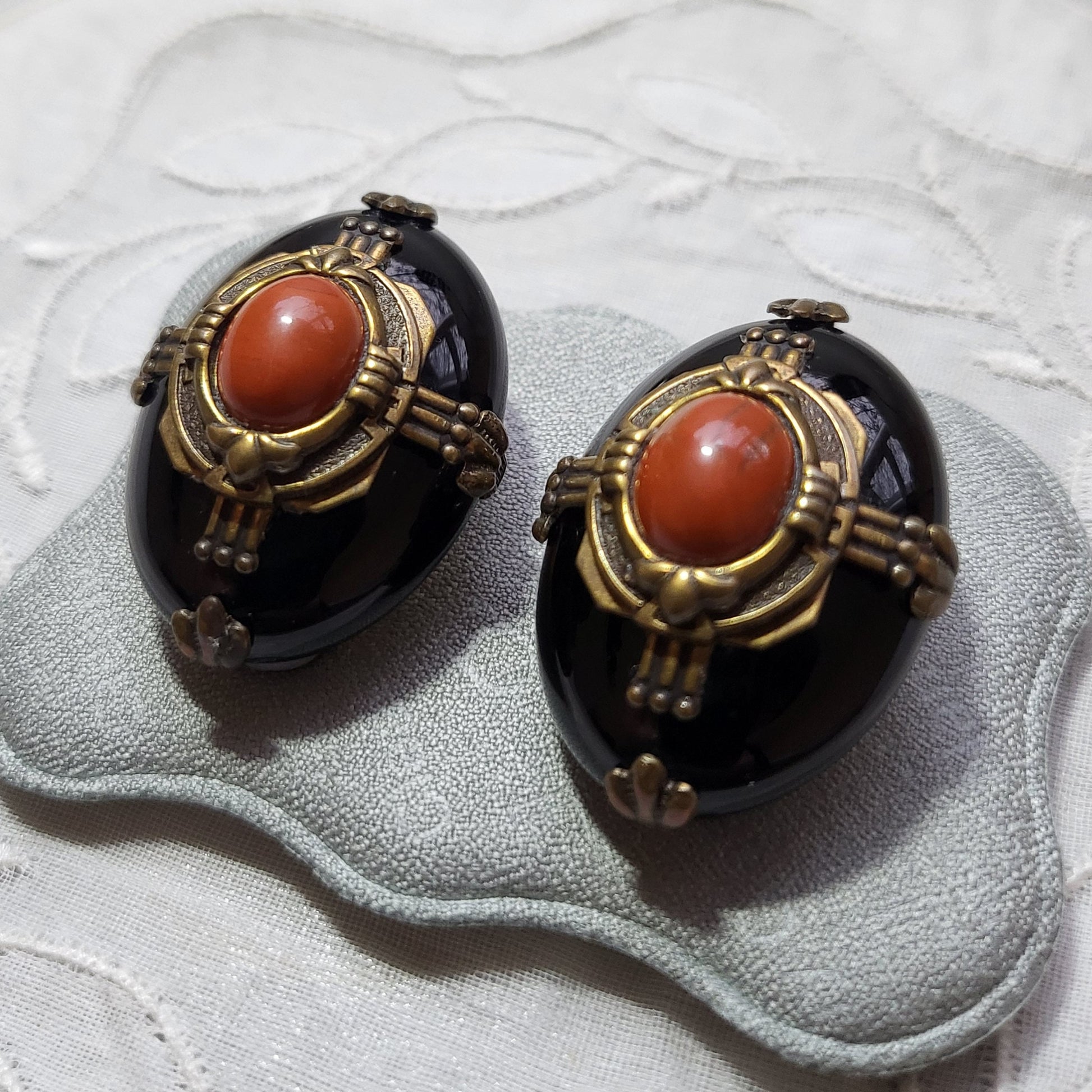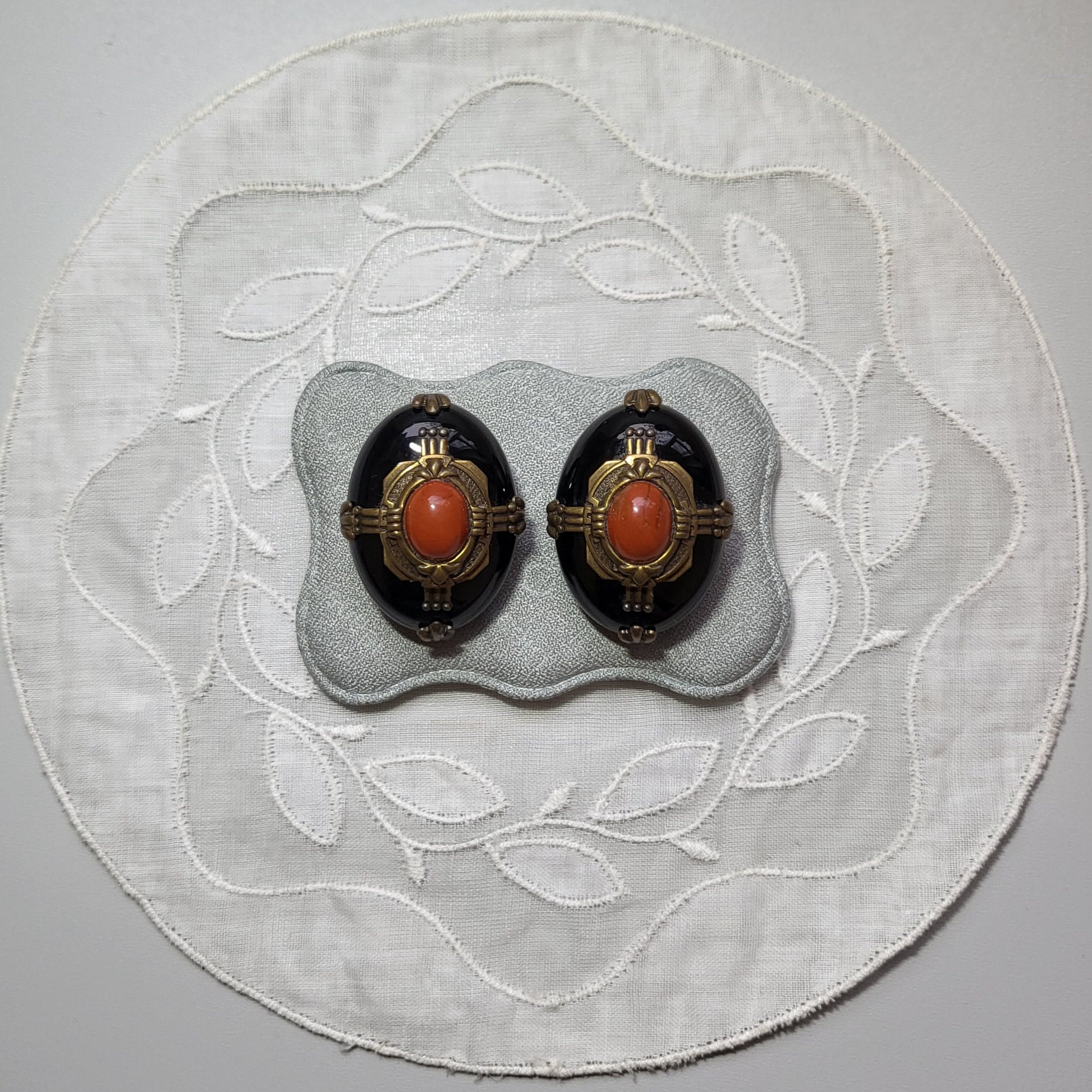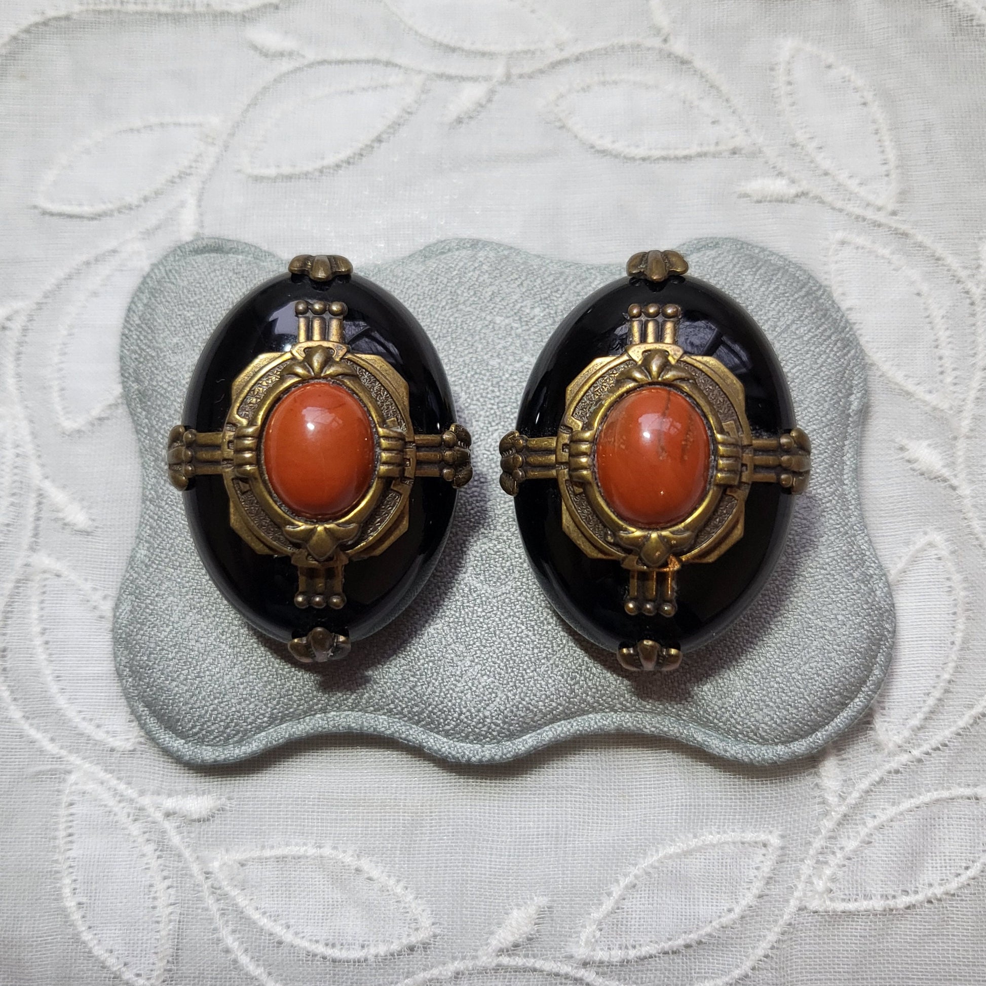 A stunning pair of vintage acrylic clip on earrings with contrasting orange and black coloured cabochon held by jewellery brass metal frame