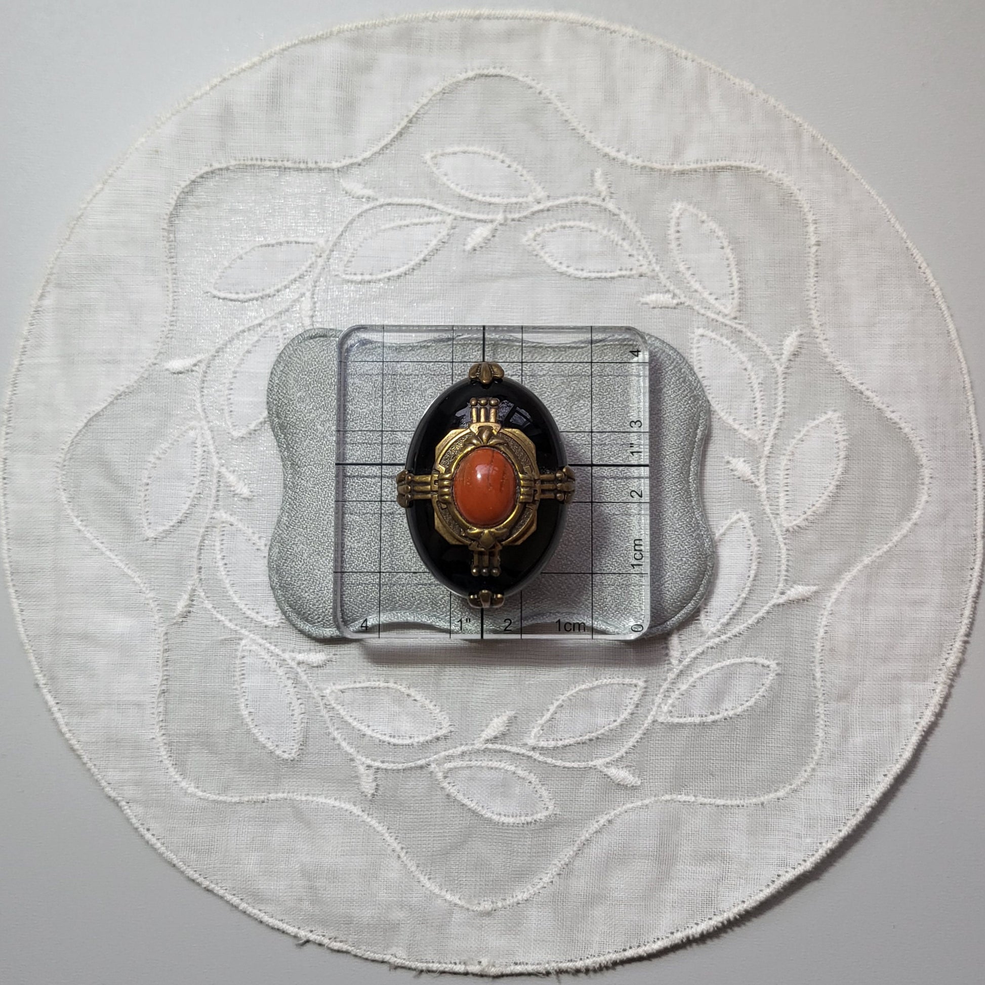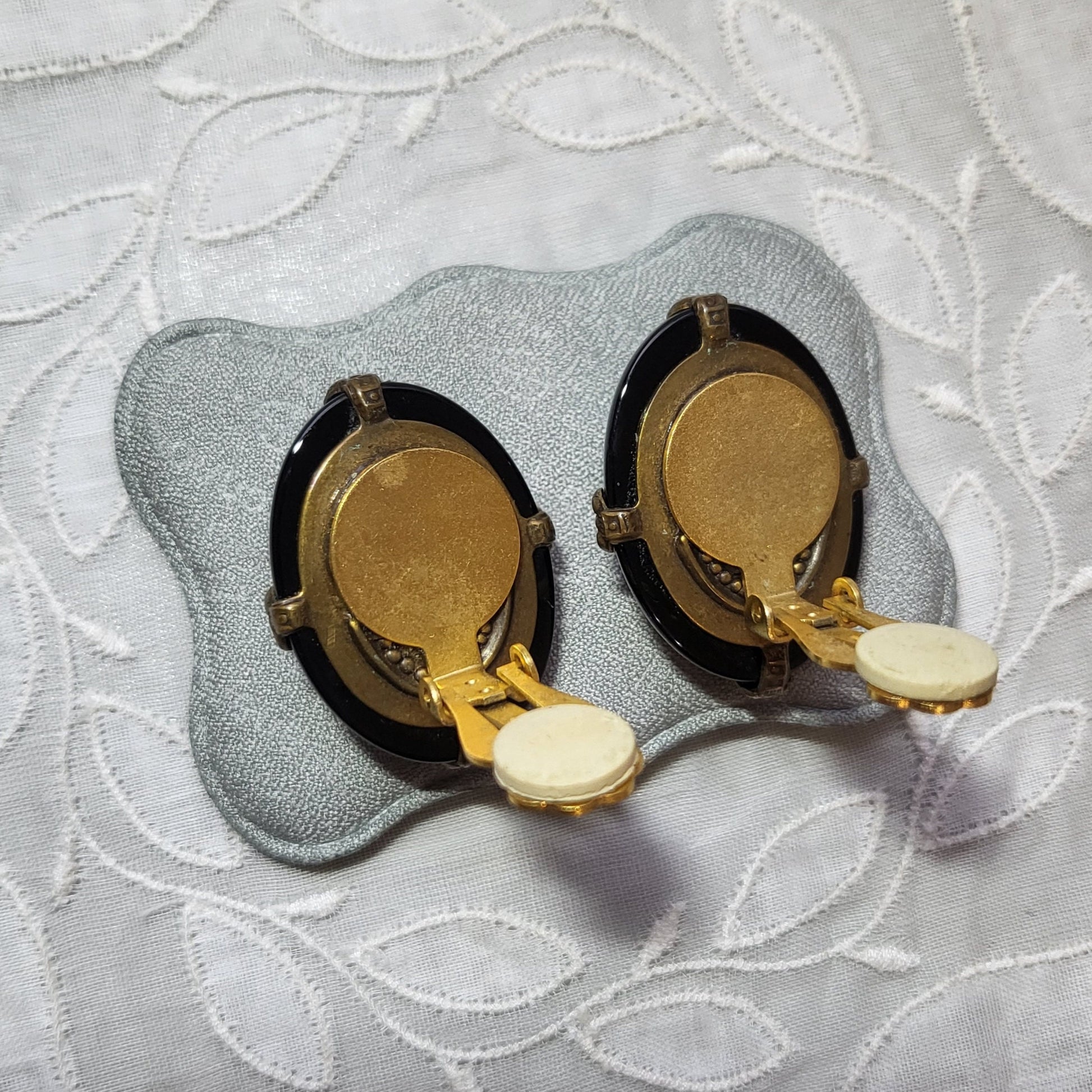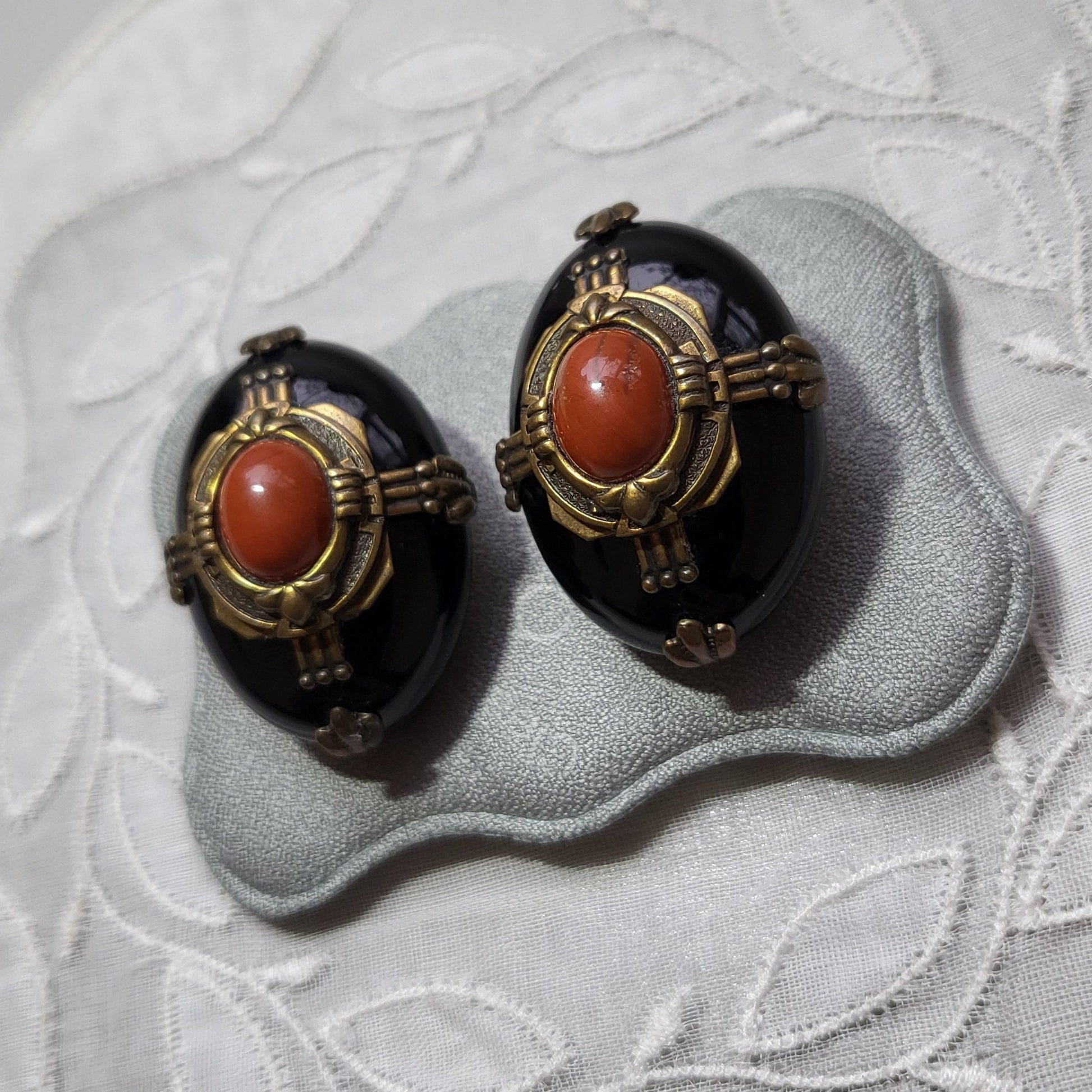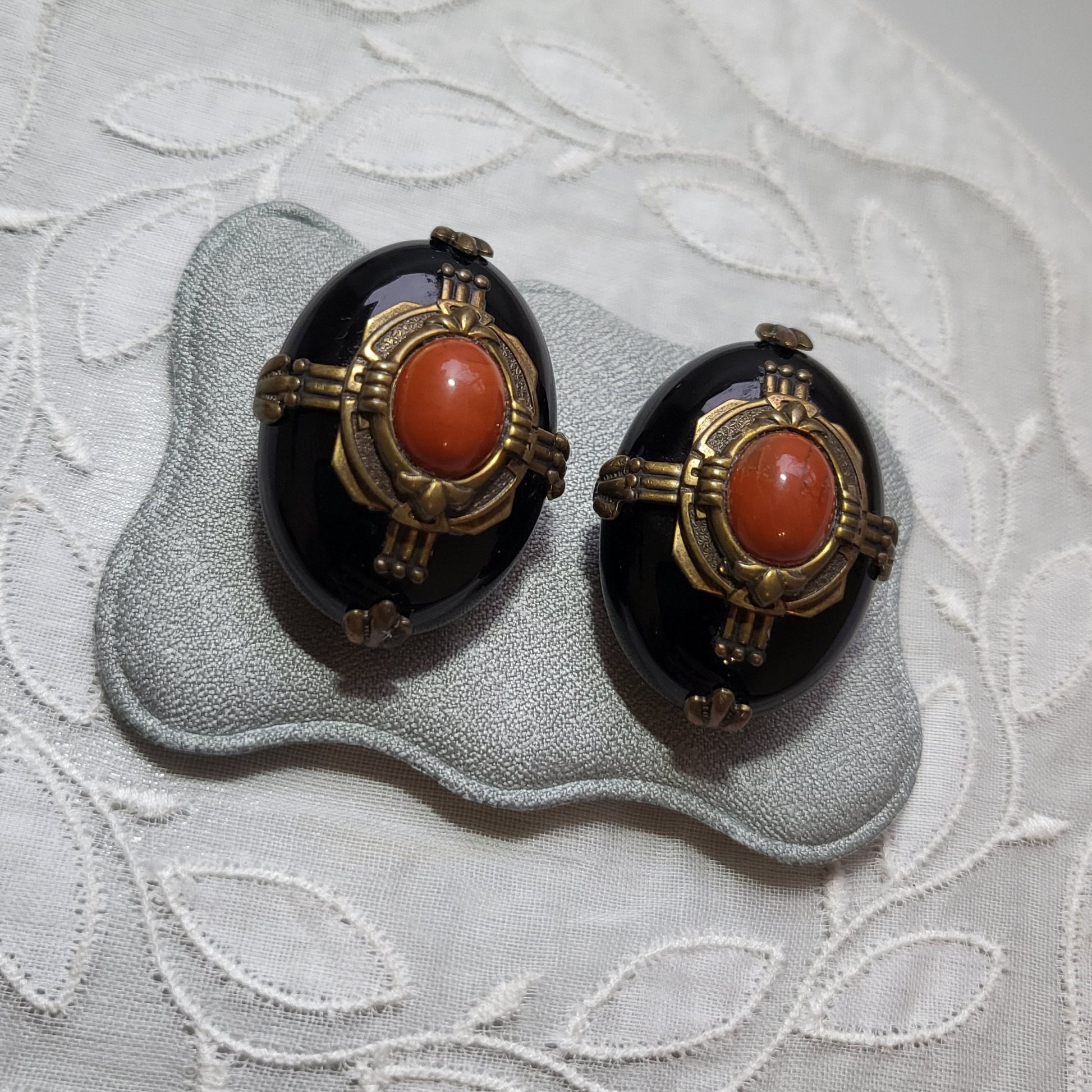 A stunning pair of vintage acrylic clip on earrings with contrasting orange and black coloured cabochon held by jewellery brass metal frame