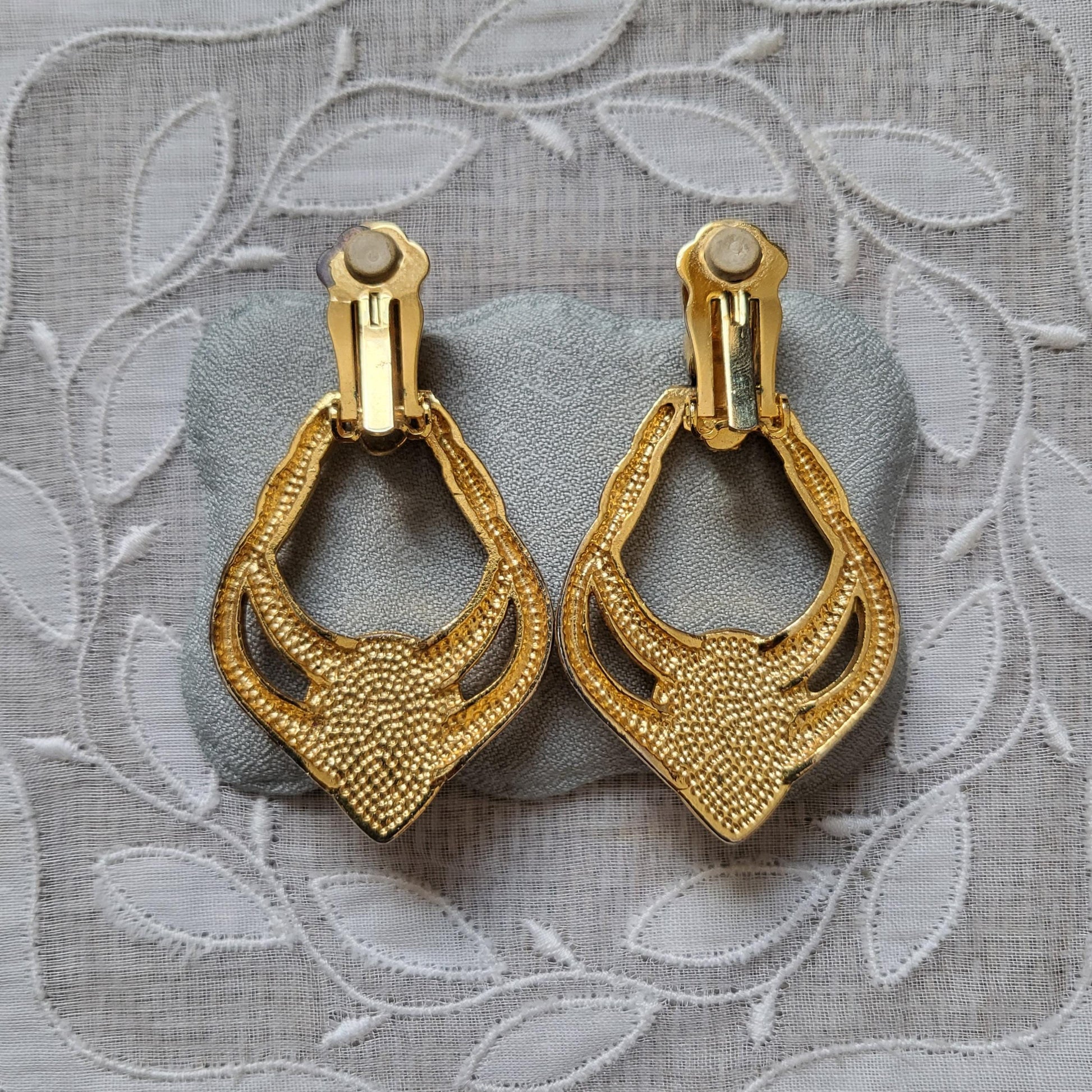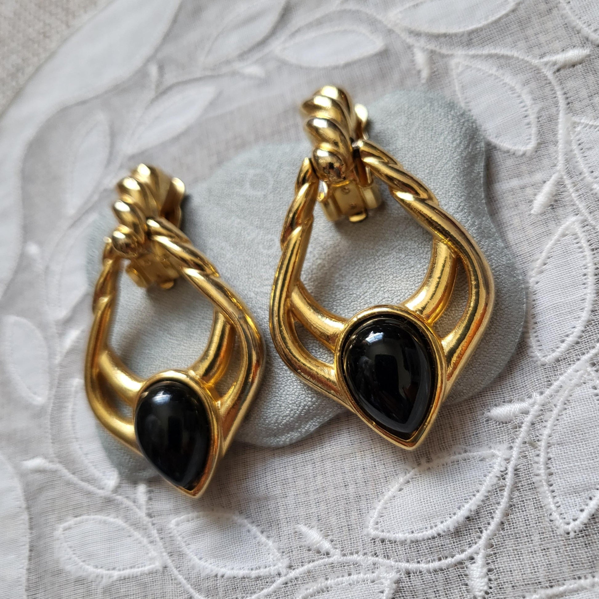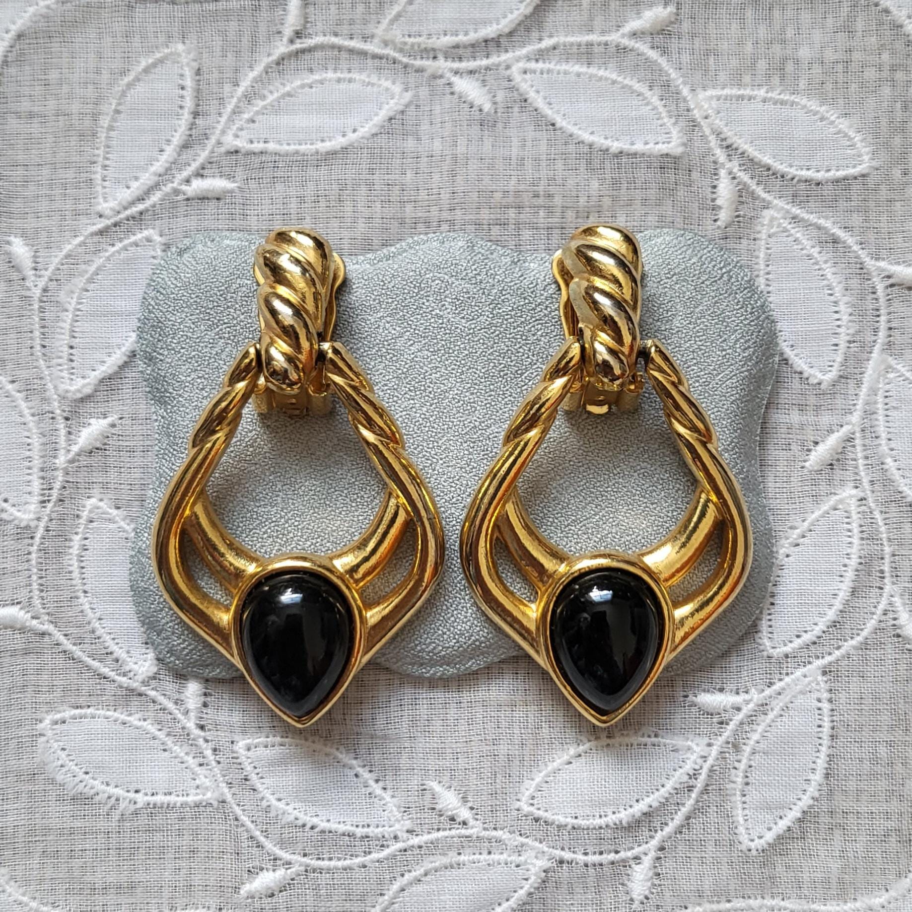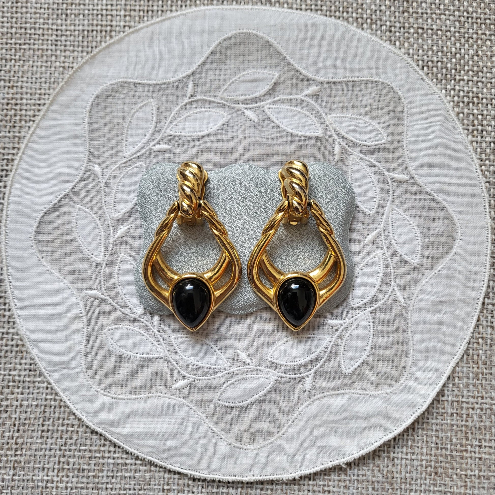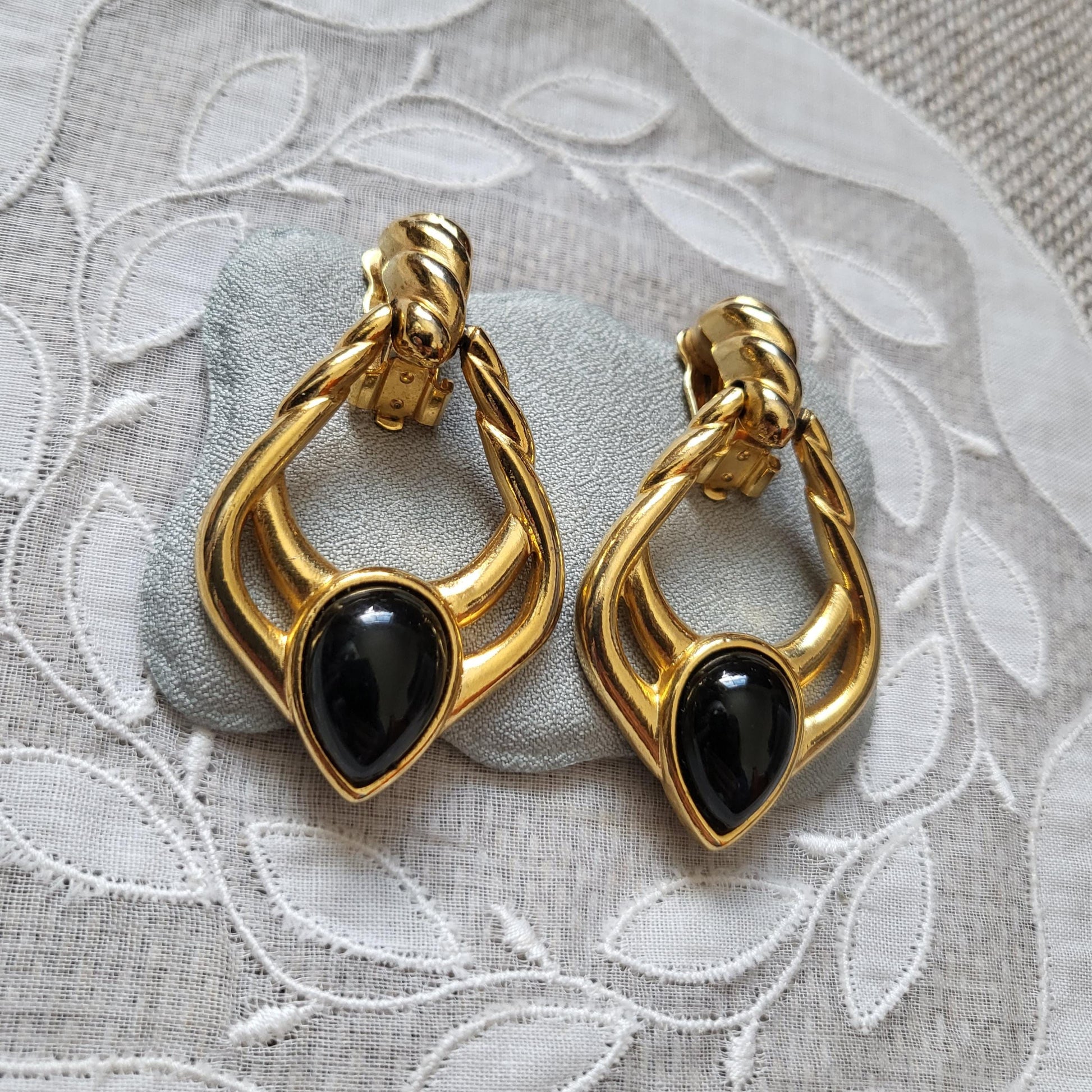 A gorgeous pair of door knocker style clip on earrings accented with a black cabochon on gold plated metal