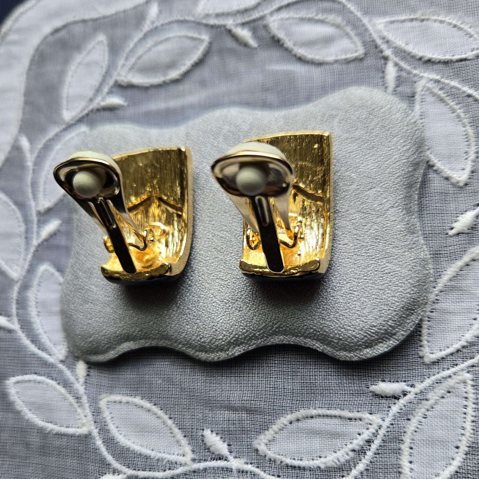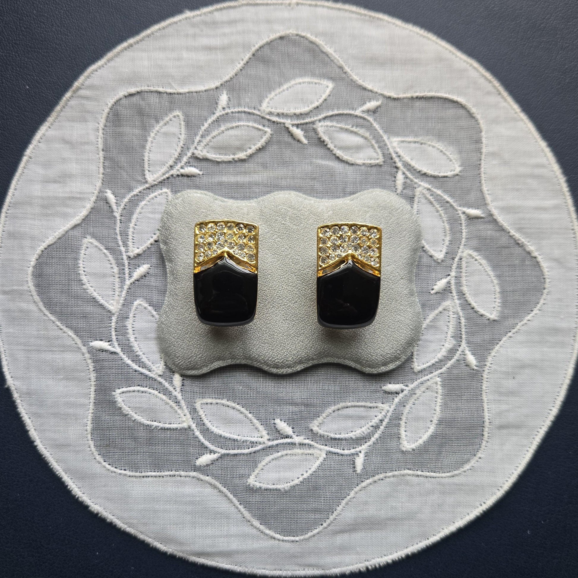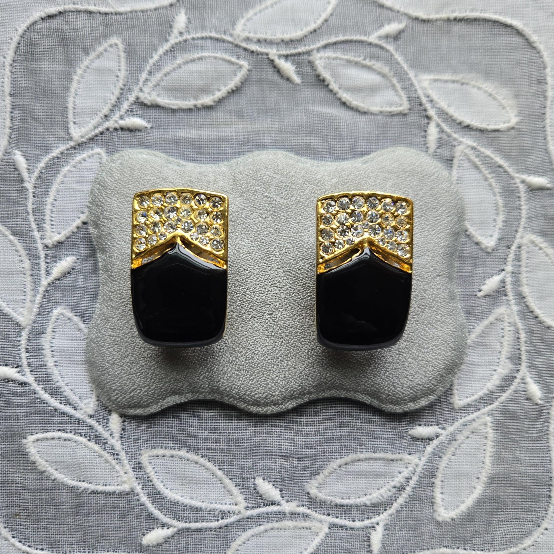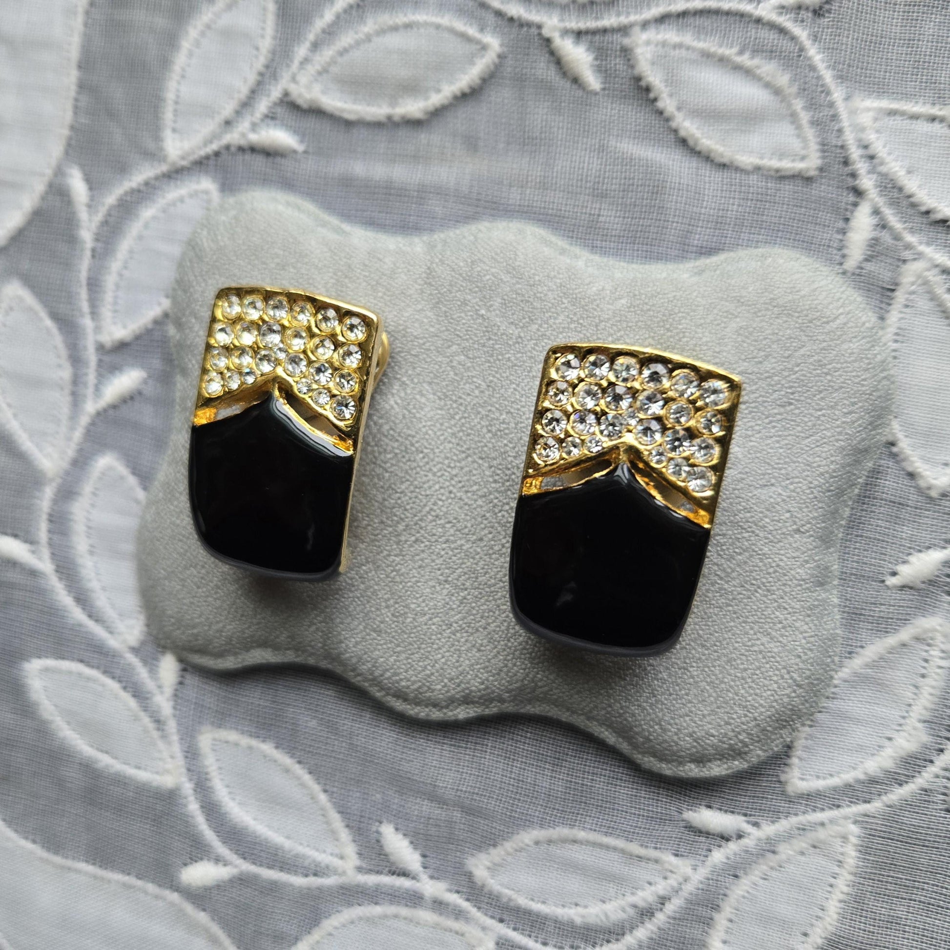 A gorgeous pair of clip on earrings with black enamel and small clear crystals on gold plated metal