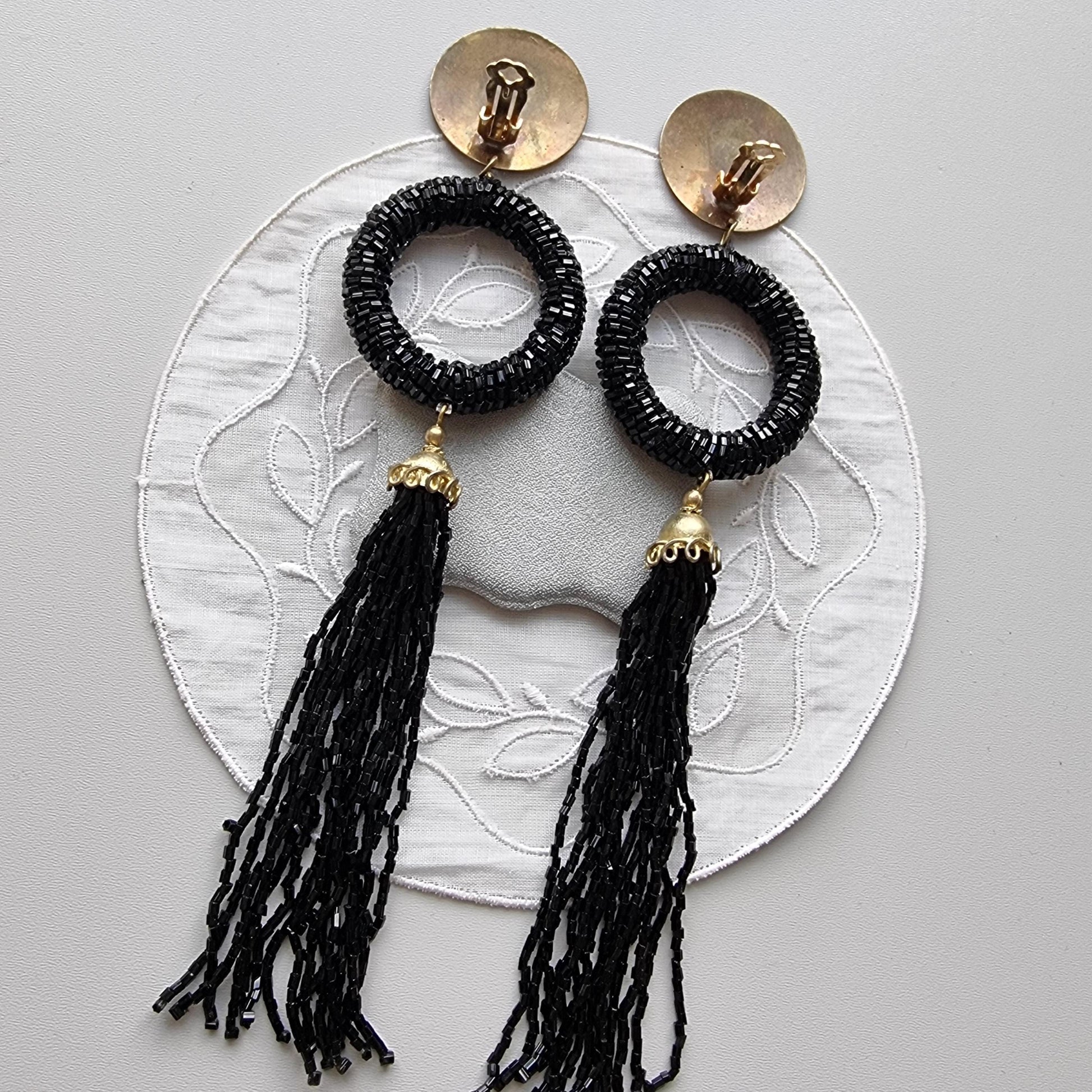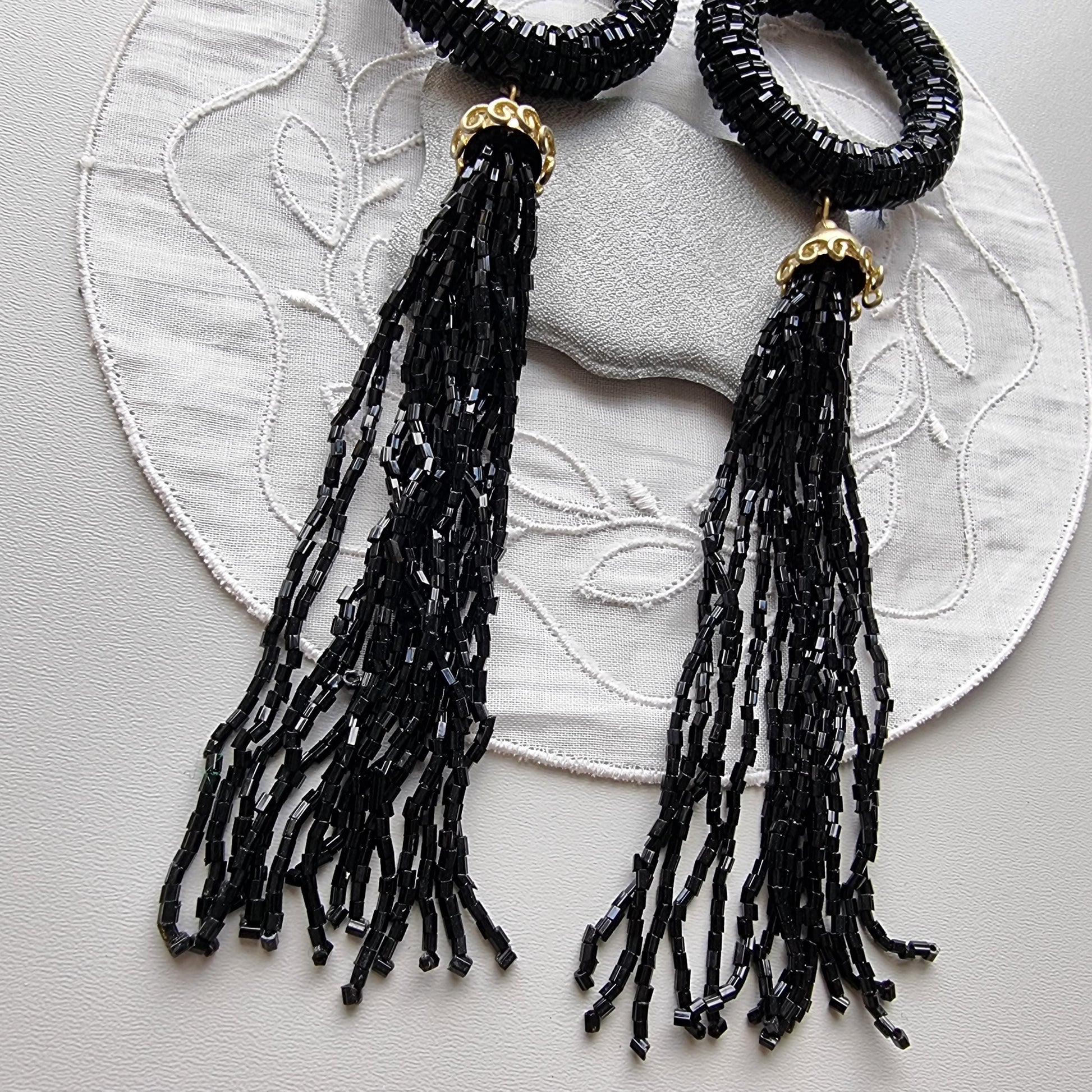 A stunning pair of statement tassels drop earrings with small black beads and brass metal