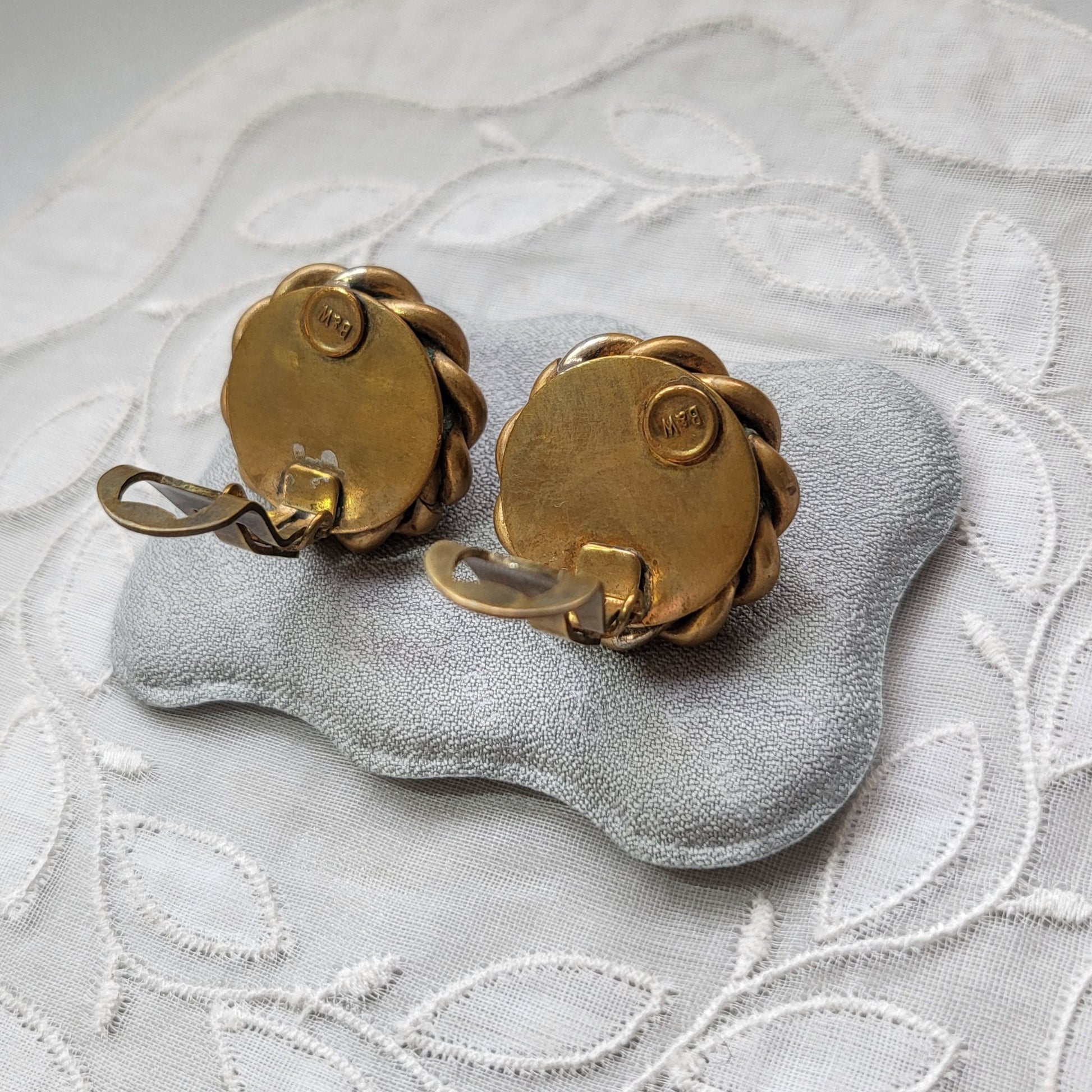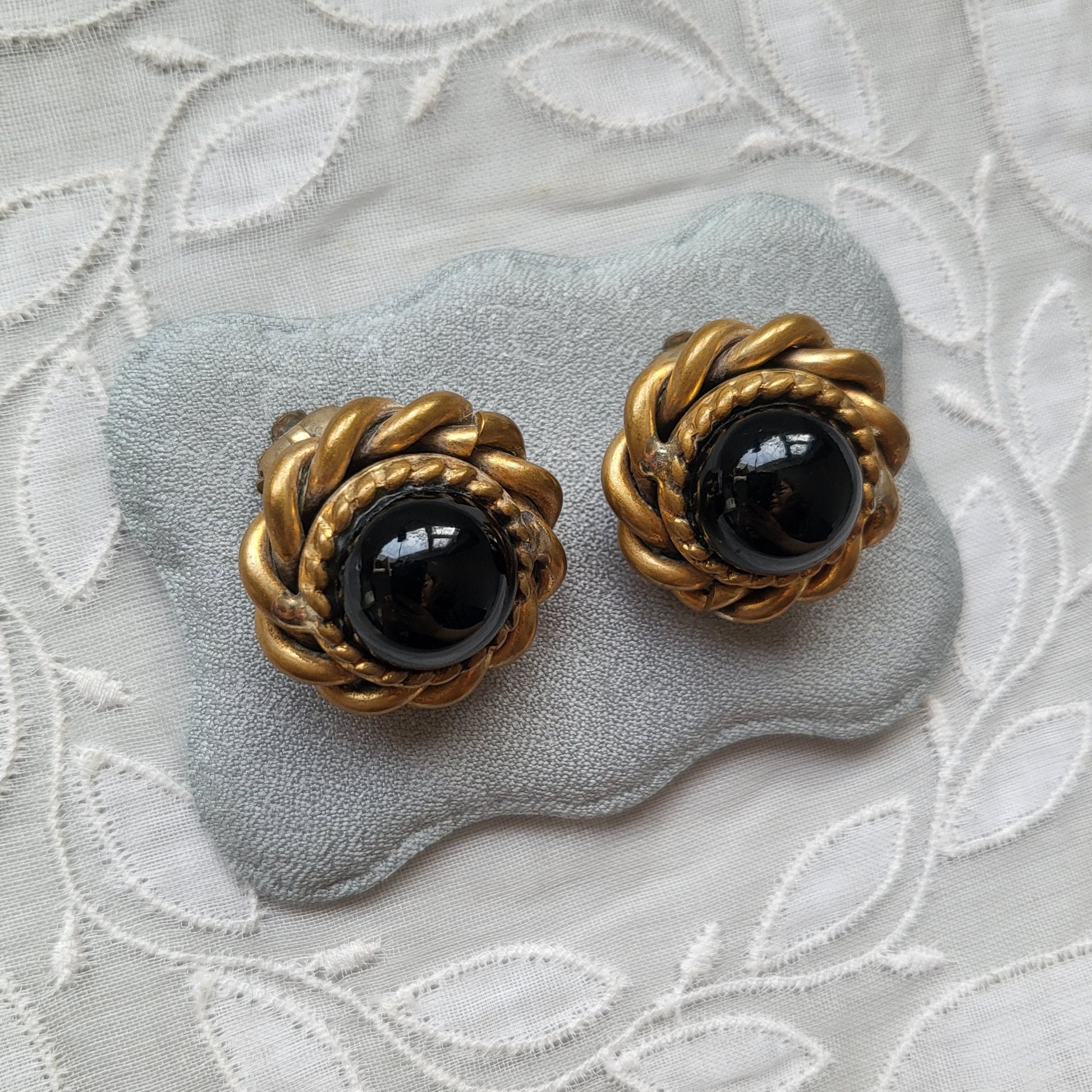 A classic pair of vintage Butler and Wilson round clip on earrings with black cabochon glass set on brass jewellery metal alloy