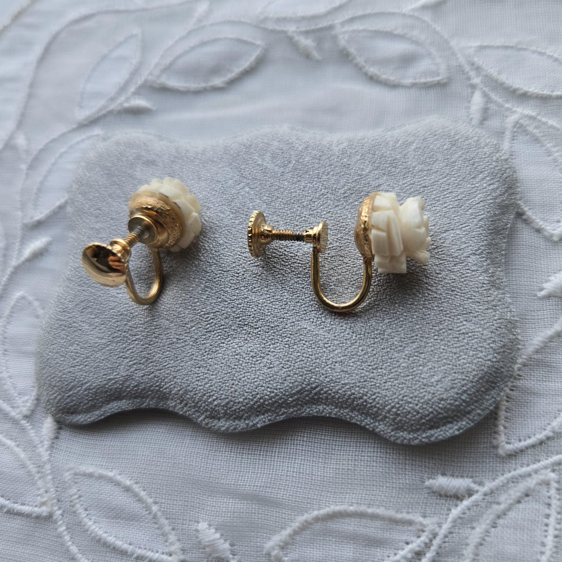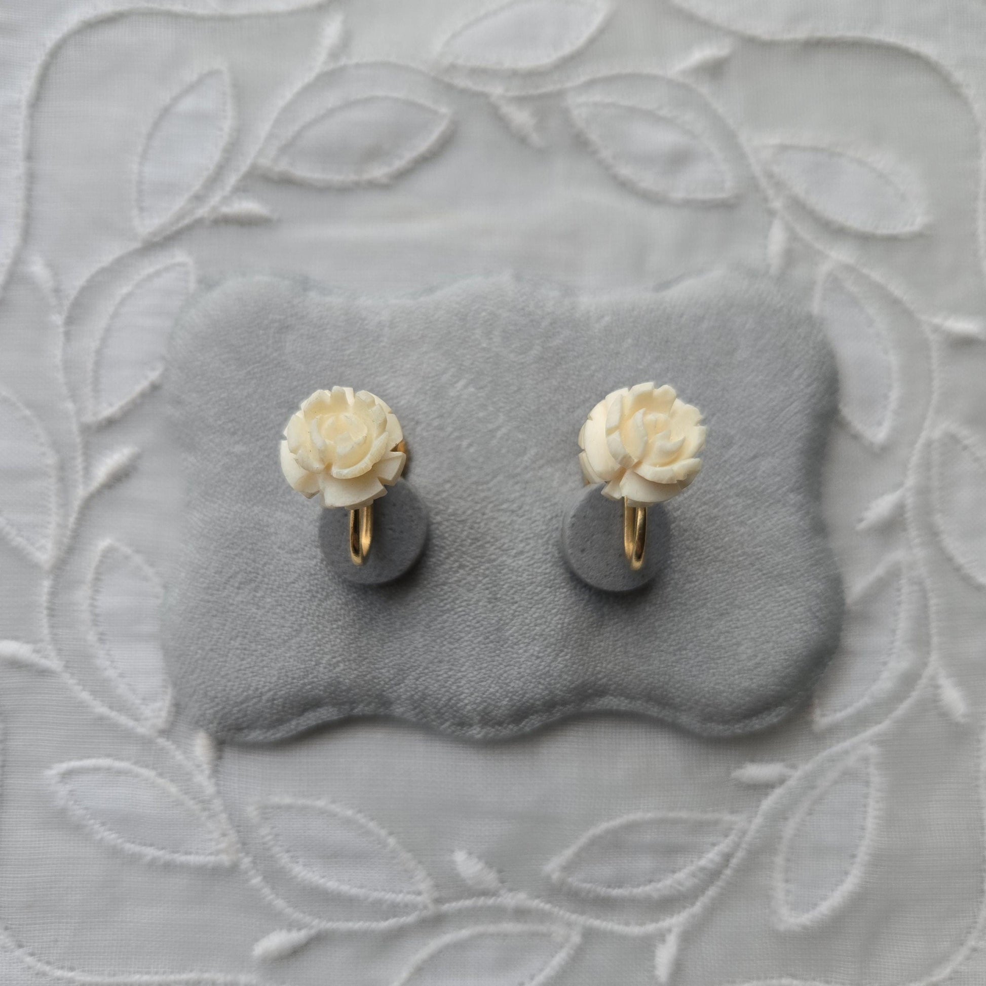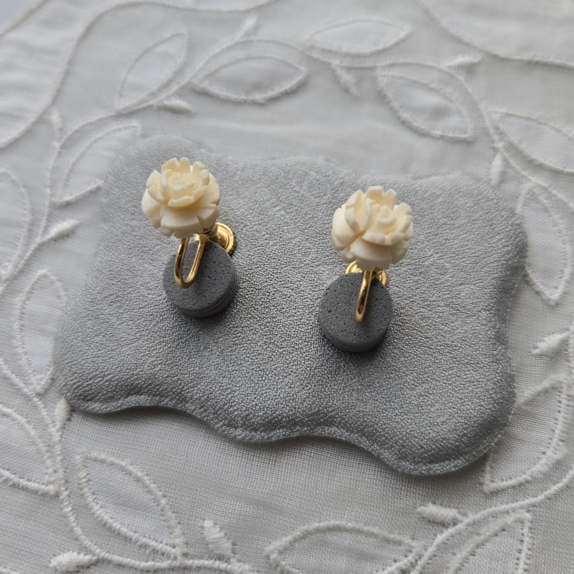 A sweet pair of rose clip on earrings accented with carved bone on gold plated metal
