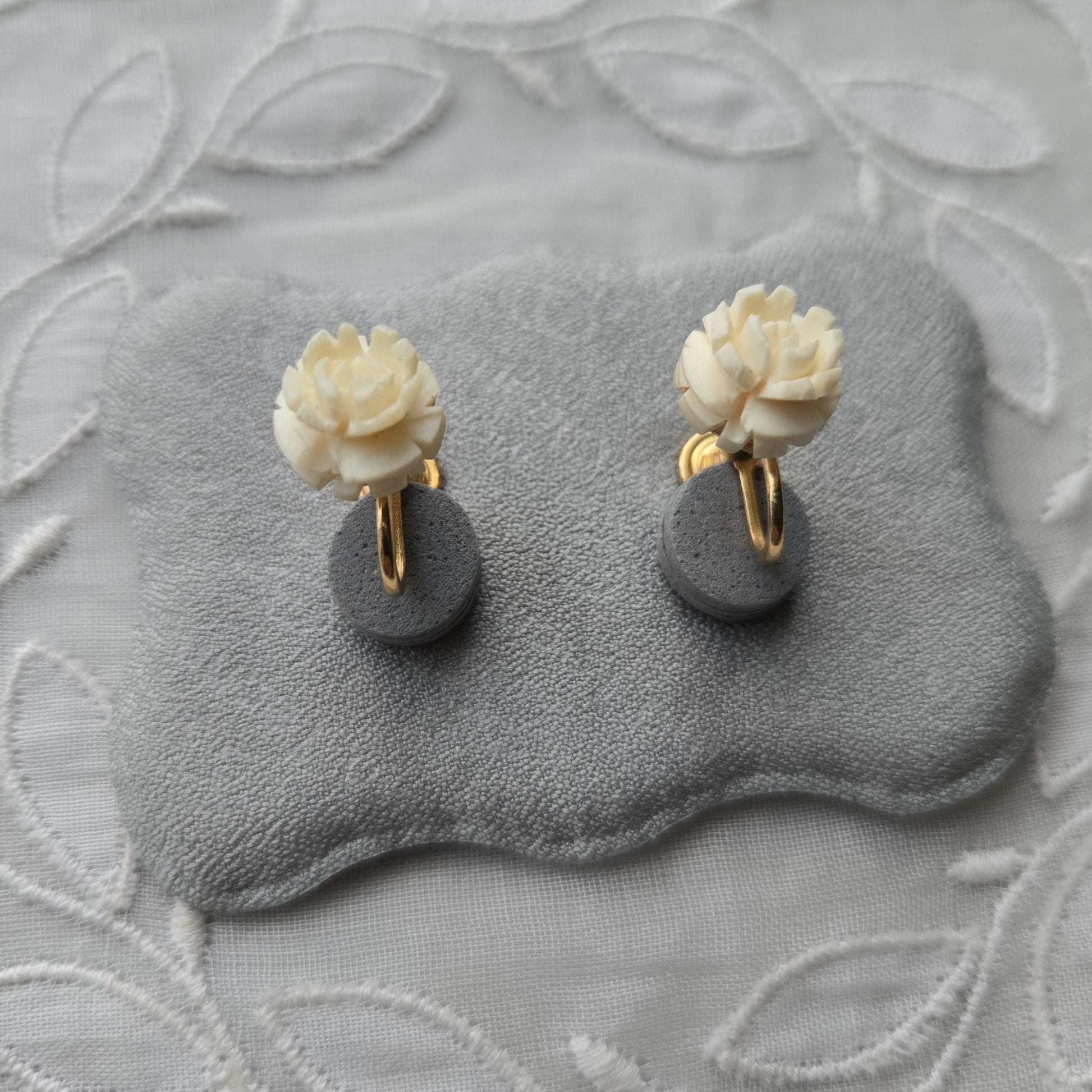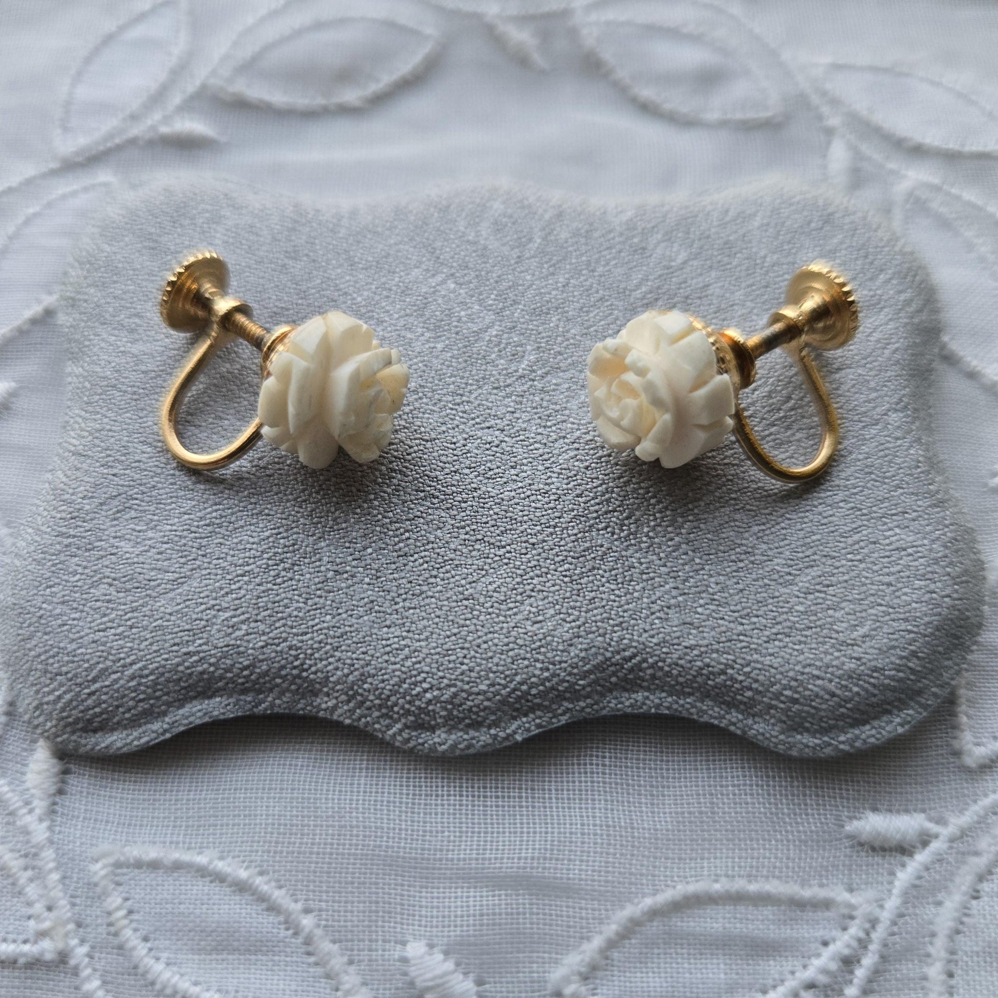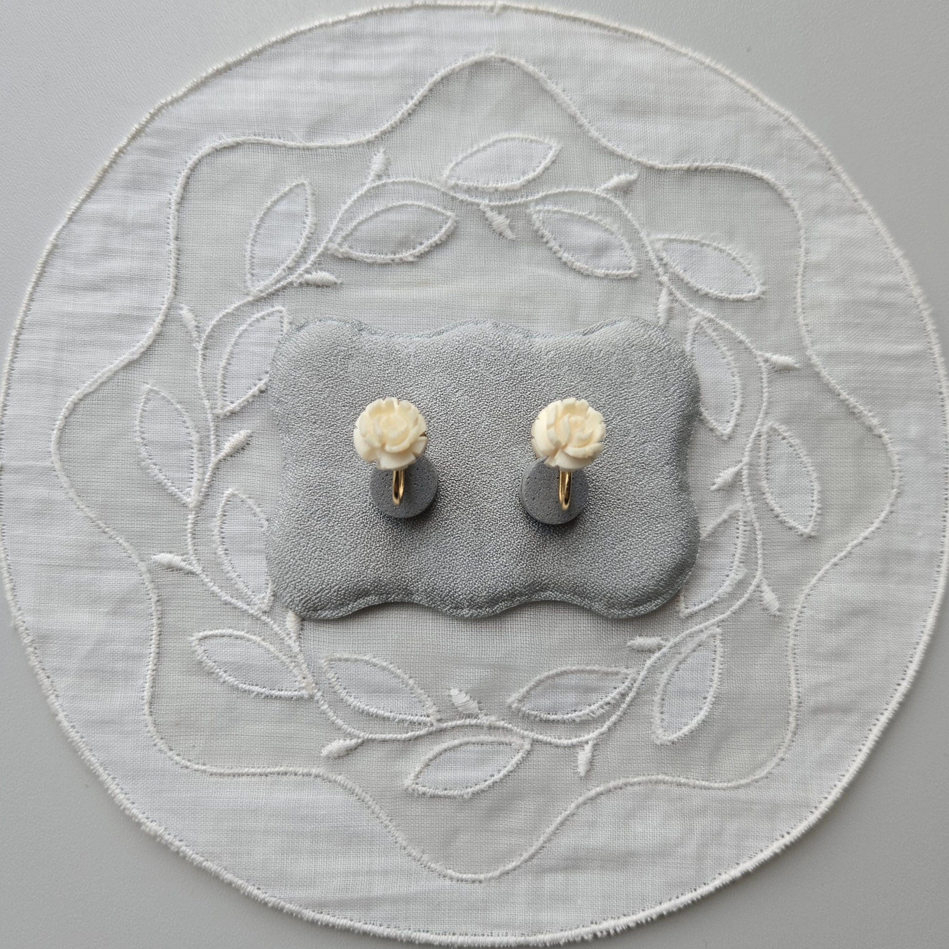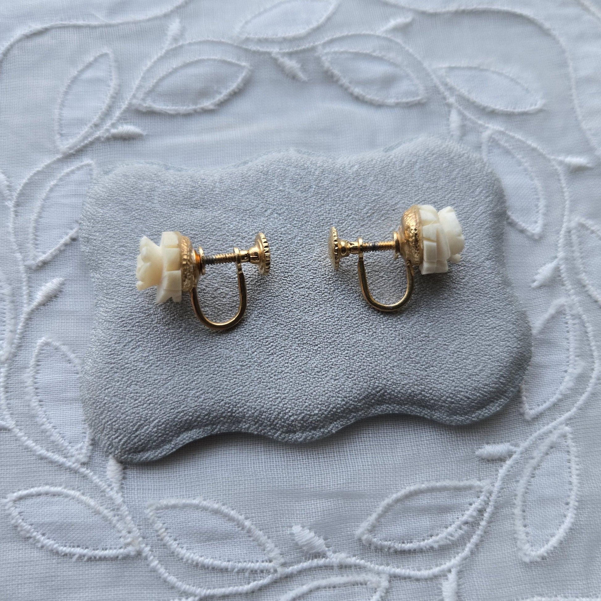 A sweet pair of rose clip on earrings accented with carved bone on gold plated metal