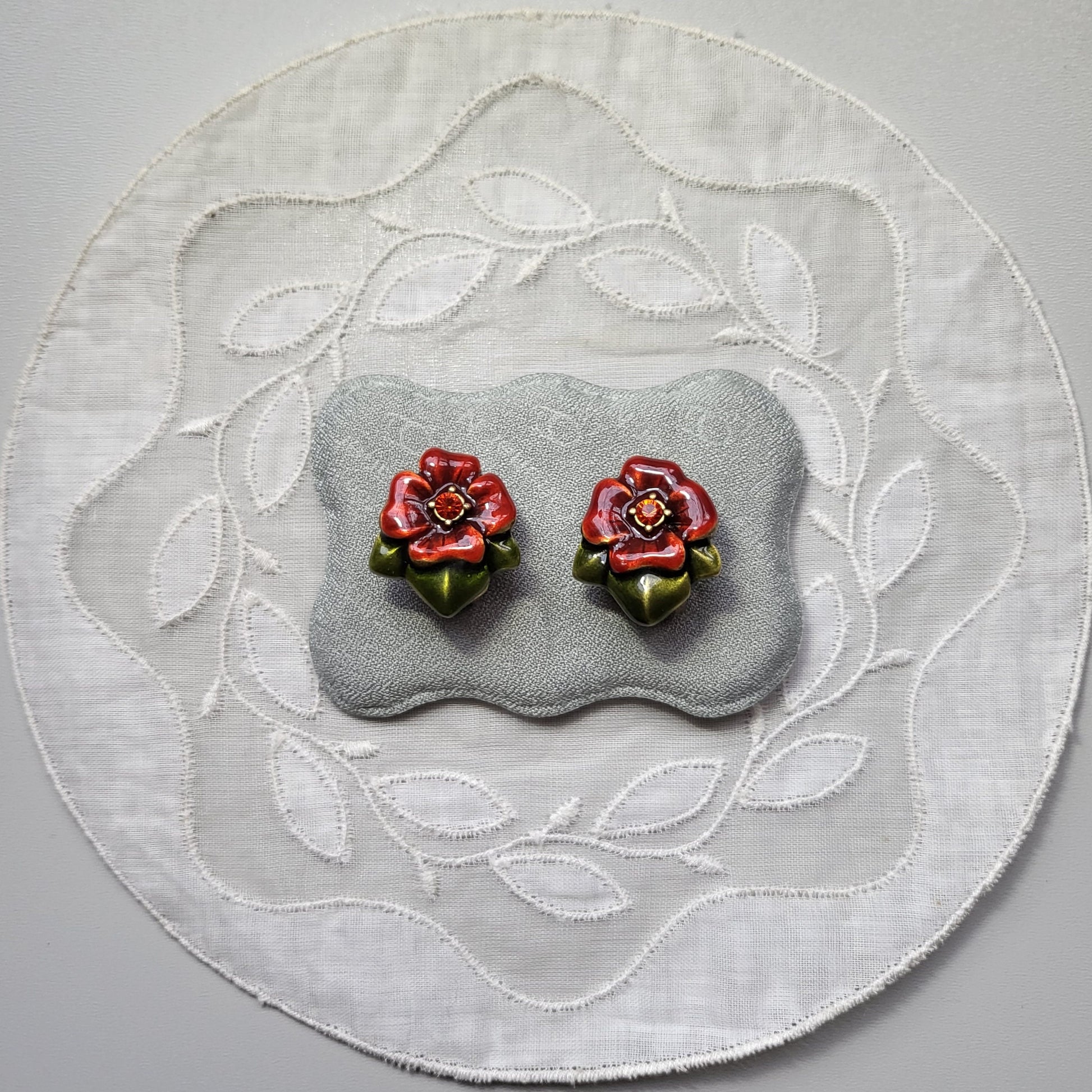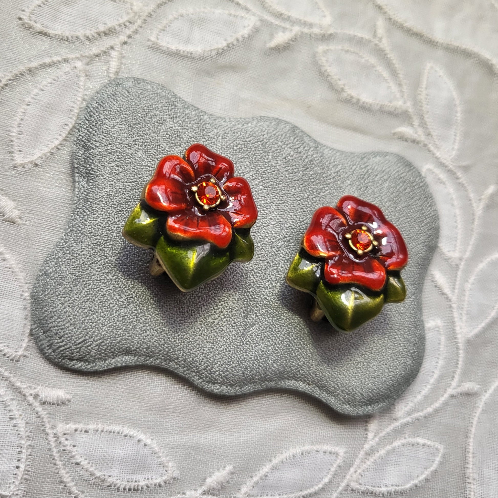 Clip on - Chico's Red and Green Enamel Flower Clip On Earrings