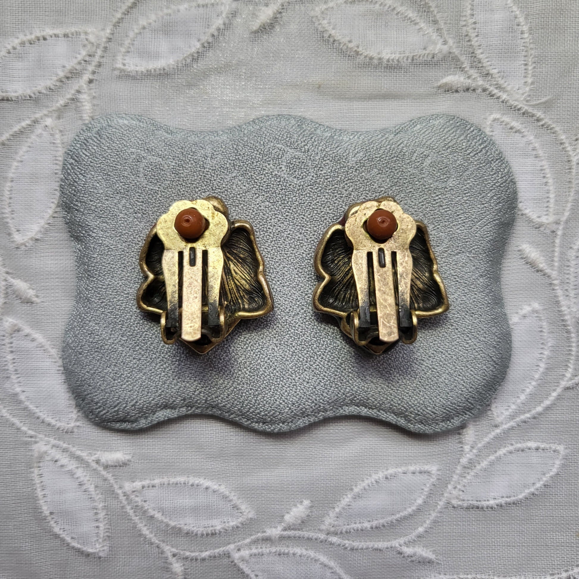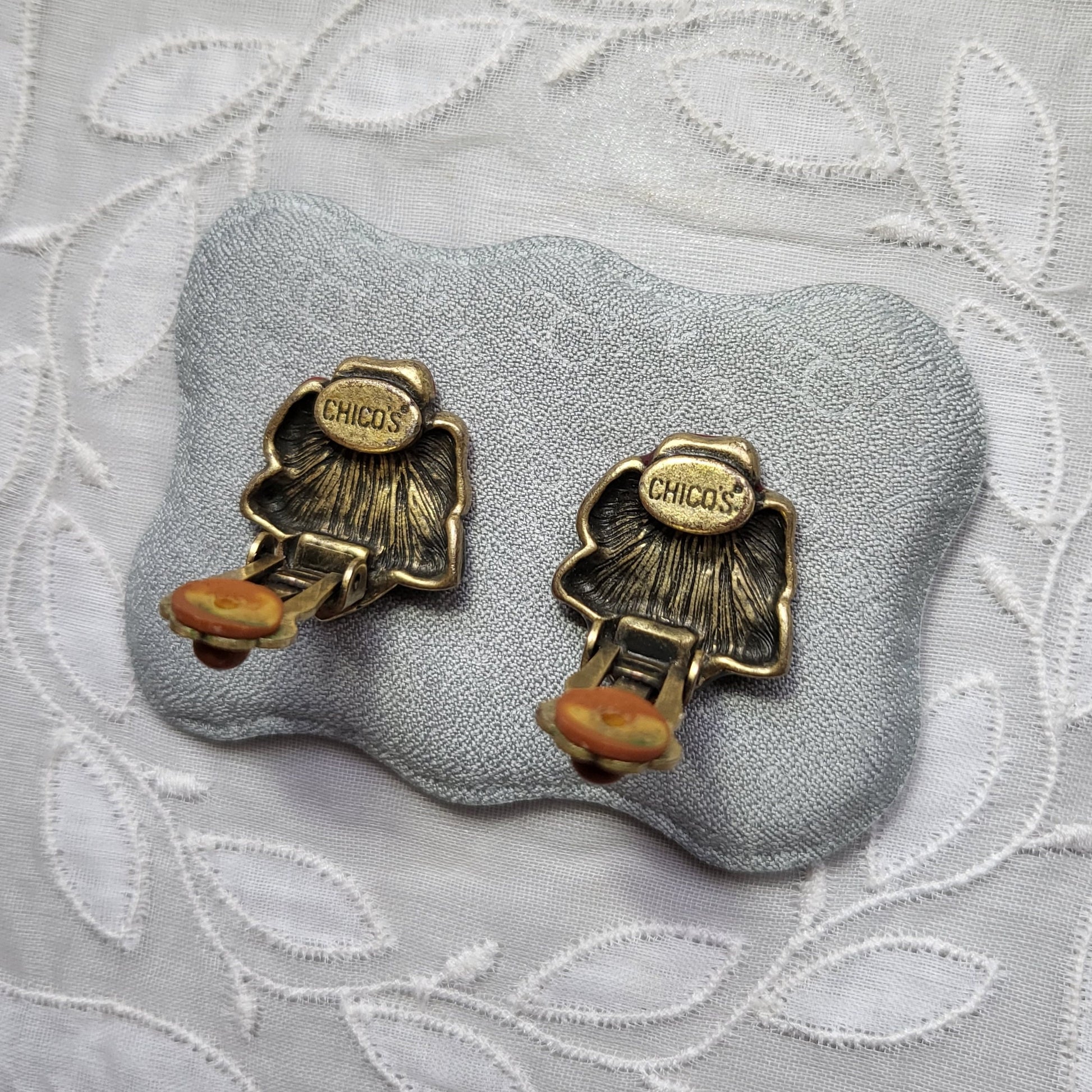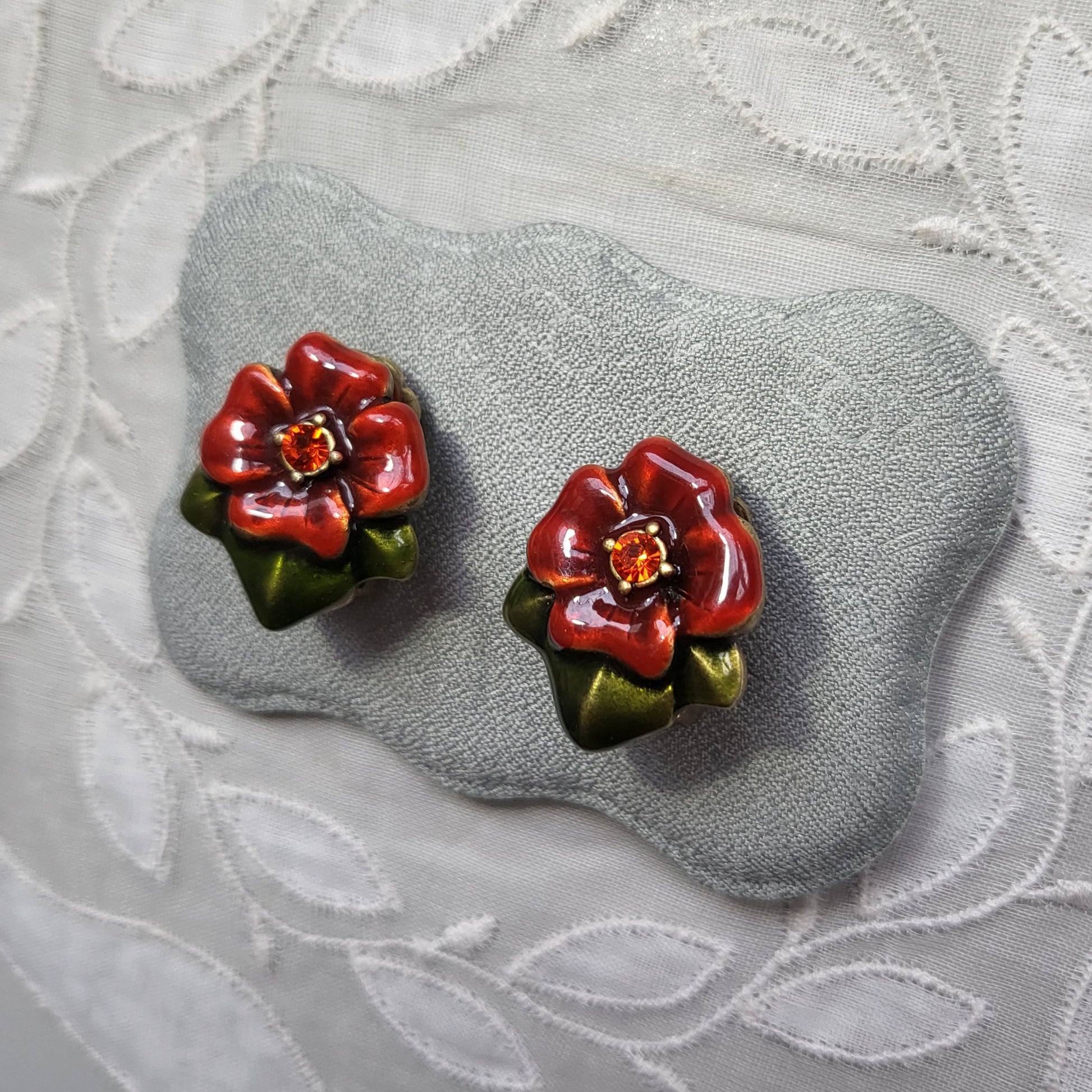 A sweet pair of flower clip on earrings by Chico's with red and green enamel flower accented with orange crystal in red gold tone plated metal