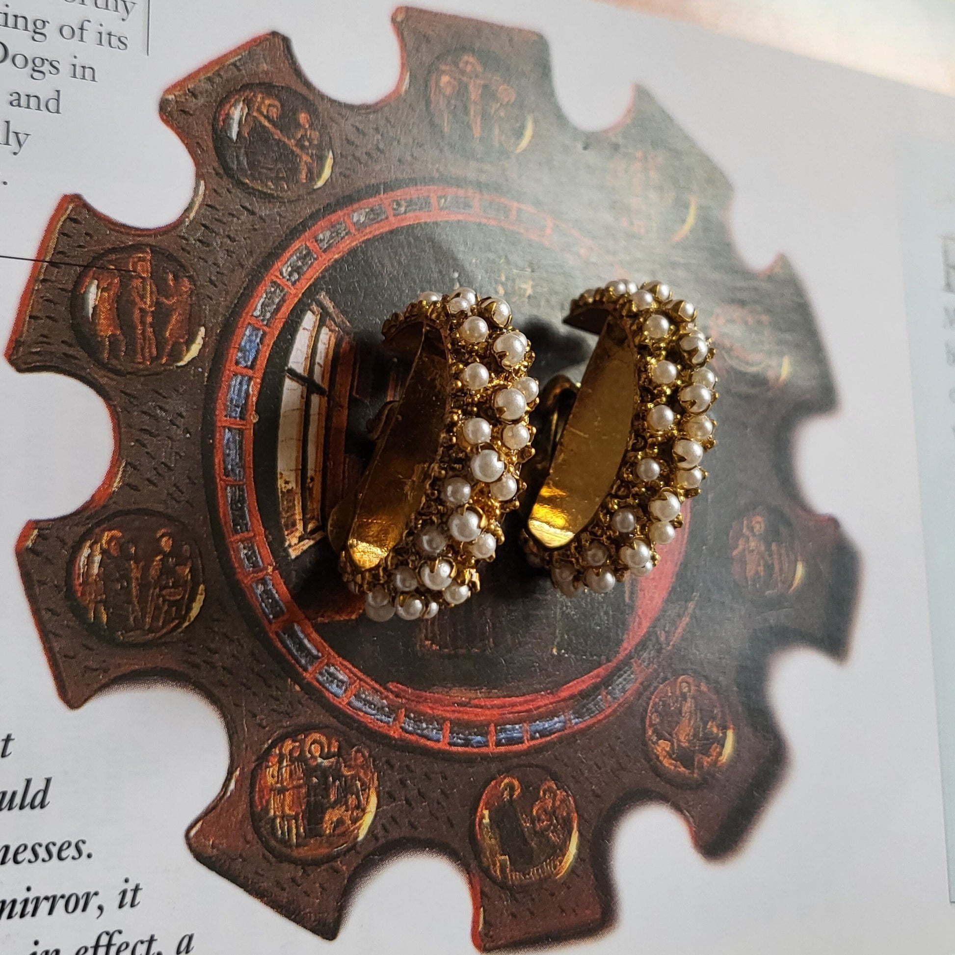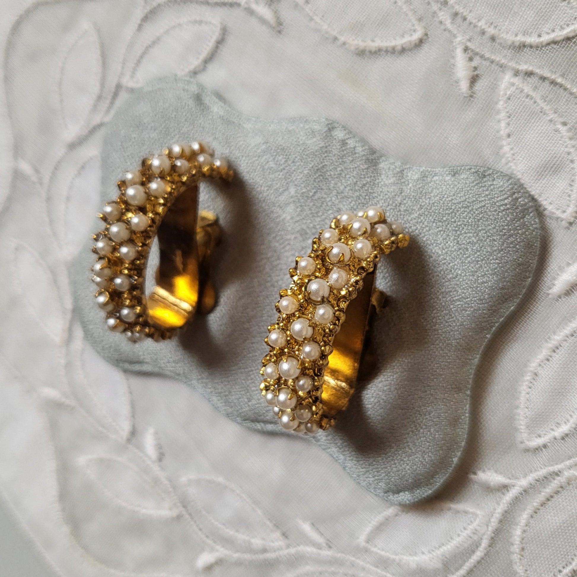 A bold pair of half hoop earrings encrusted in seed pearls set in gold plated metal