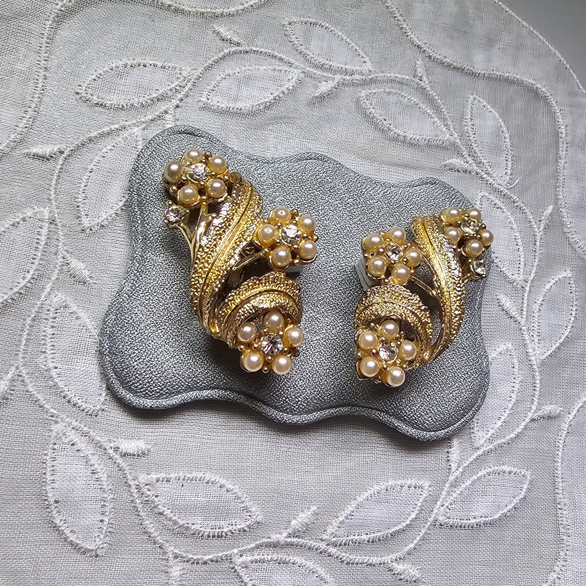 A lovely pair of flower earrings by Coro with faux pearls and clear crystals set on gold plated metal