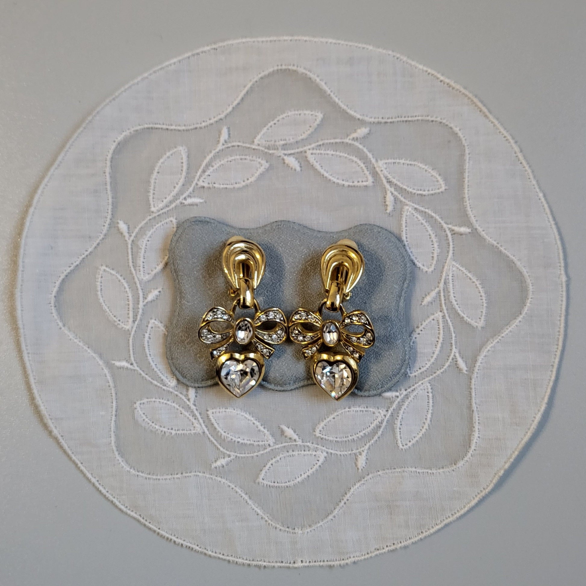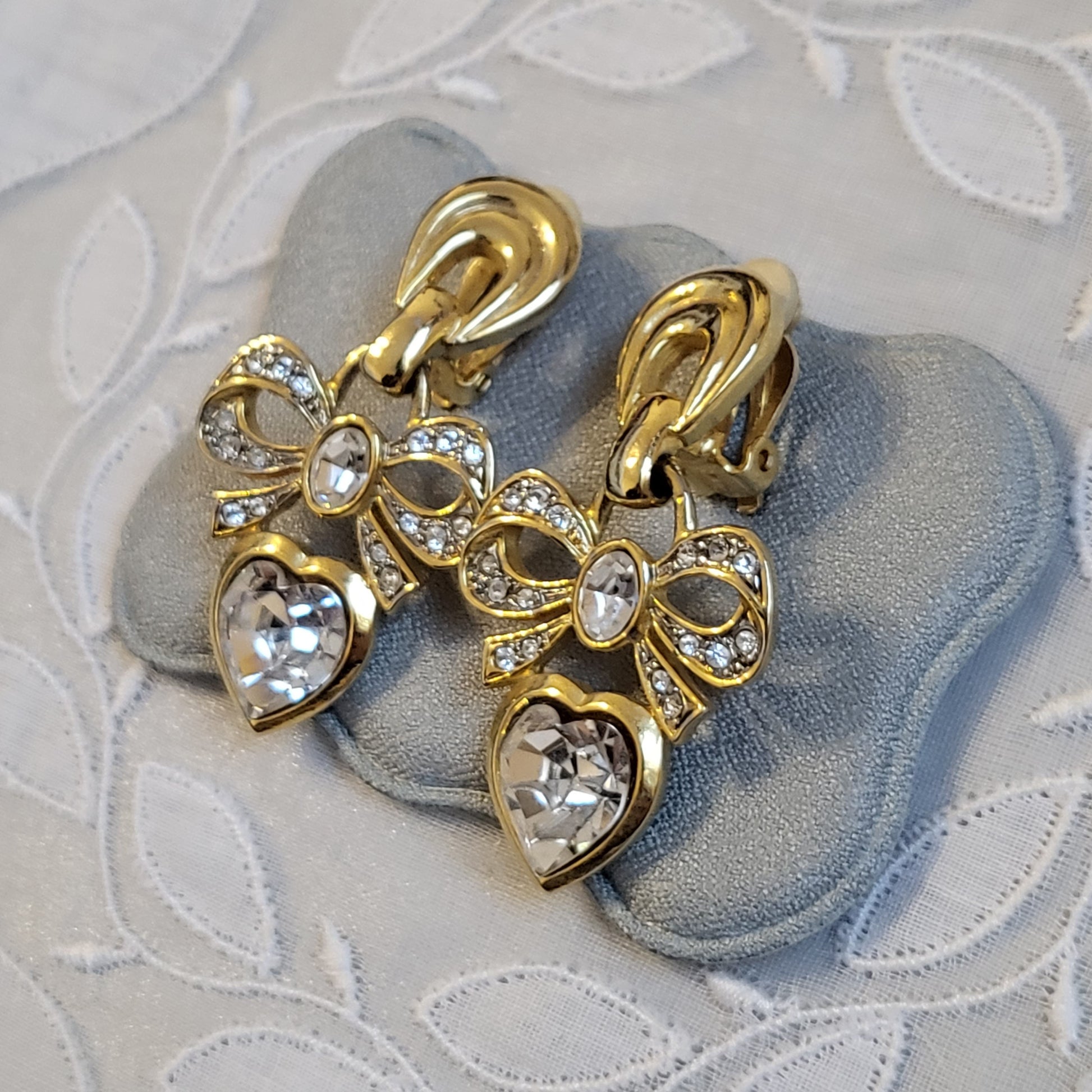 Clip on - Crystal Bow and Heart Drops Statement Clip on Earrings