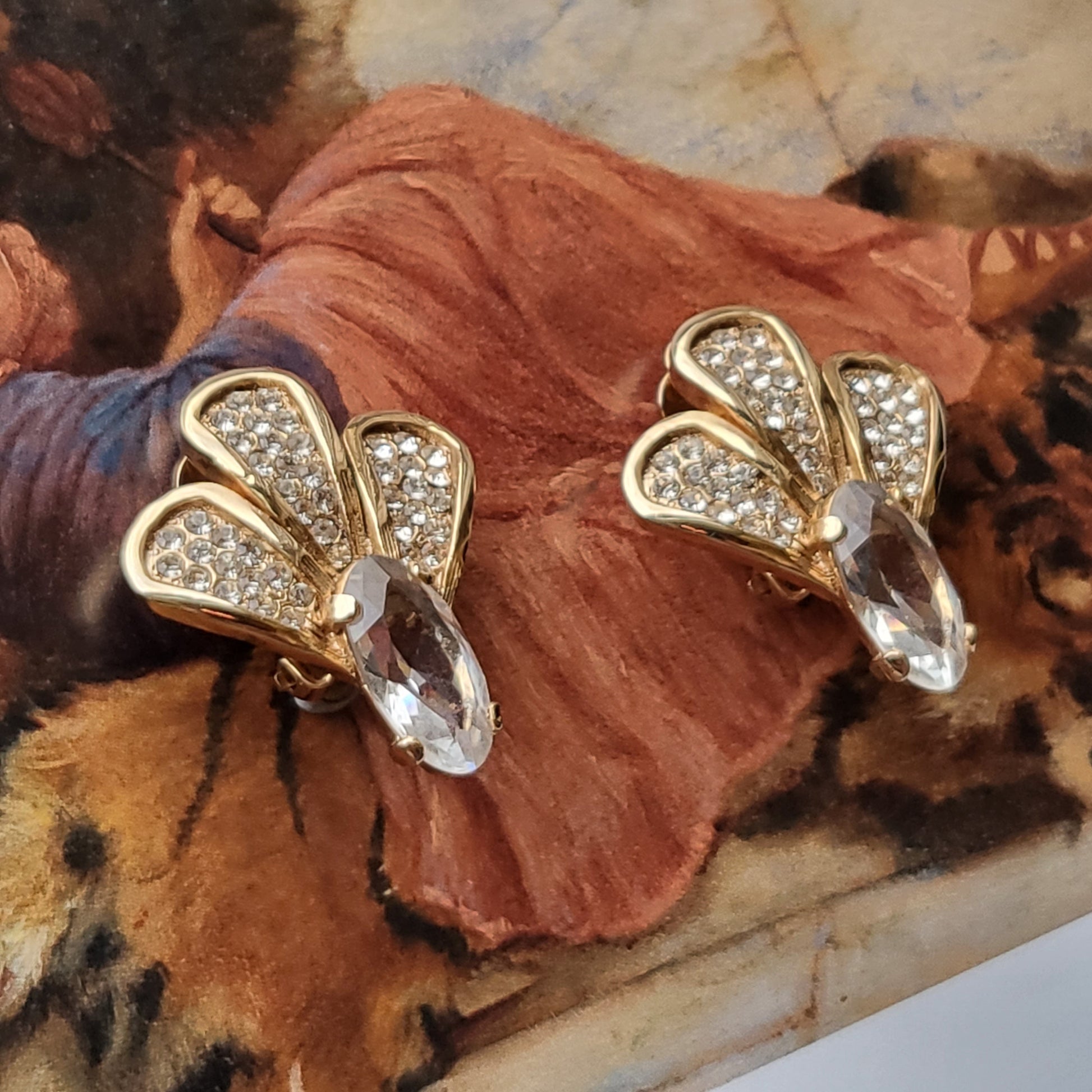 A stunning pair of statement clip on earrings in a shape of feathers/fan with clear crystals on gold plated metal