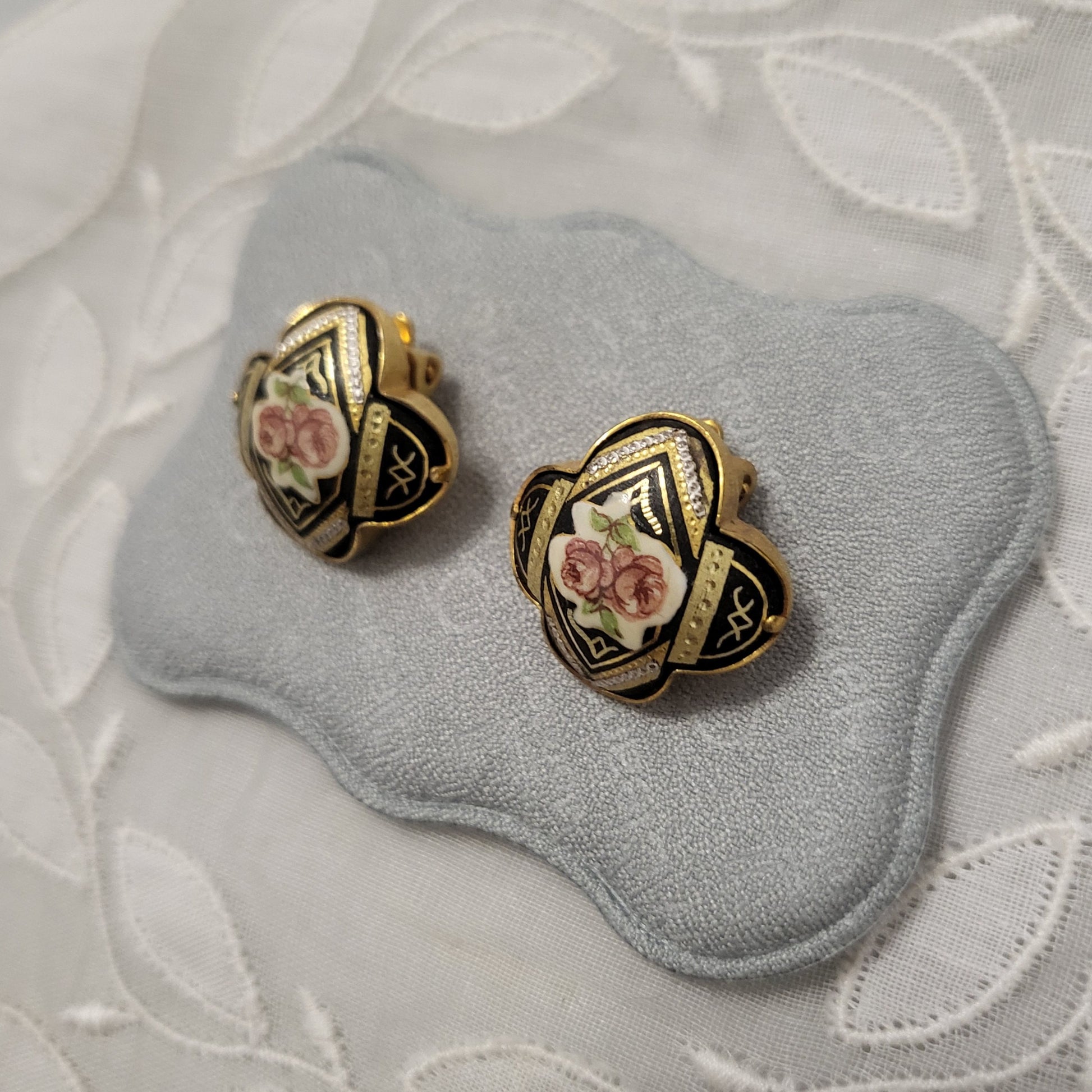 Vintage Spanish Toledo damascene clip on earrings with enamel rose painting set on gold plated metal