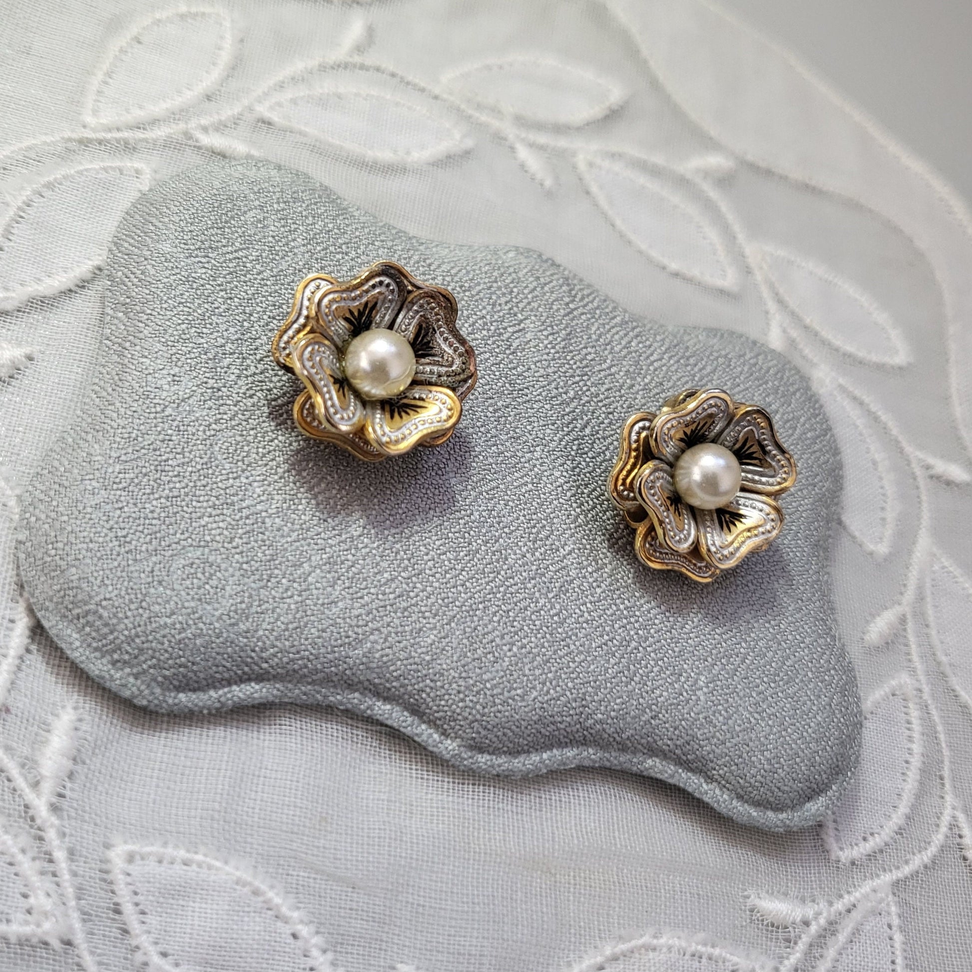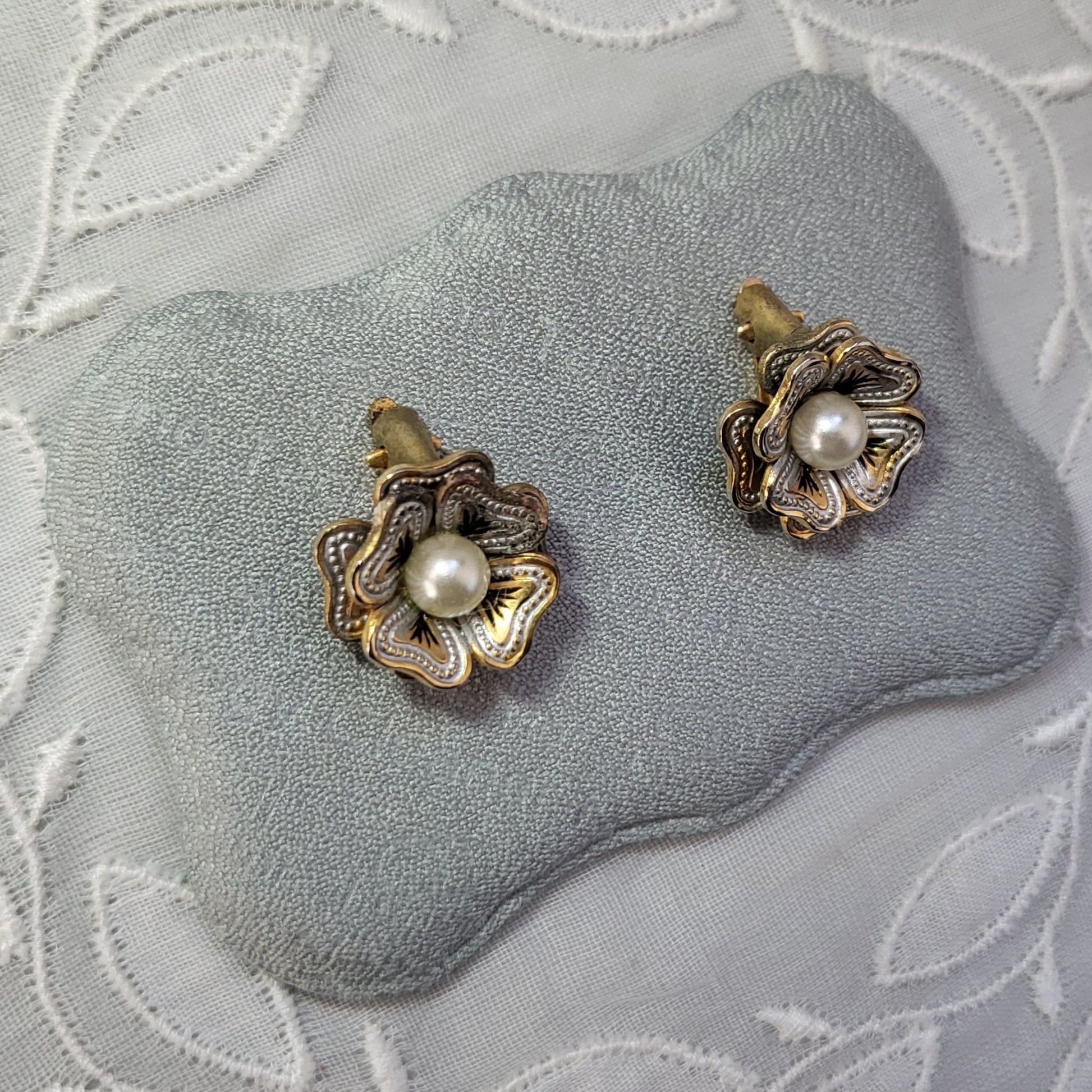 Clip on - Damascene Pearl Flower Clip On Earrings