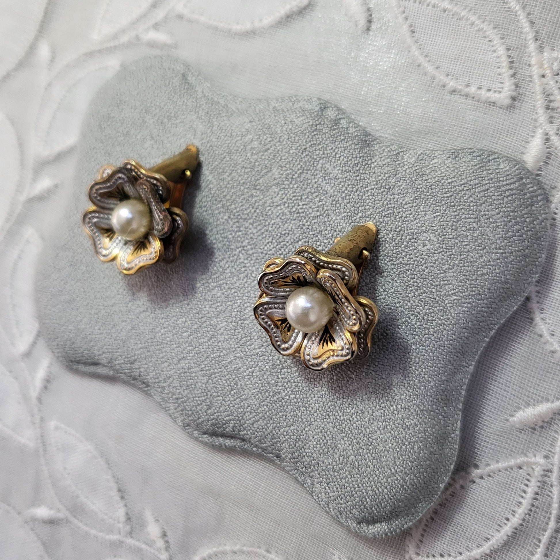 A small pair of damascene clip on earrings with enamel and faux pearl on gold plated metal