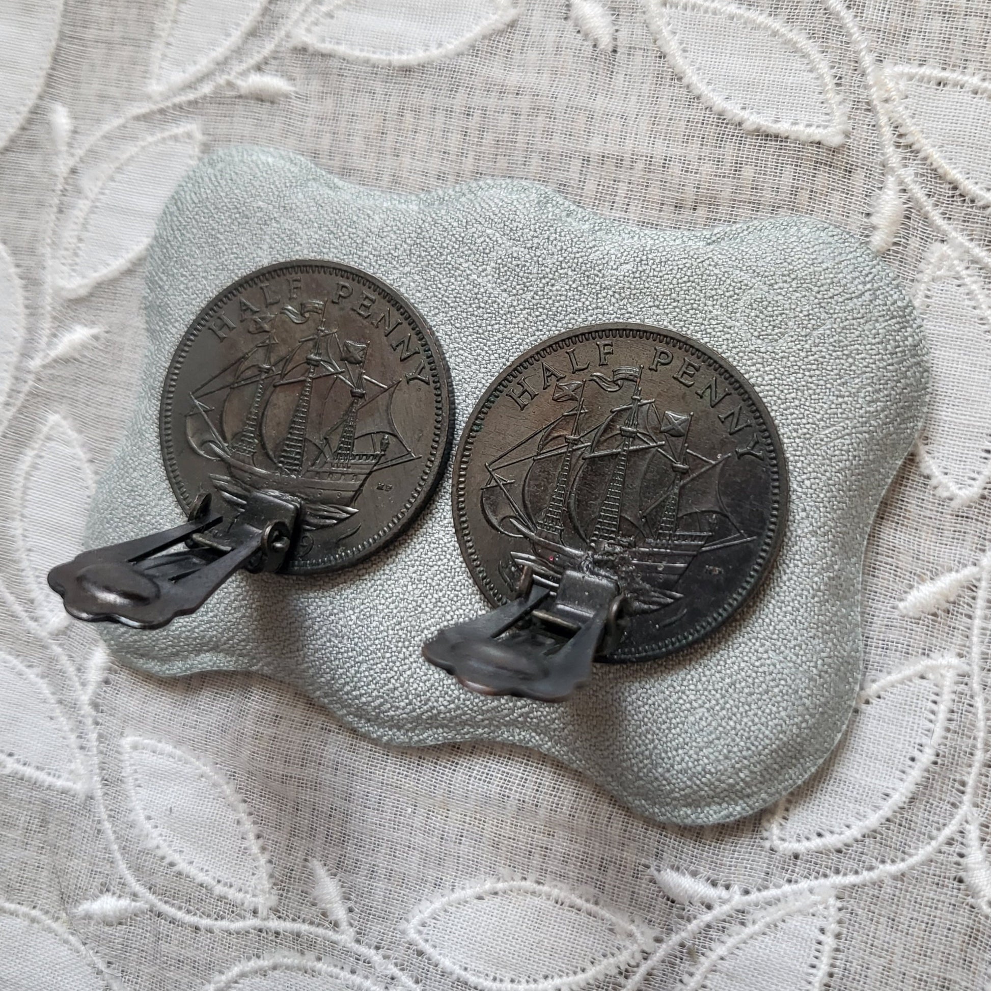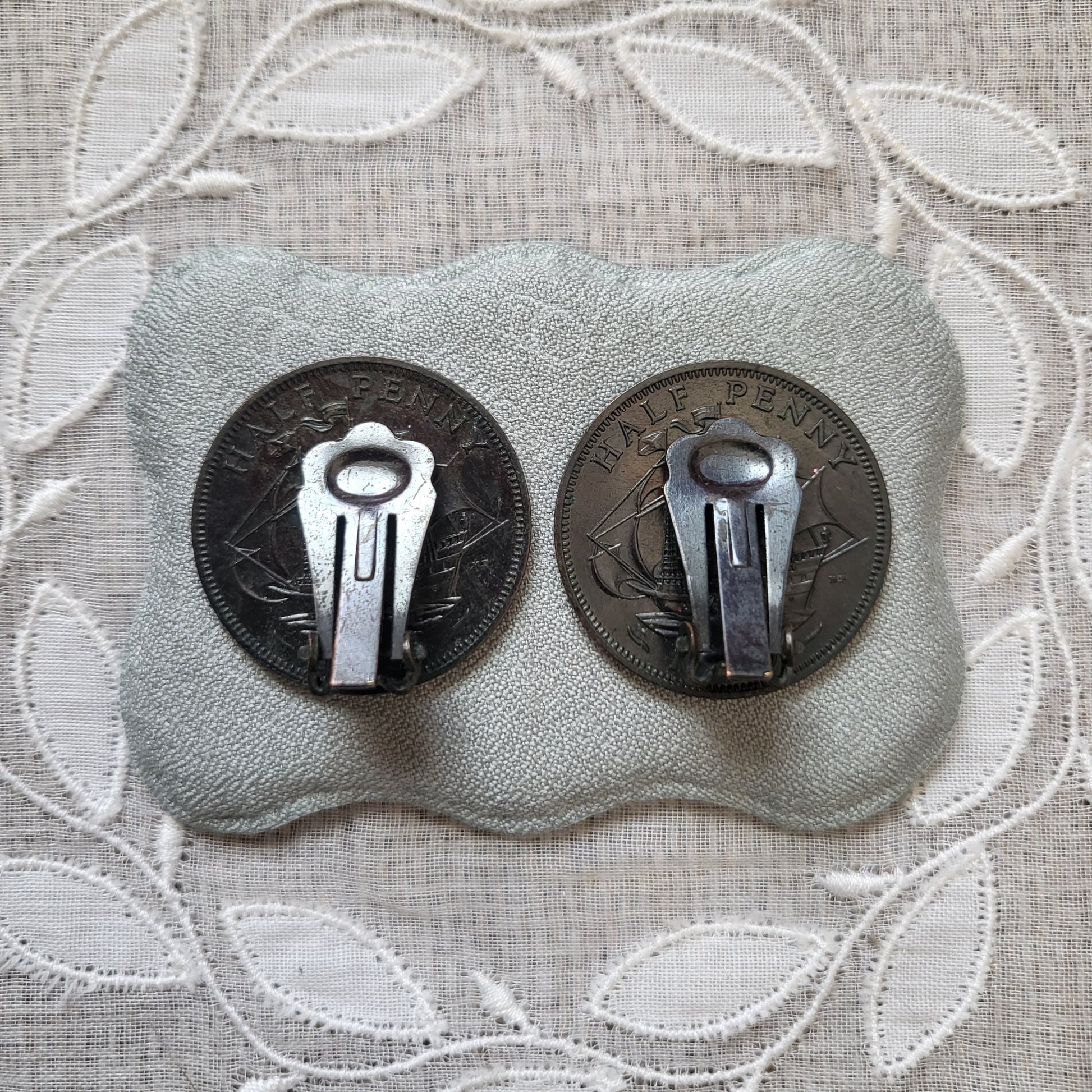 A great pair of coin clip on earrings with oxidised 1959 half penny coins