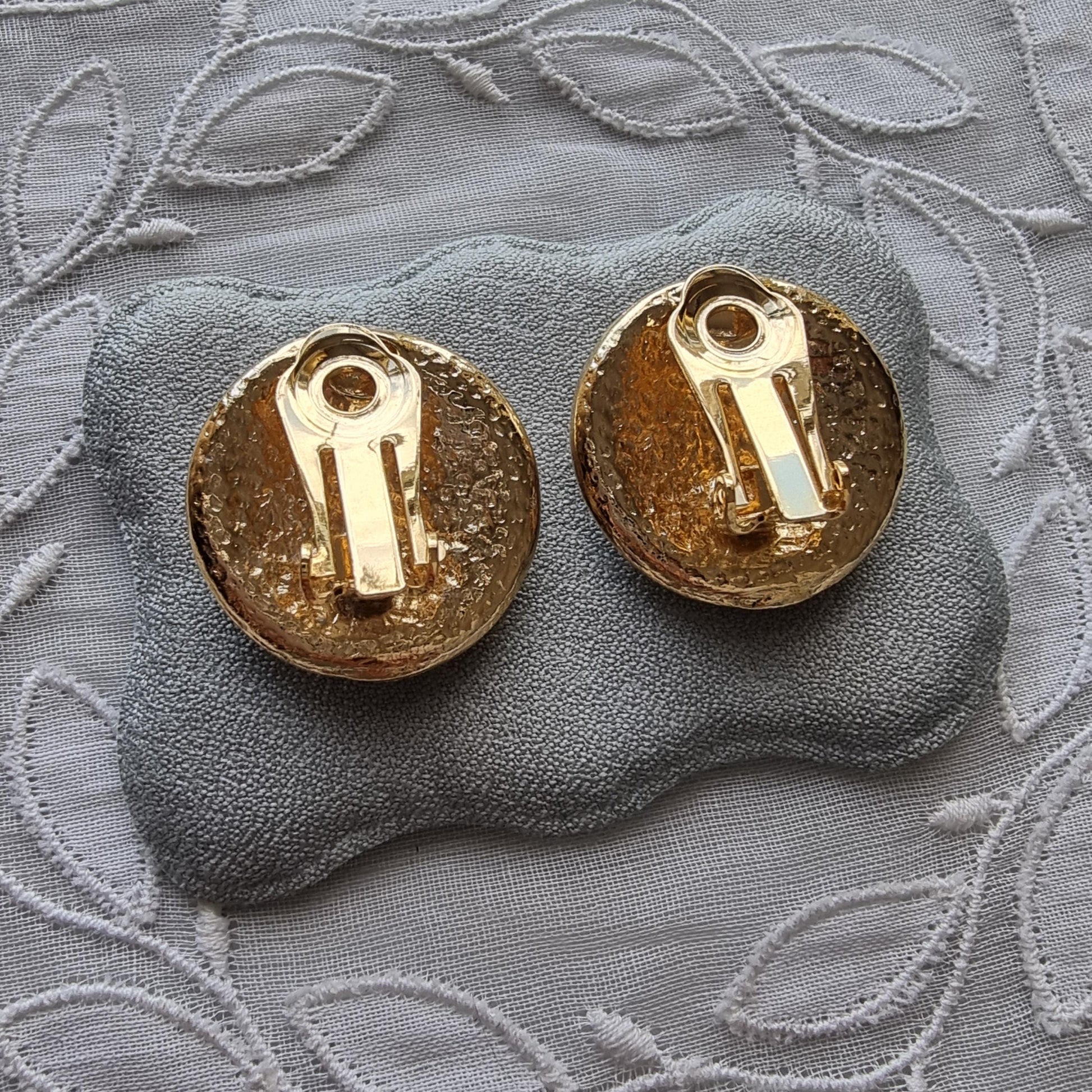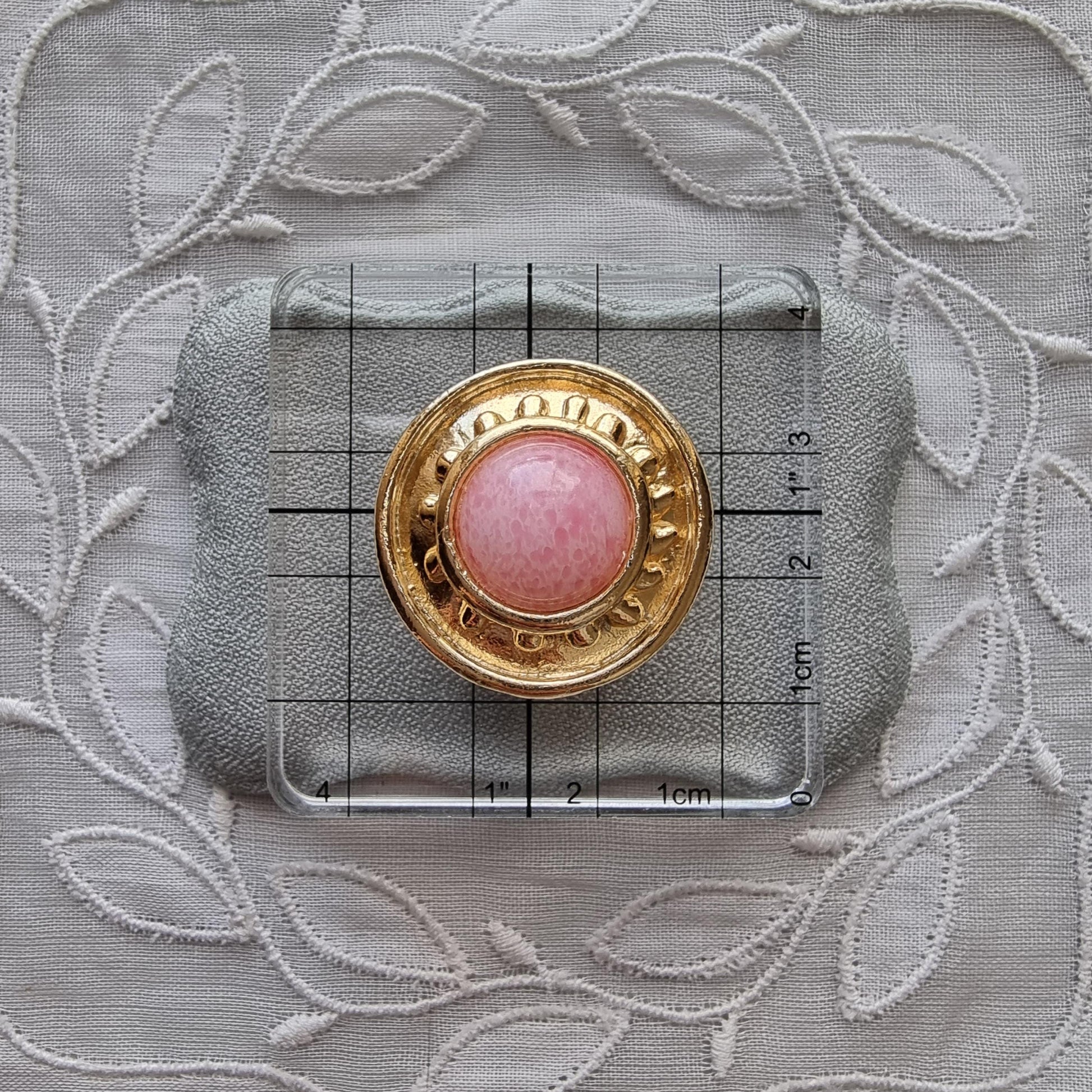 A stunning pair of etruscan style clip on earrings with beautiful speckled pink glass cabochon on gold plated metal