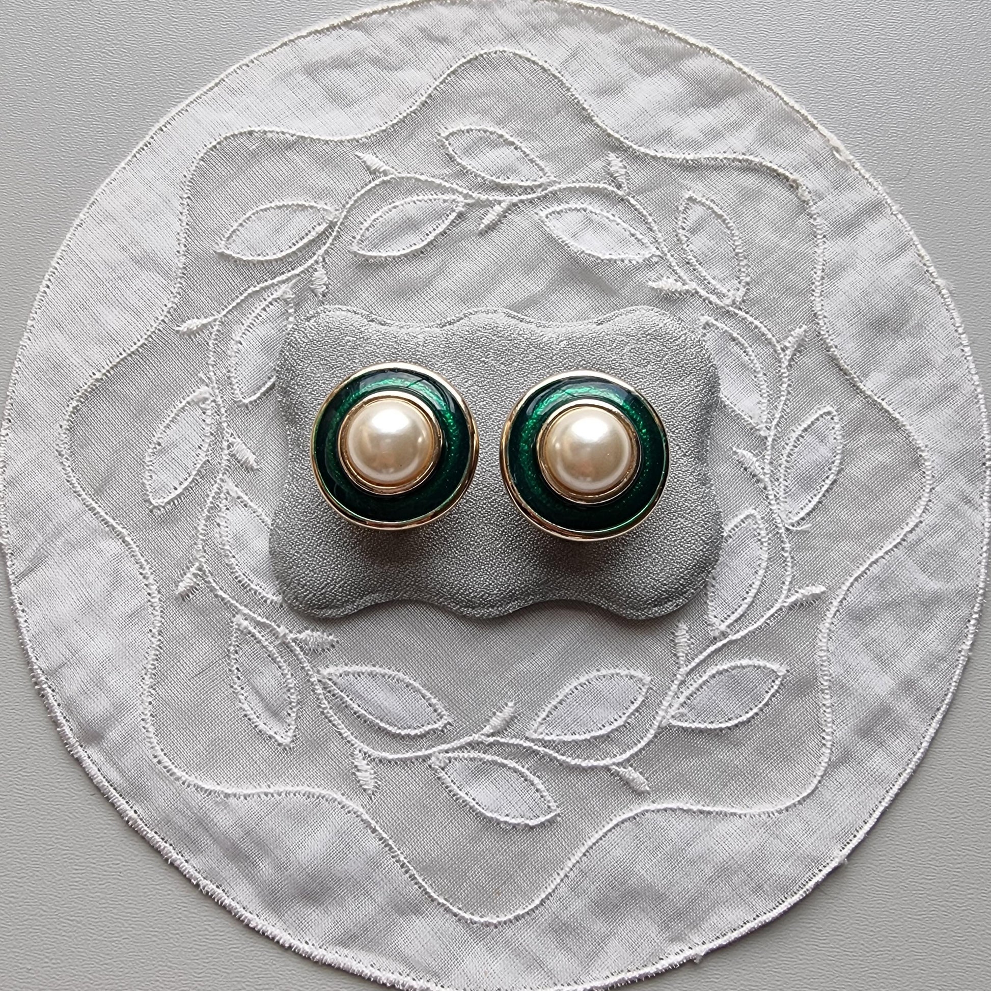 Gorgeous round clip on earrings with faux pearls and green enamel on gold plated metal