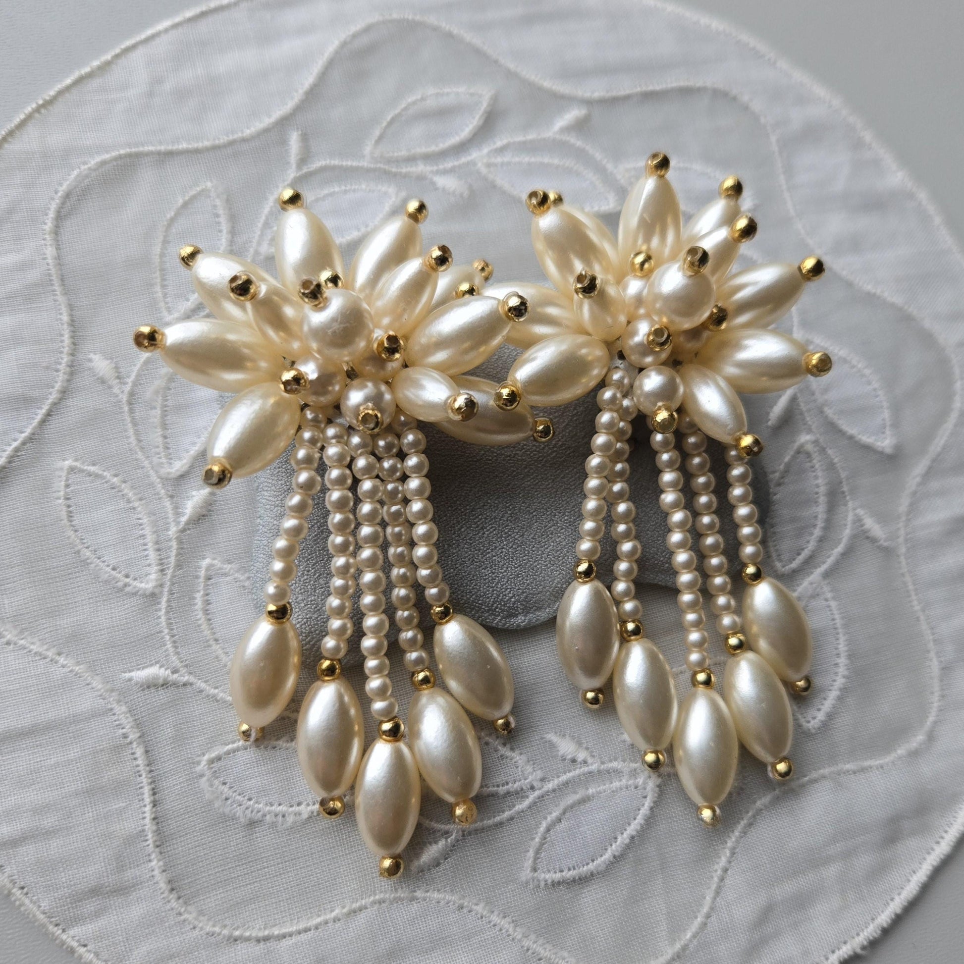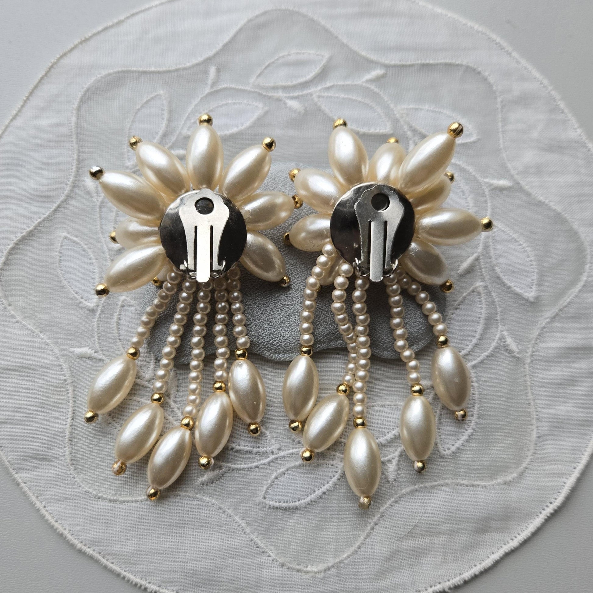A stunning pair of flower drop earrings with faux pearl and gold beads on silver tone metal