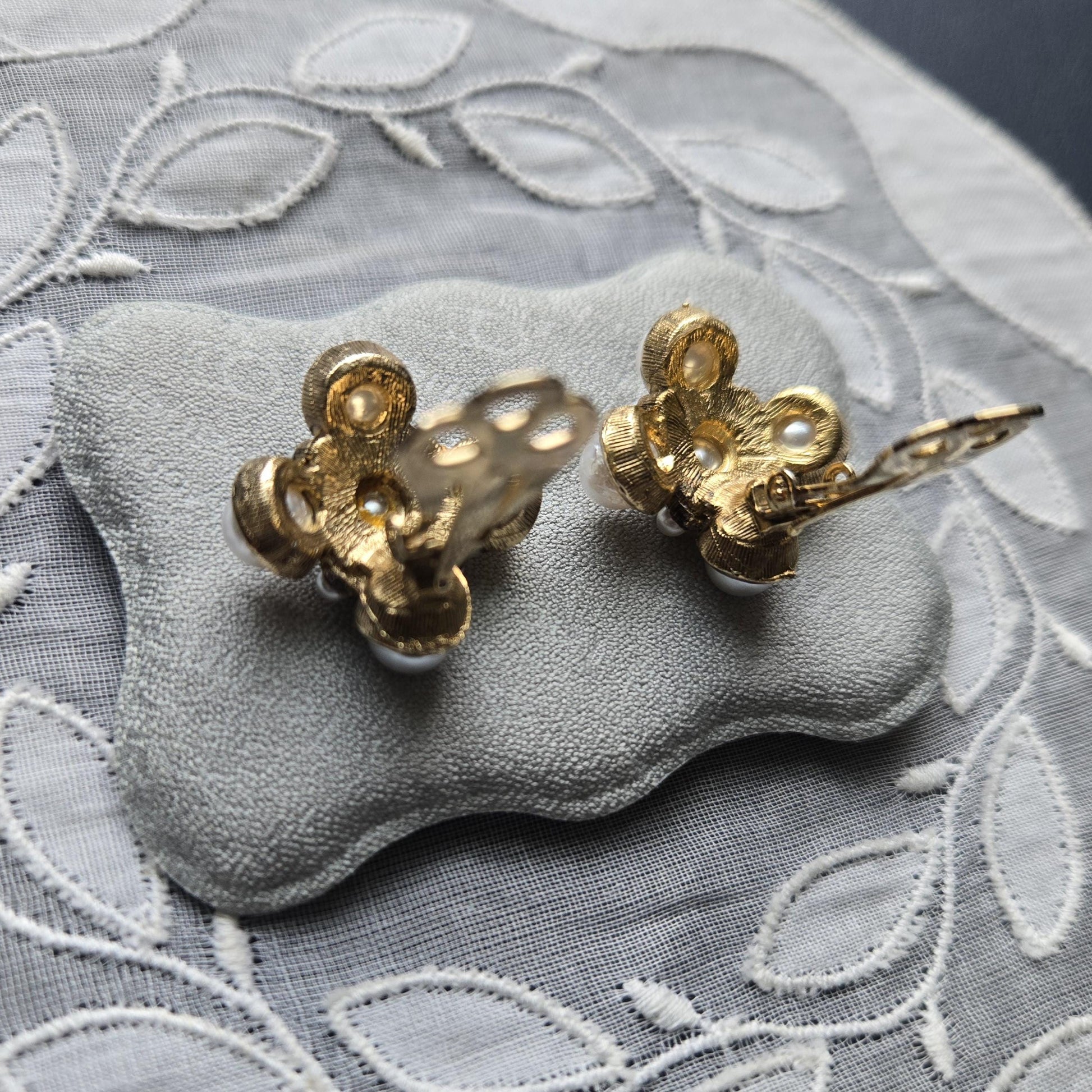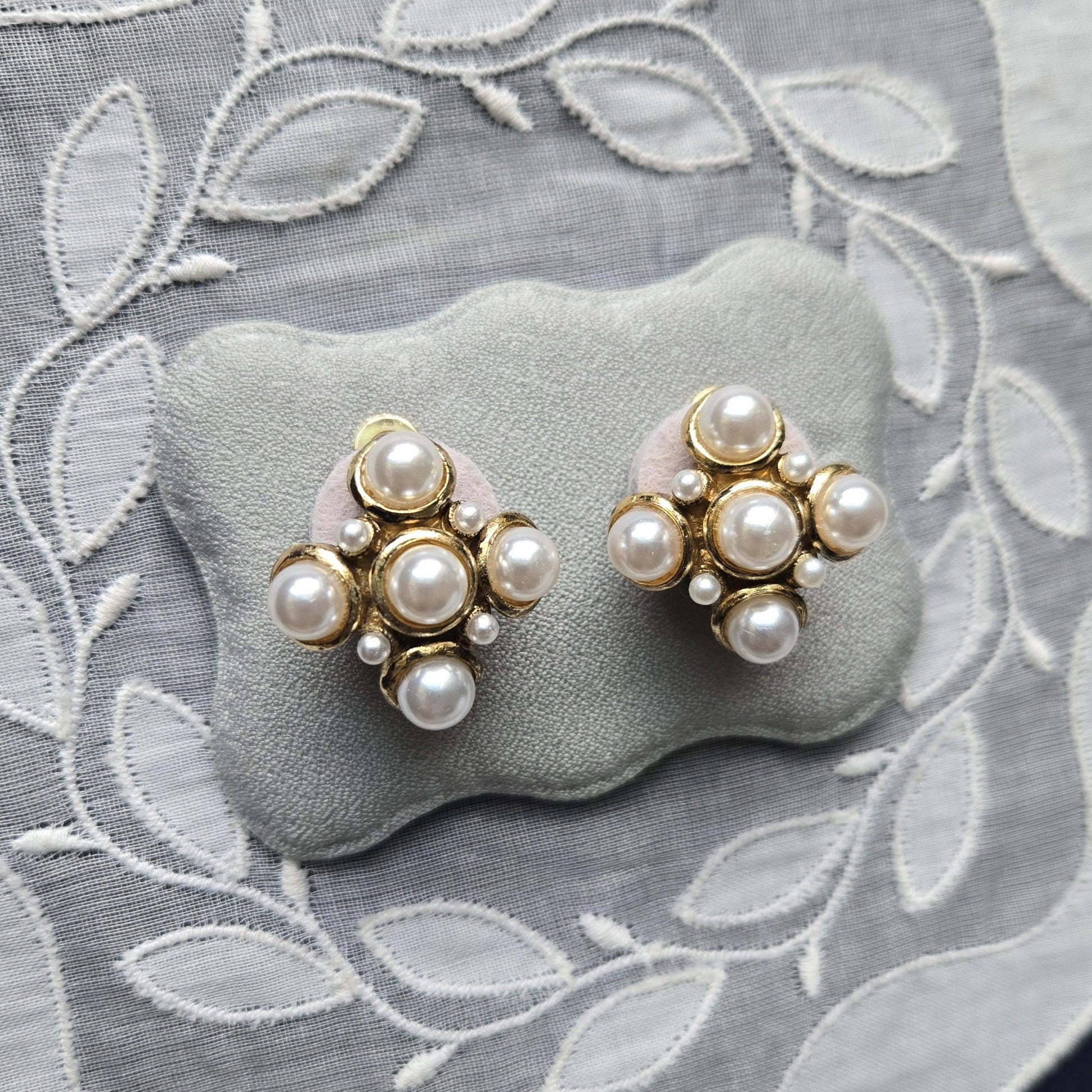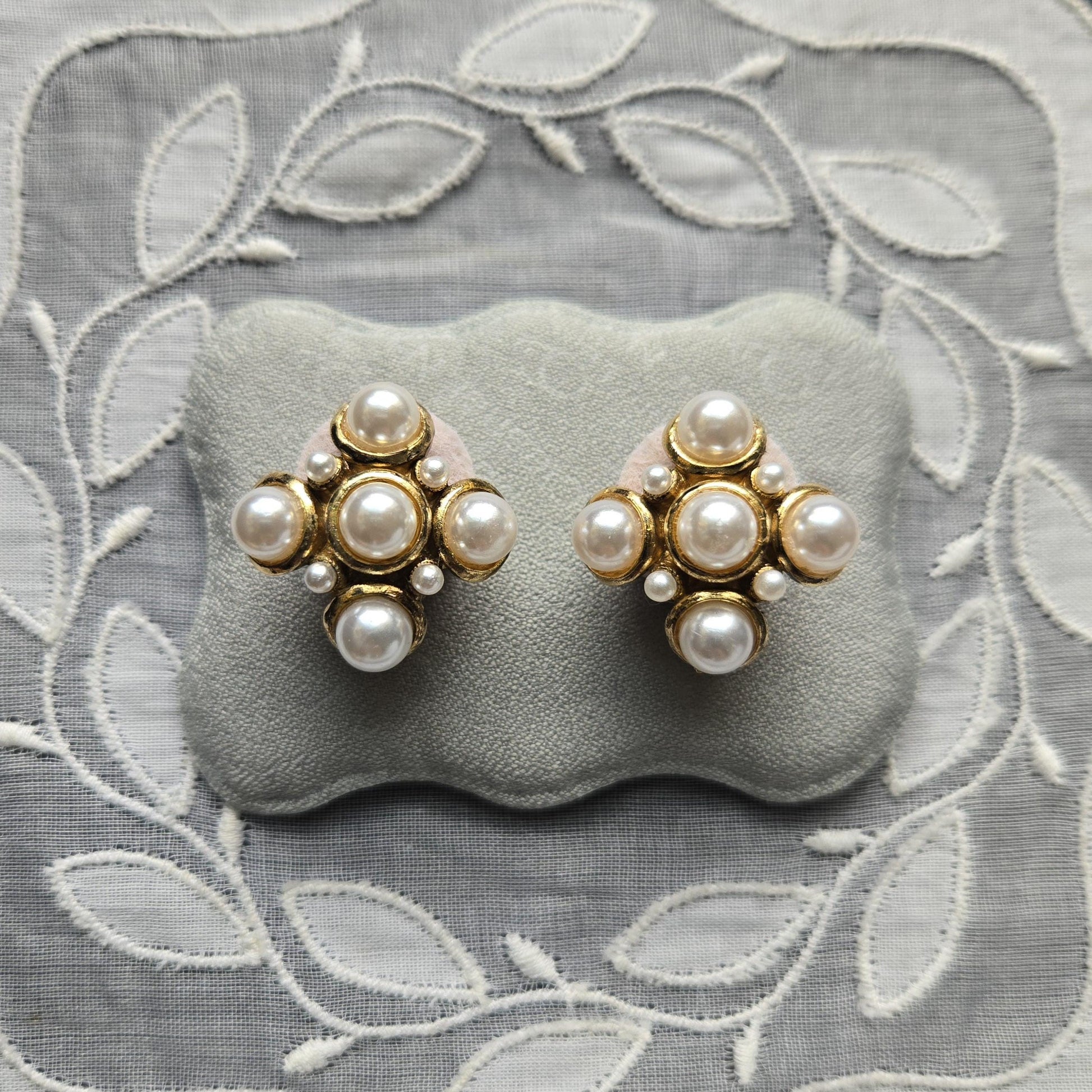 A gorgeous pair of clip on earrings with faux pearls arranged in Maltese cross style on gold plated metal