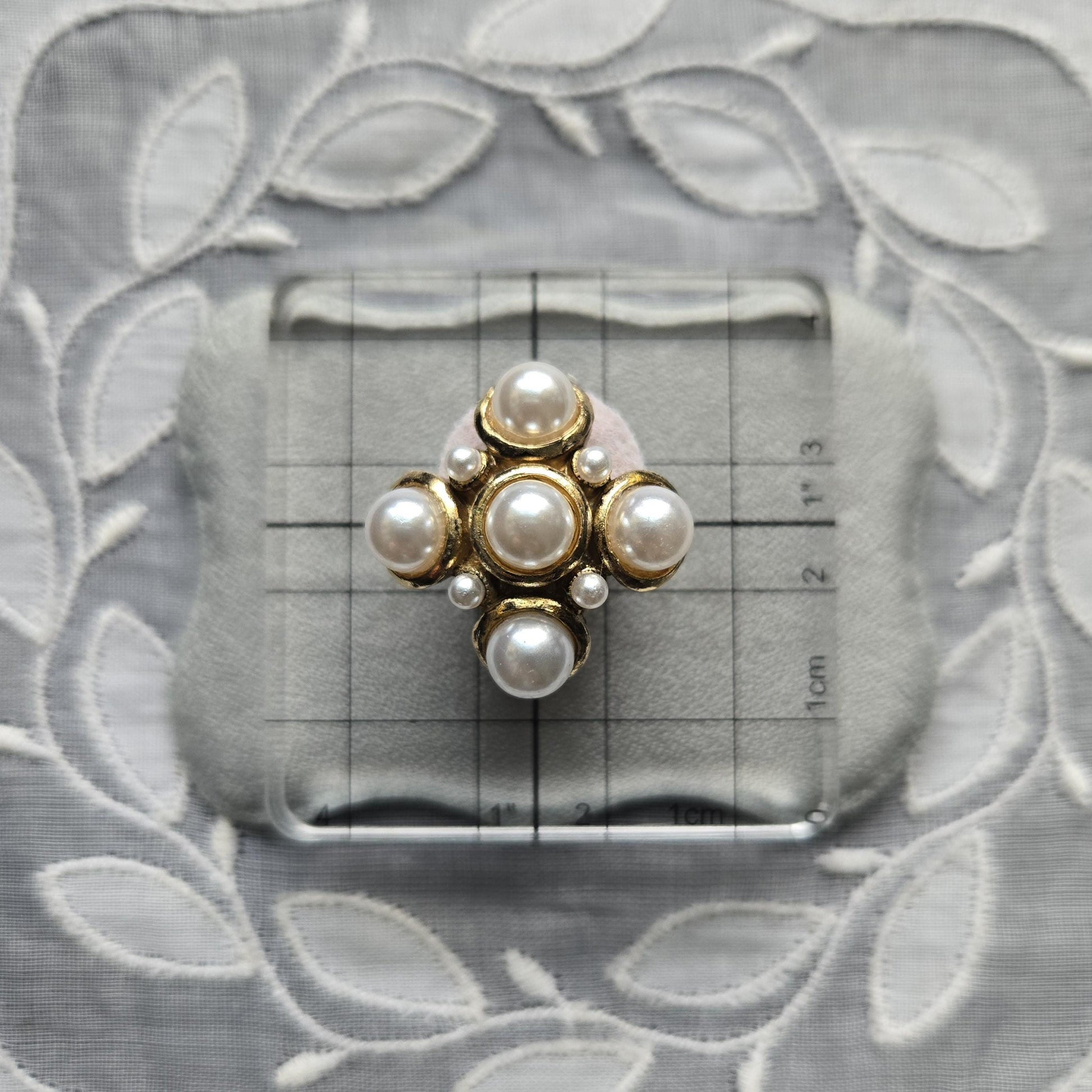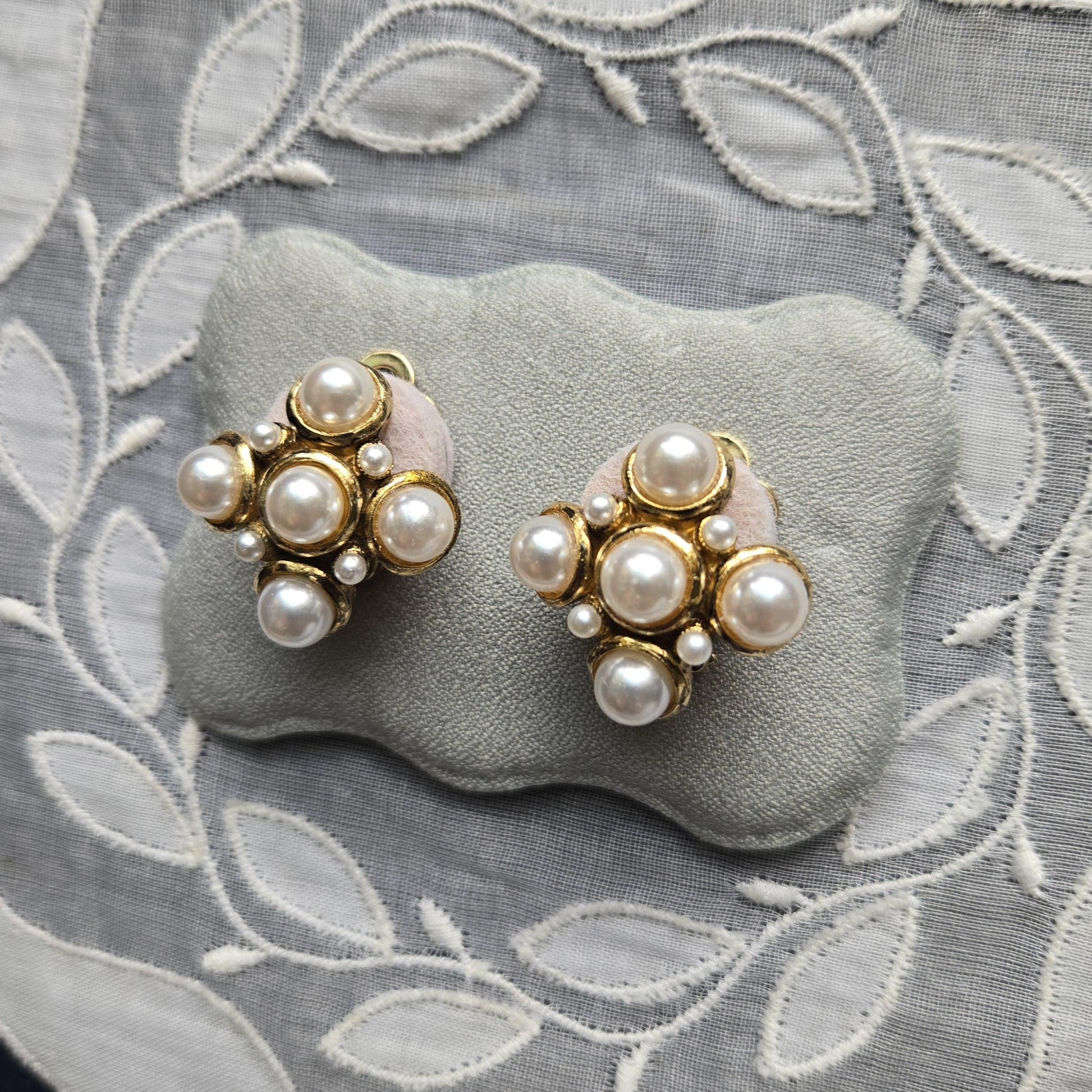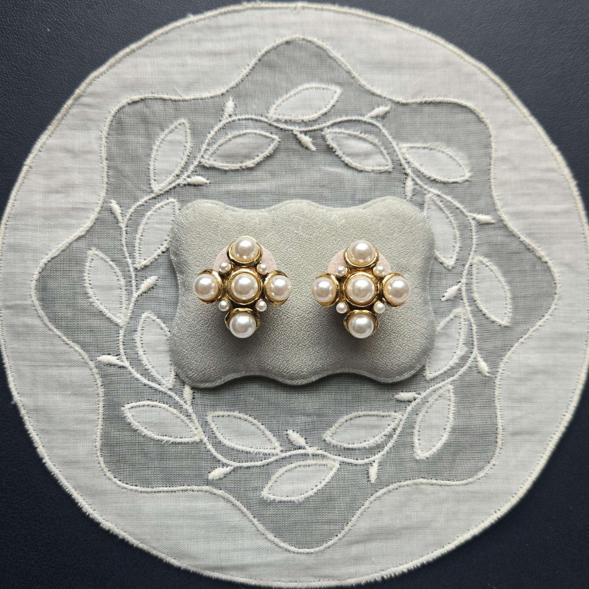 A gorgeous pair of clip on earrings with faux pearls arranged in Maltese cross style on gold plated metal