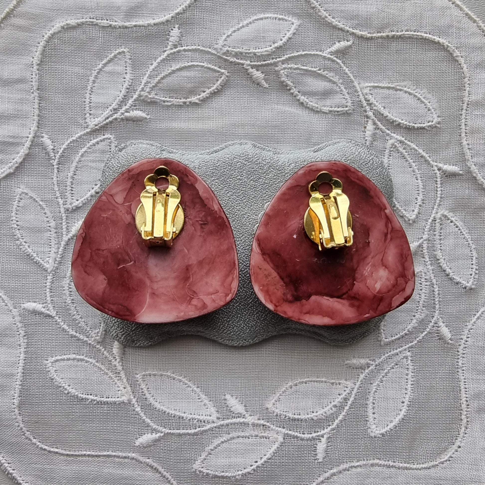A chic pair of vintage clip on earrings with burgundy red and gold acrylic on gold plated metal