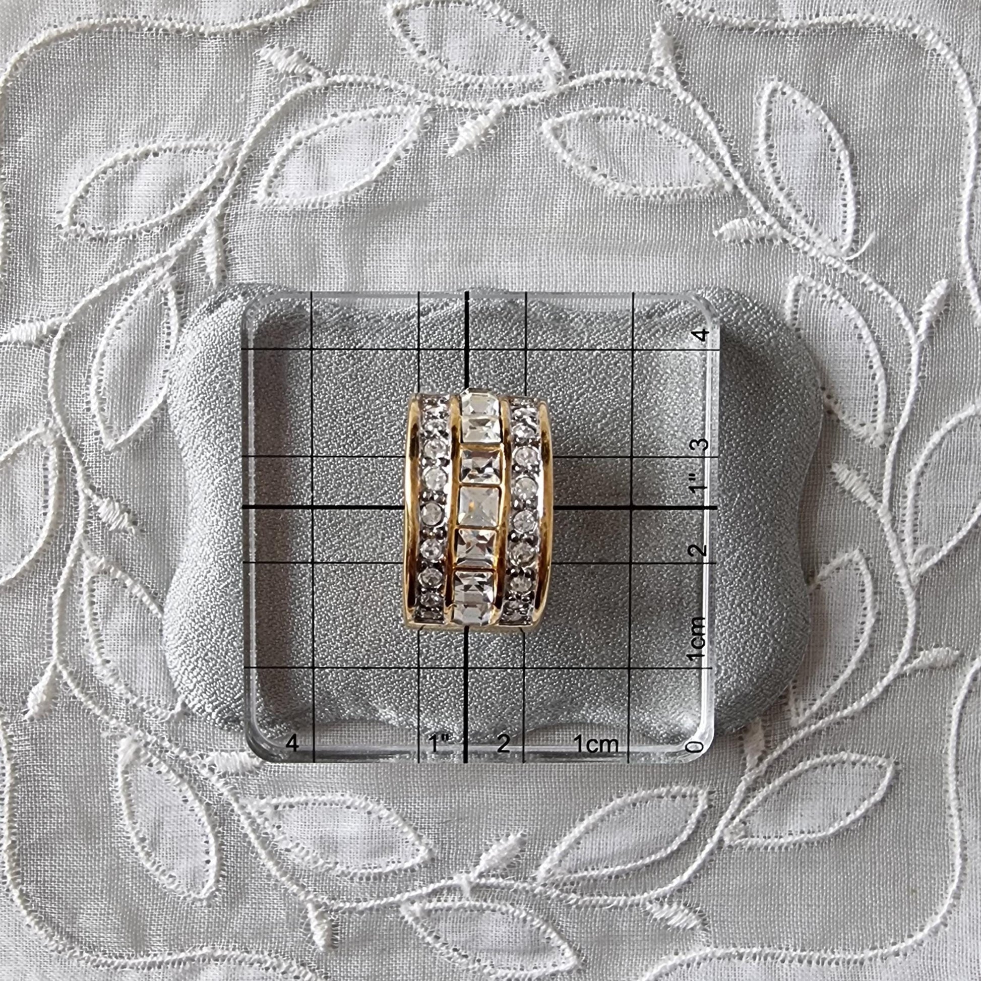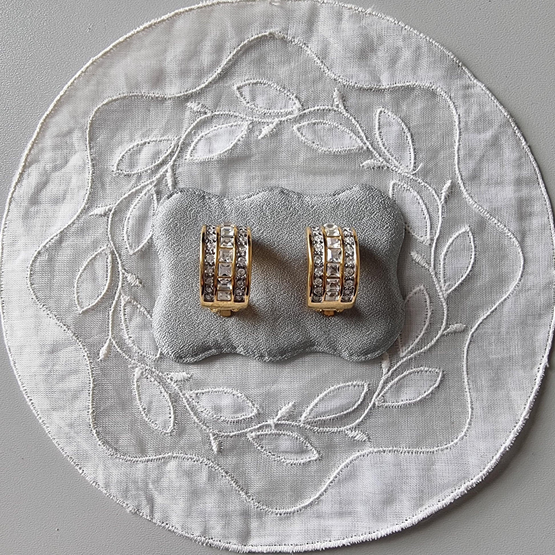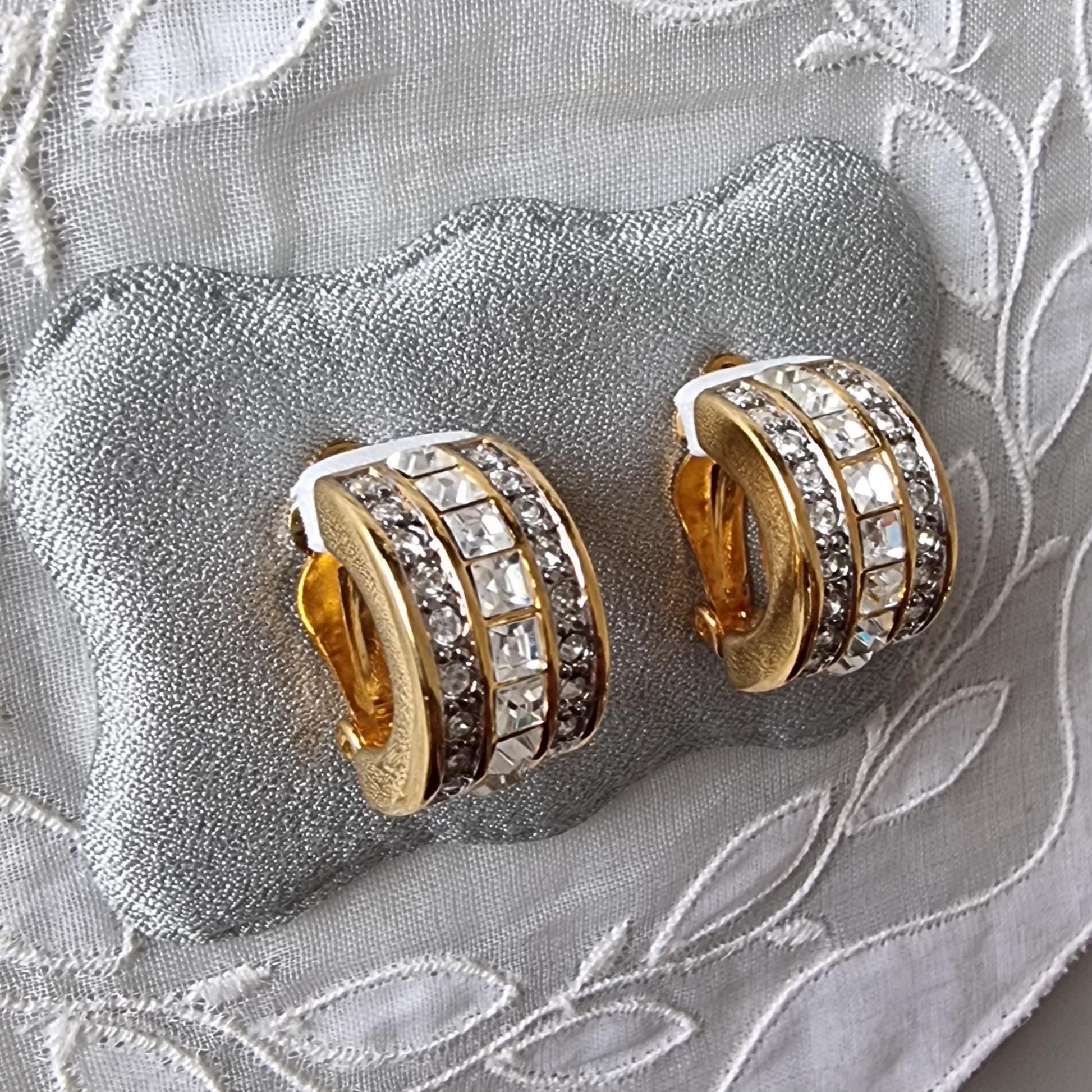 A gorgeous chunky half hoop clip on earrings with square and round clear crystals on gold plated metal