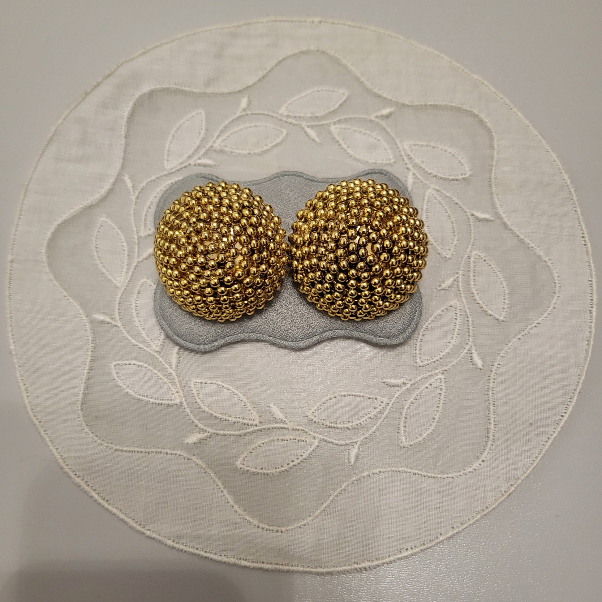 A chunky chic pair of hollow clip on earrings with round beaded studs in gold plated metal