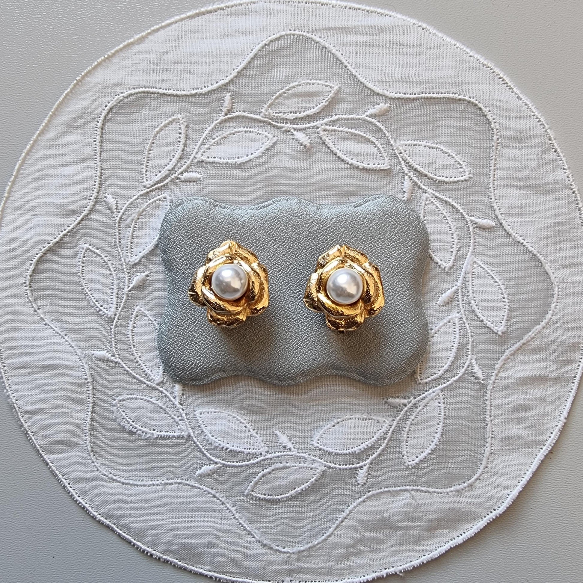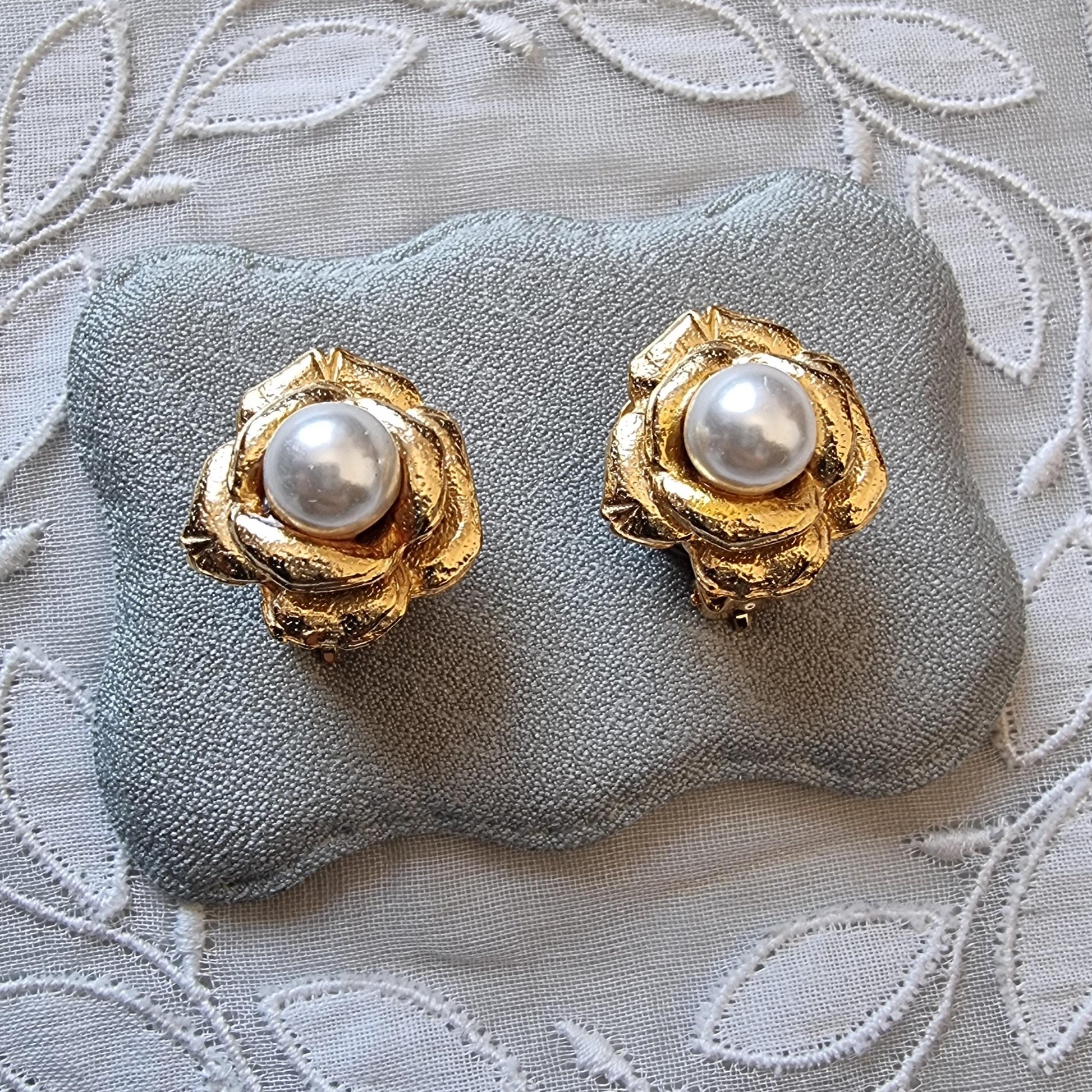 A sweet pair of rose clip on earrings accented with faux pearls on gold plated metal