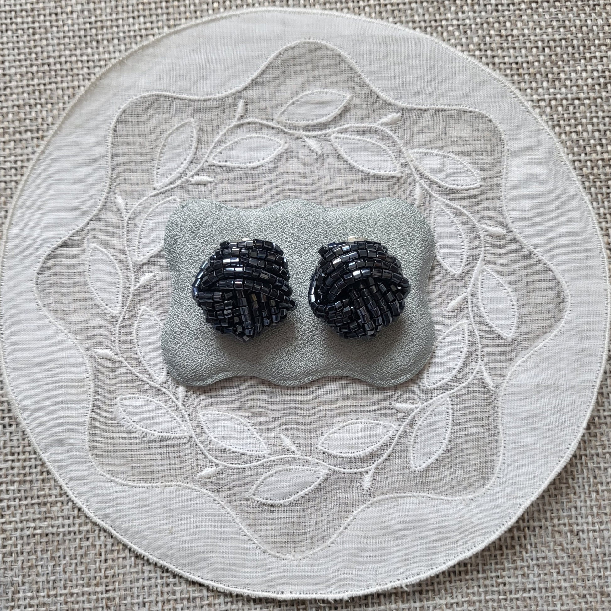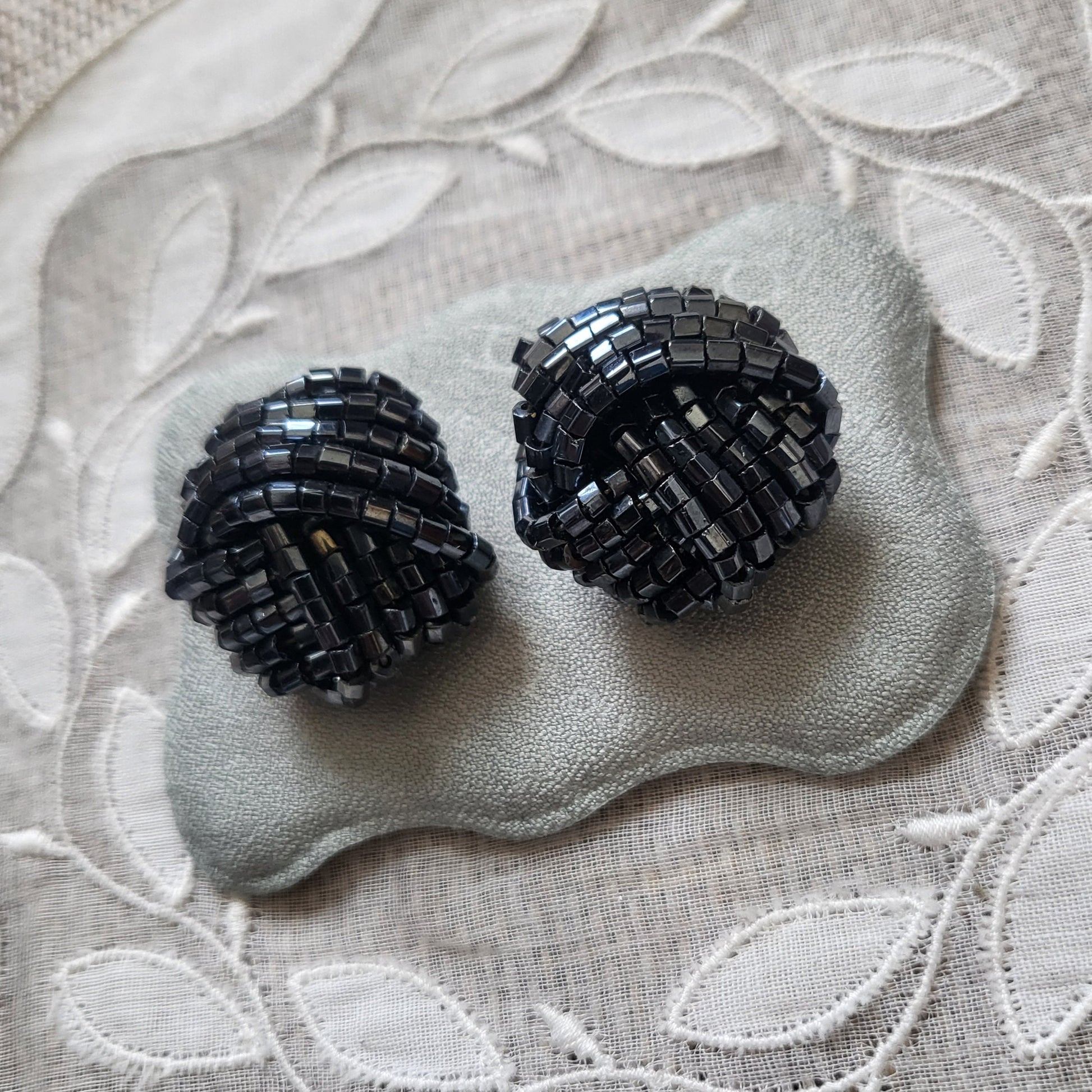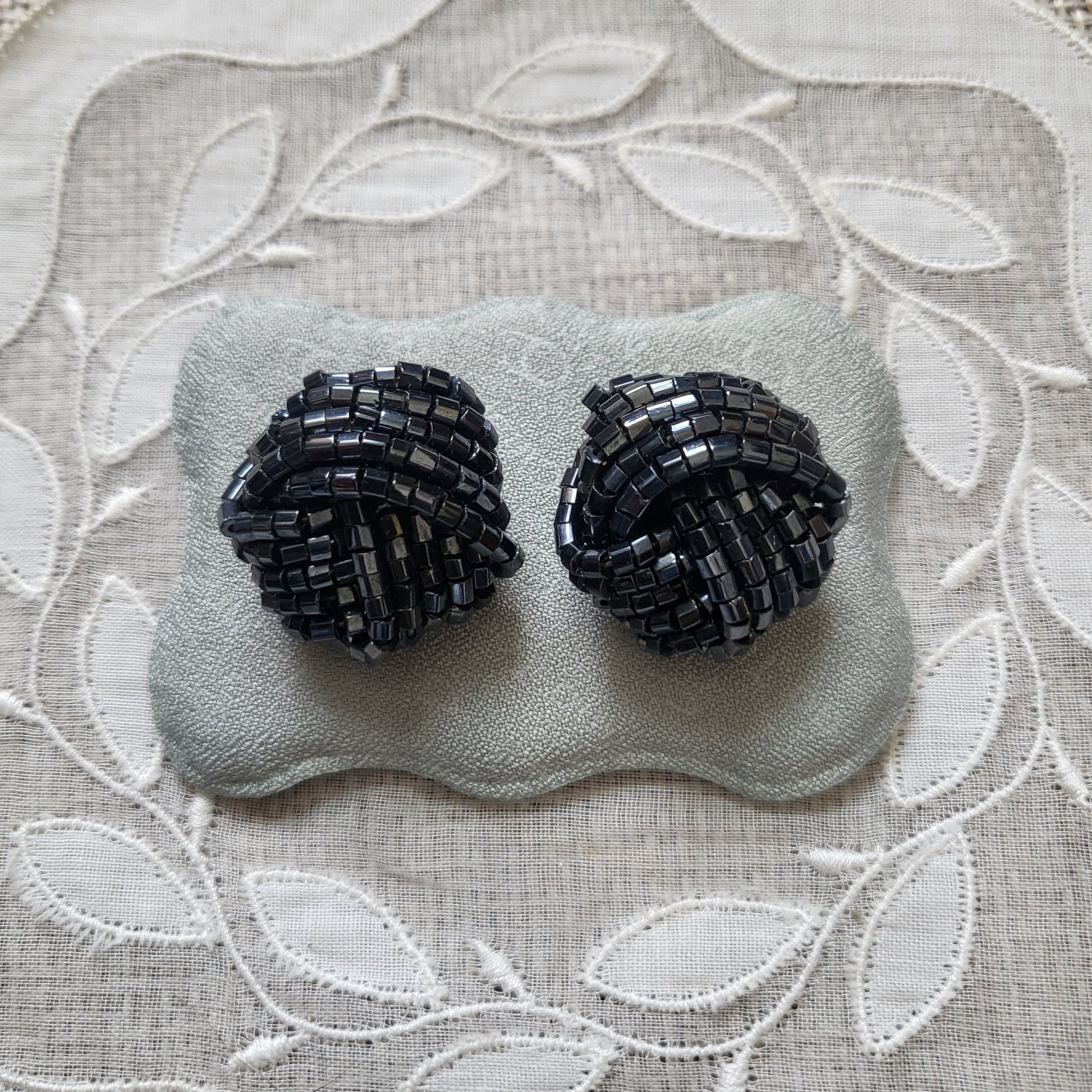 A fun pair of knot clip on earrings with small hematite beads on rhodium plated metal