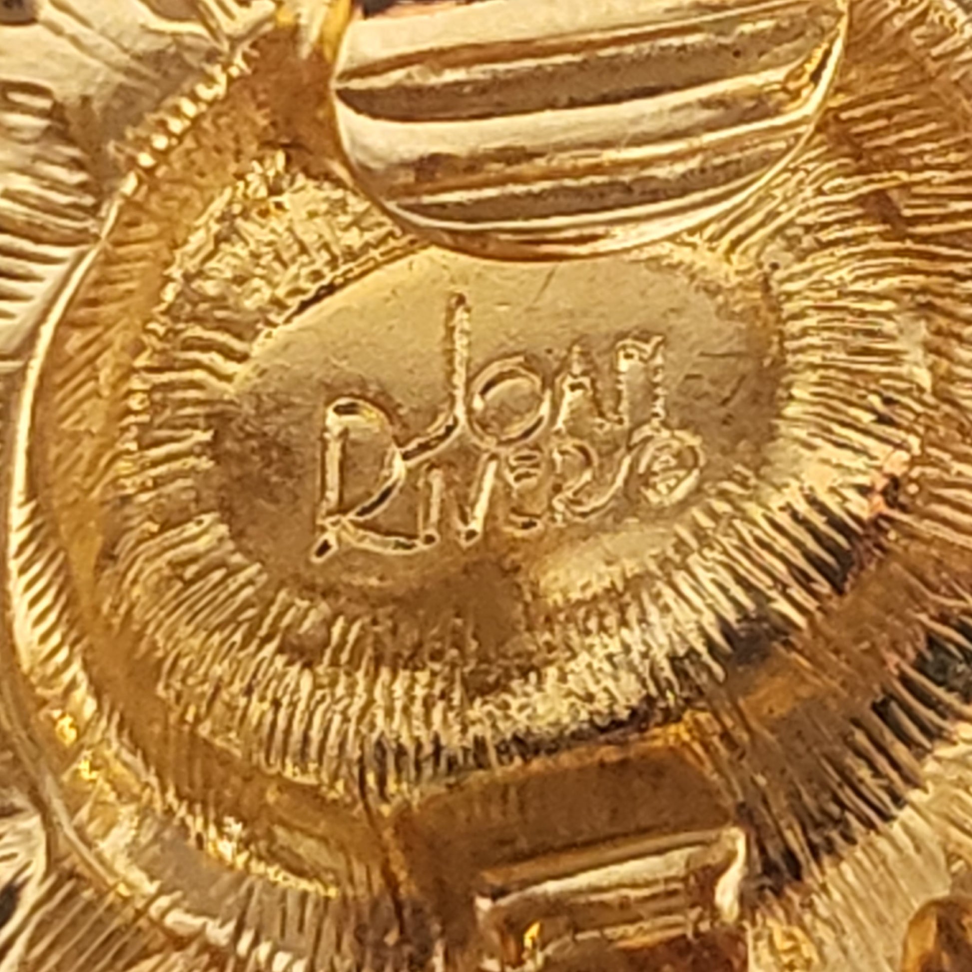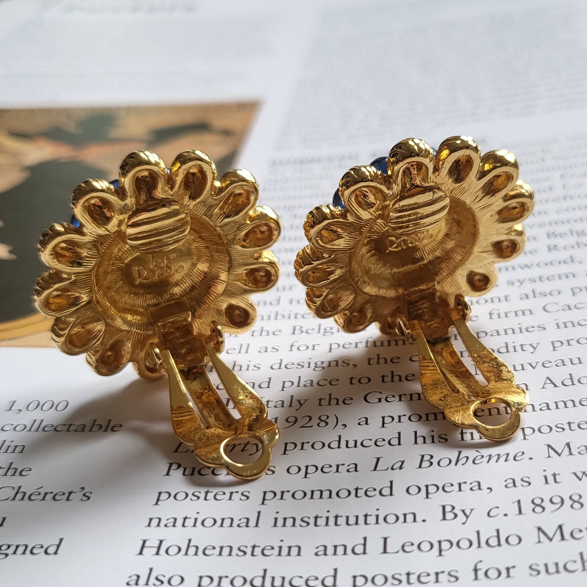 A lovely pair of flower clip on earrings by Joan Rivers with faux pearl cabochon and blue glass beads on gold plated metal
