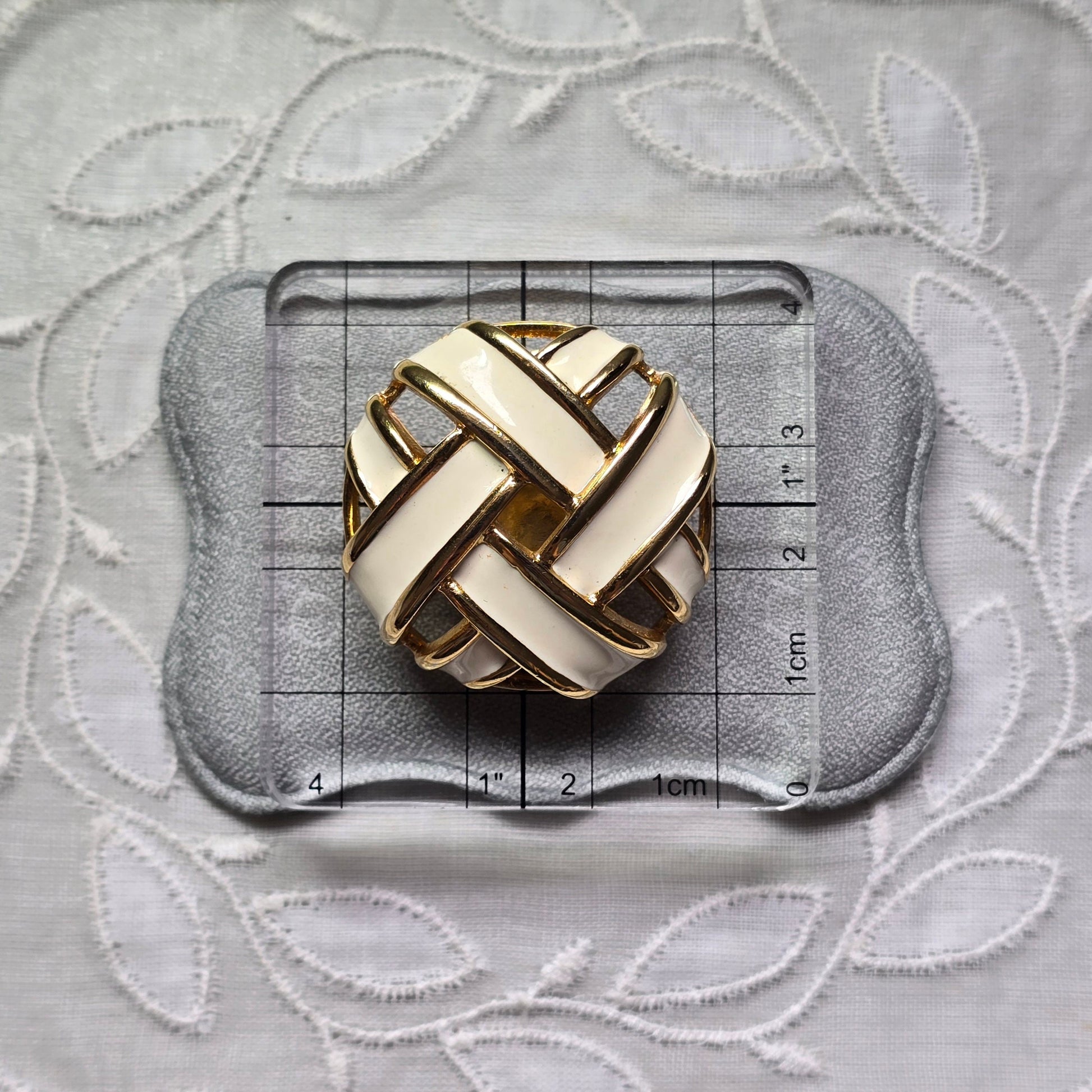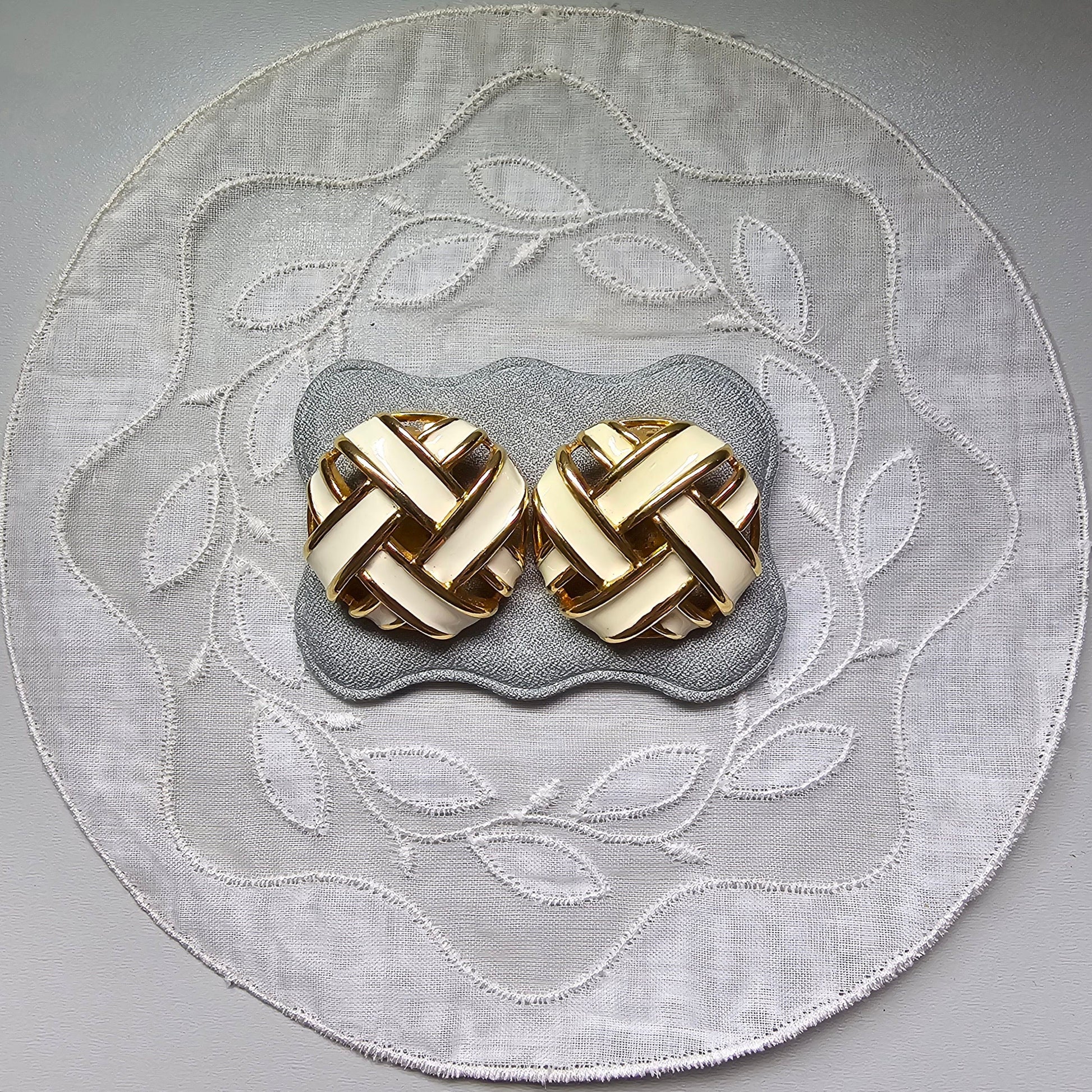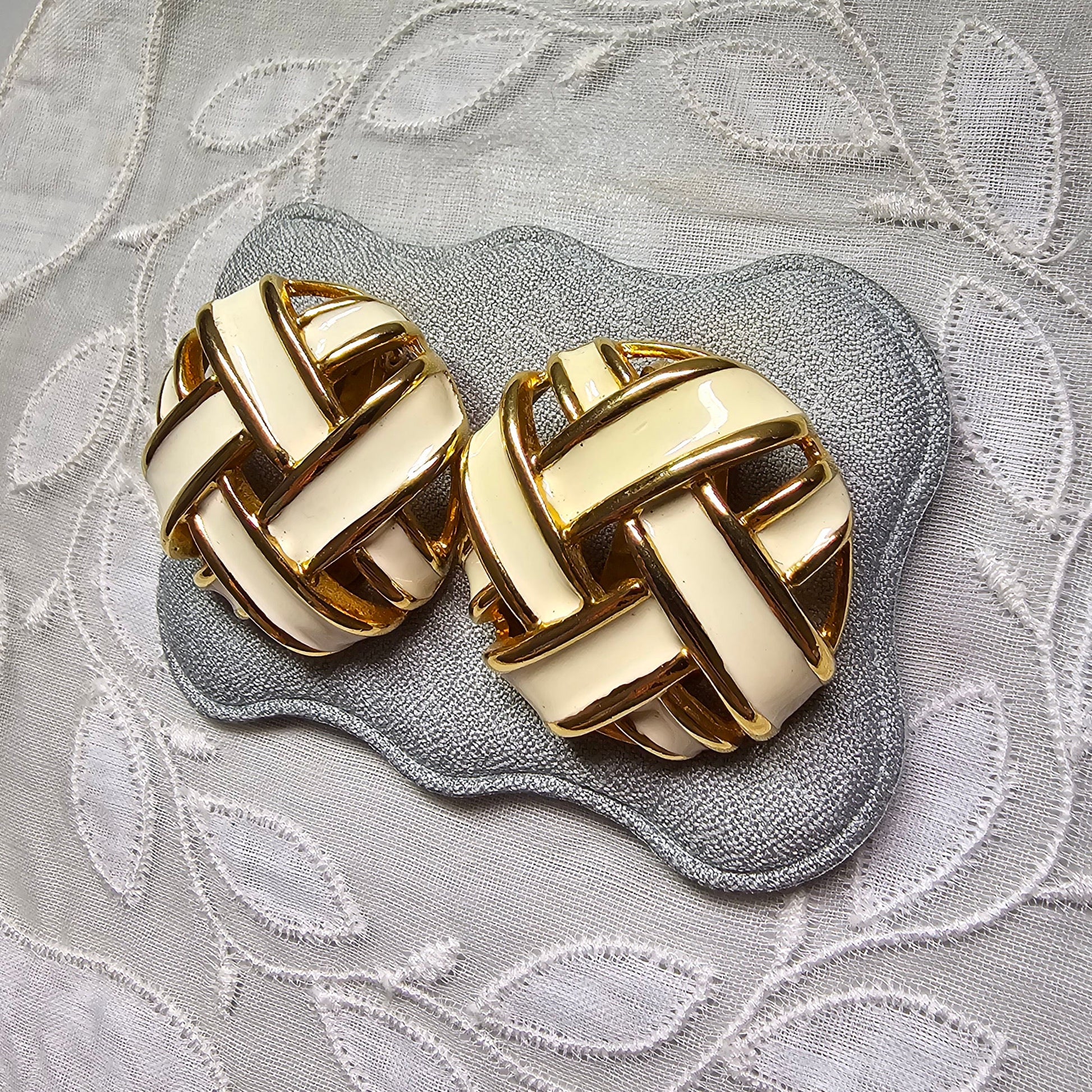 A beautiful pair of ribbon knot clip on earrings by Keyes with white enamel on gold plated metal