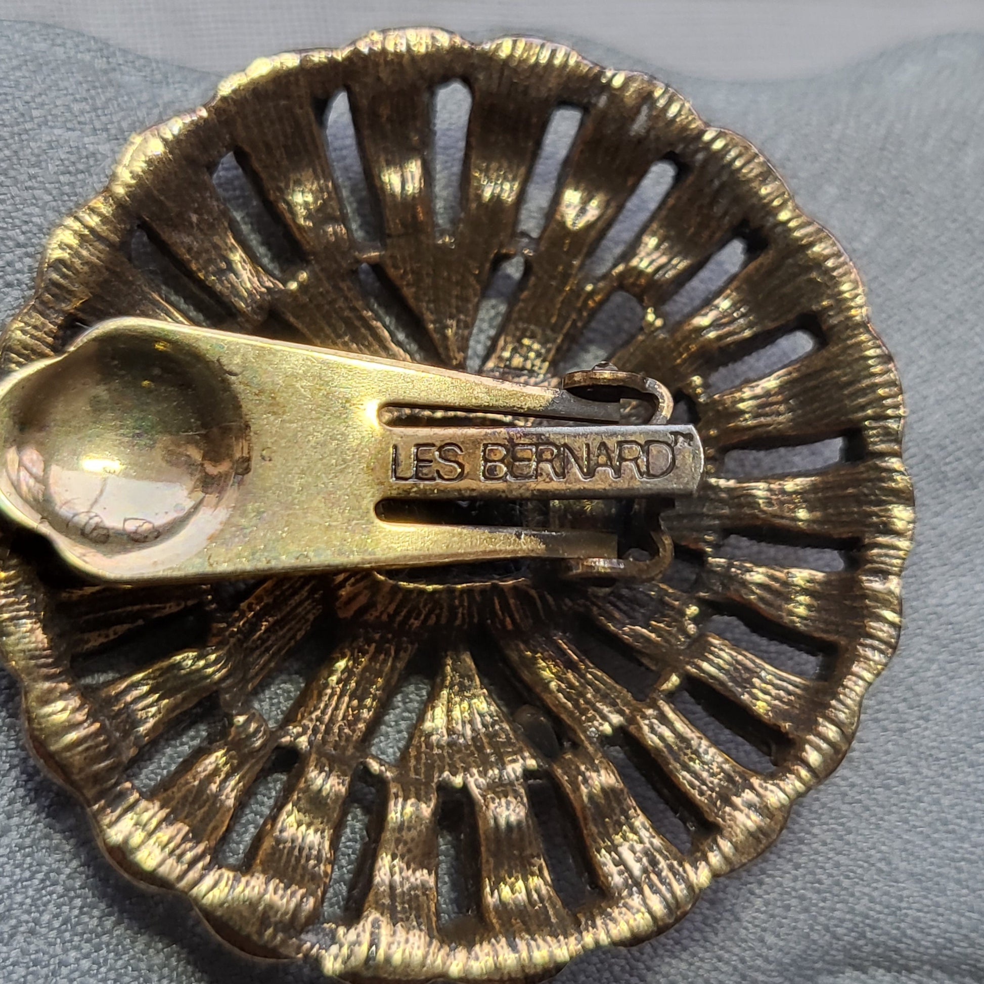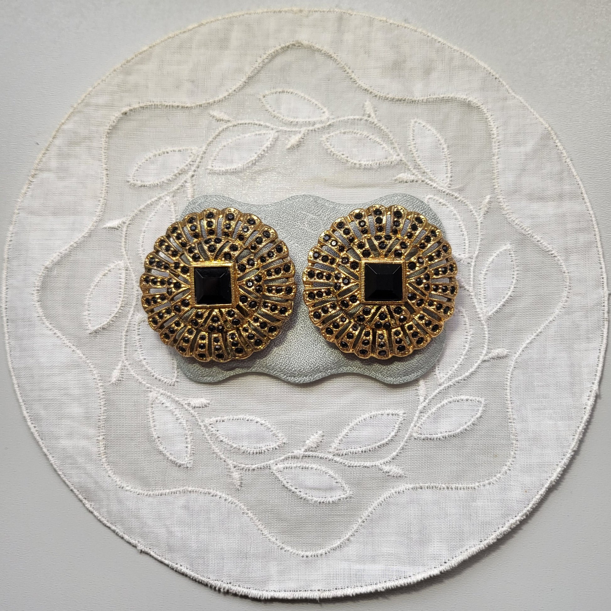 A stunning pair of statement clip on earrings by Les Bernard with black crystals seet on Russian gold tone plated metal
