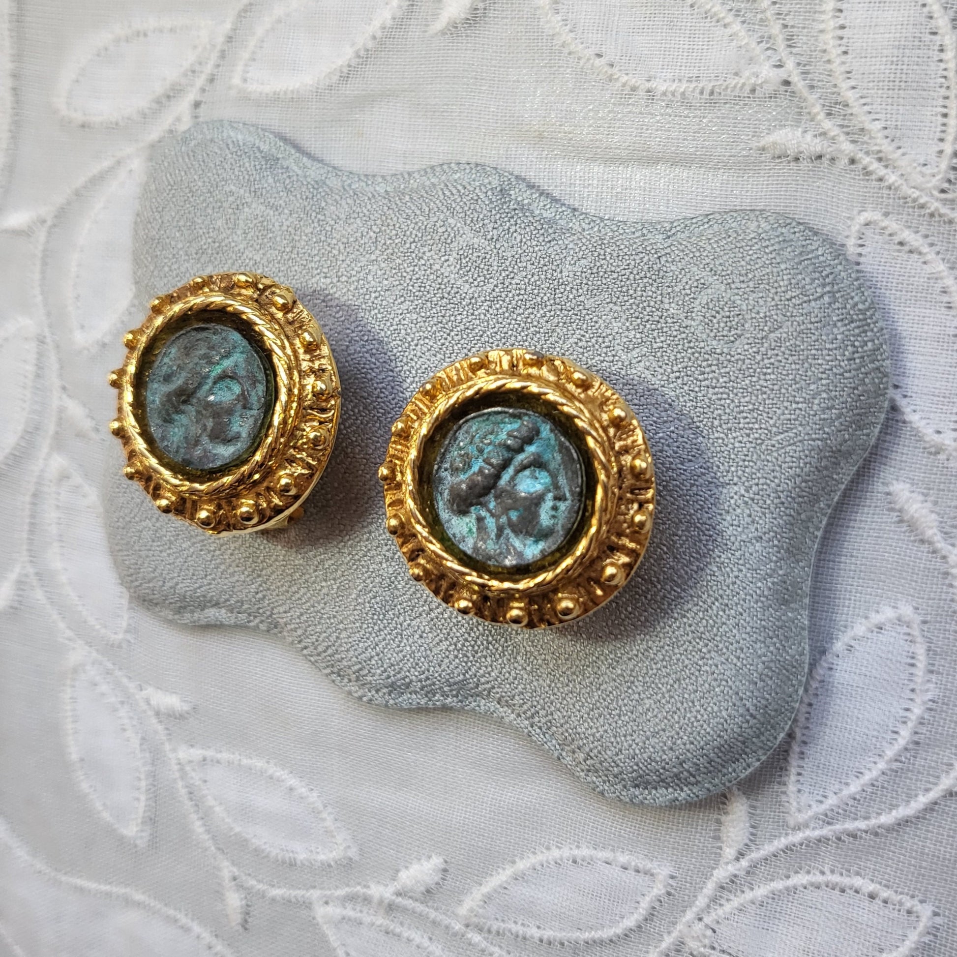 A stunning pair of coin earrings by Marie Victoire Kamer with Roman coin motif on gold plated metal