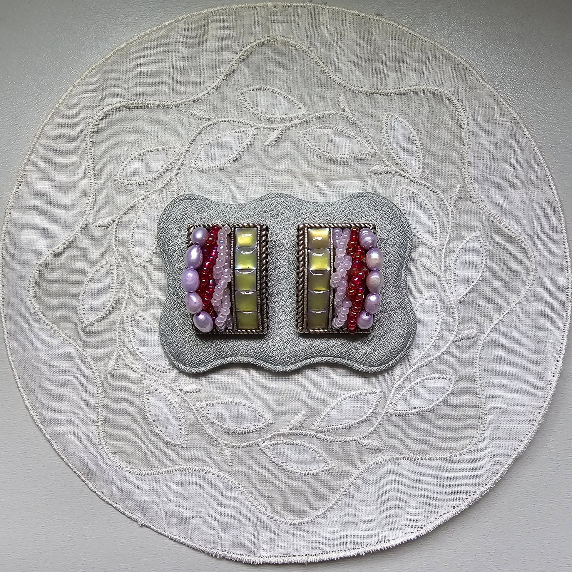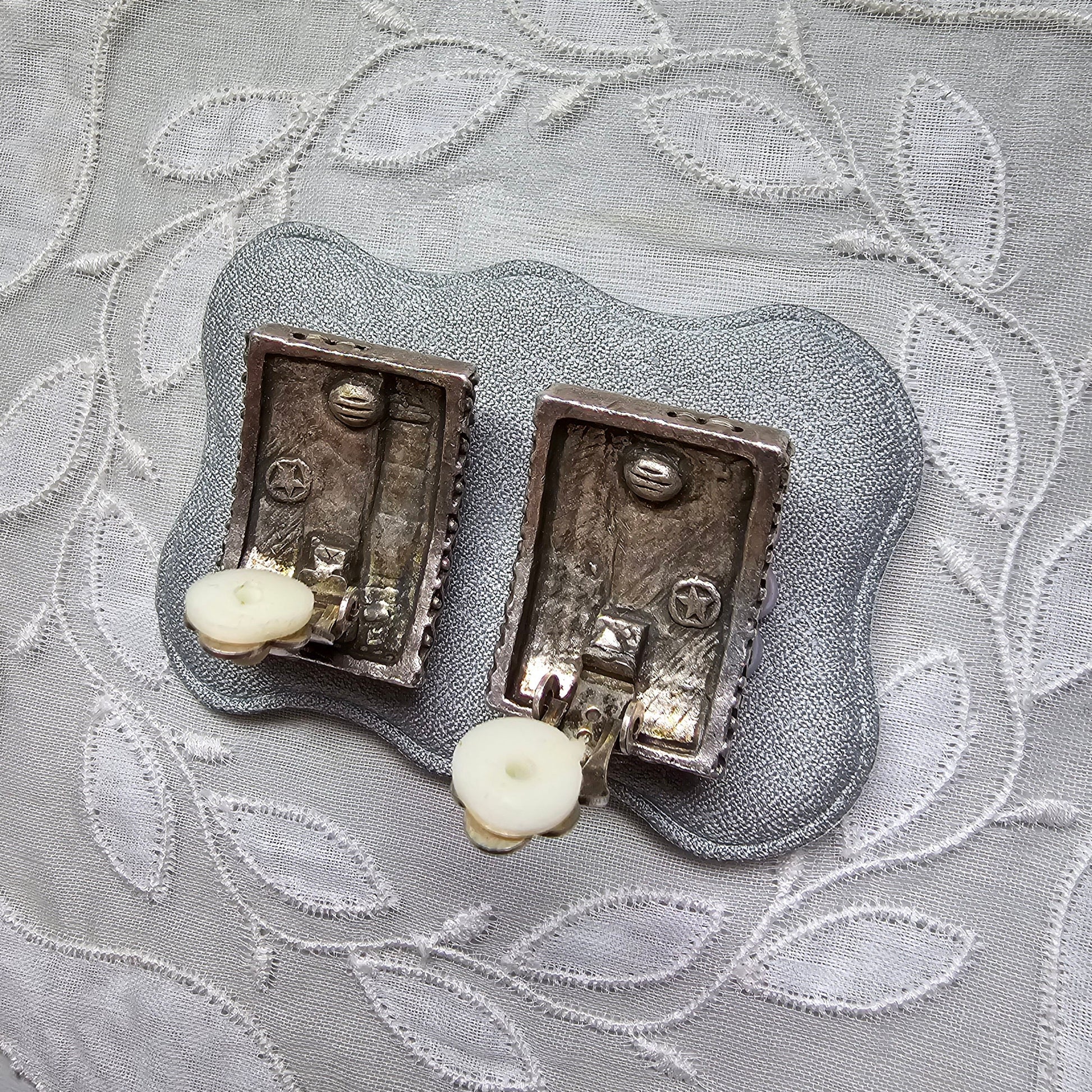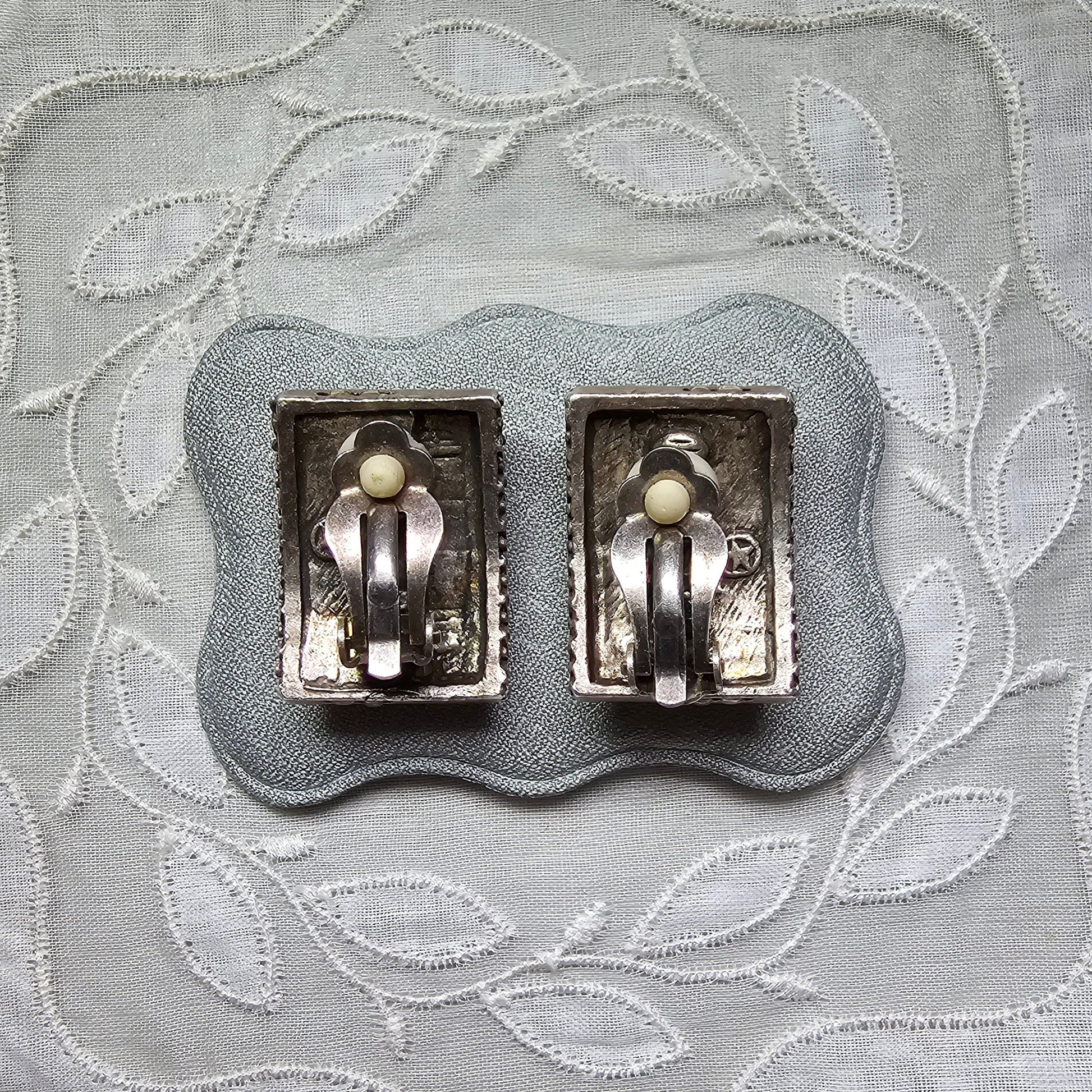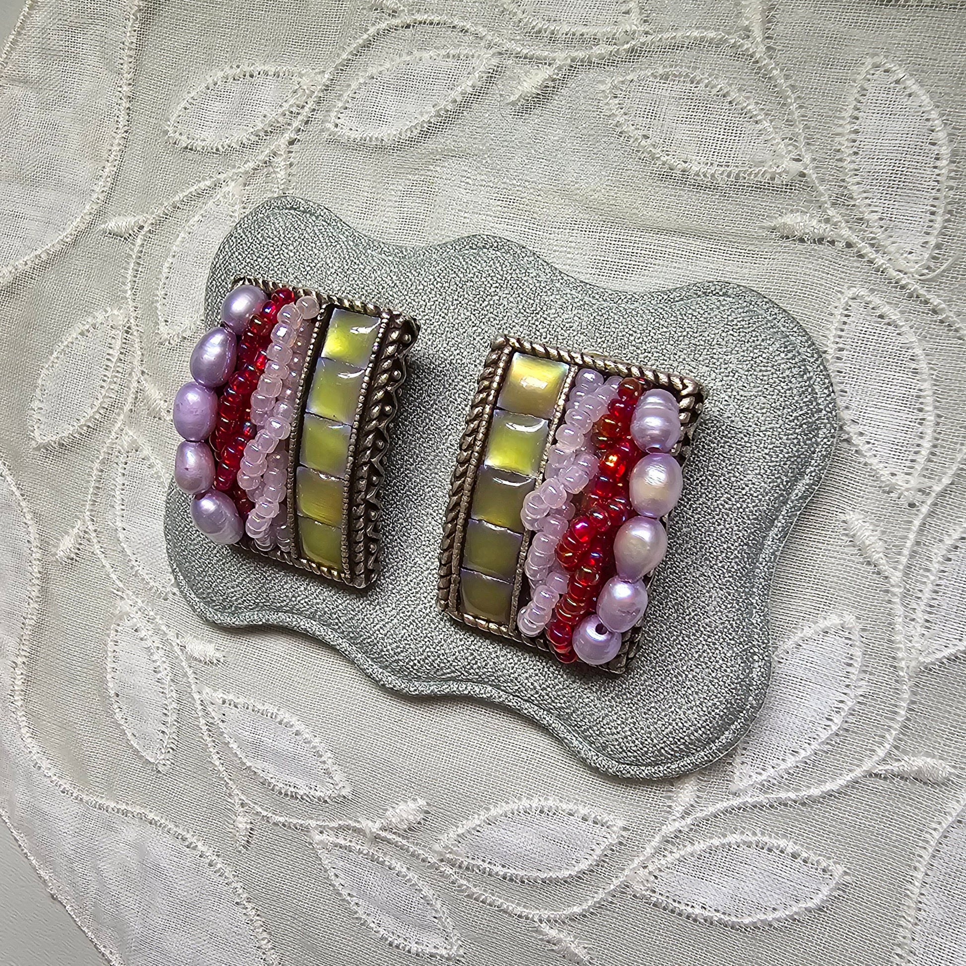 A stunning pair of 80s French clip on earrings with freshwater pearls, iridescent beads and square cabochons on silver tone jewellery metal alloy