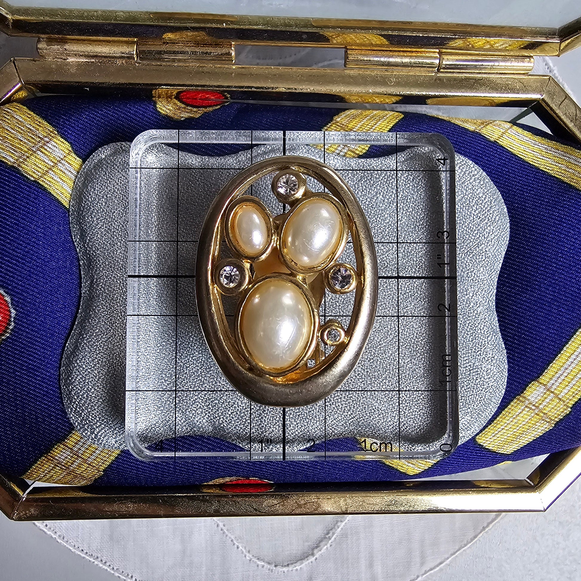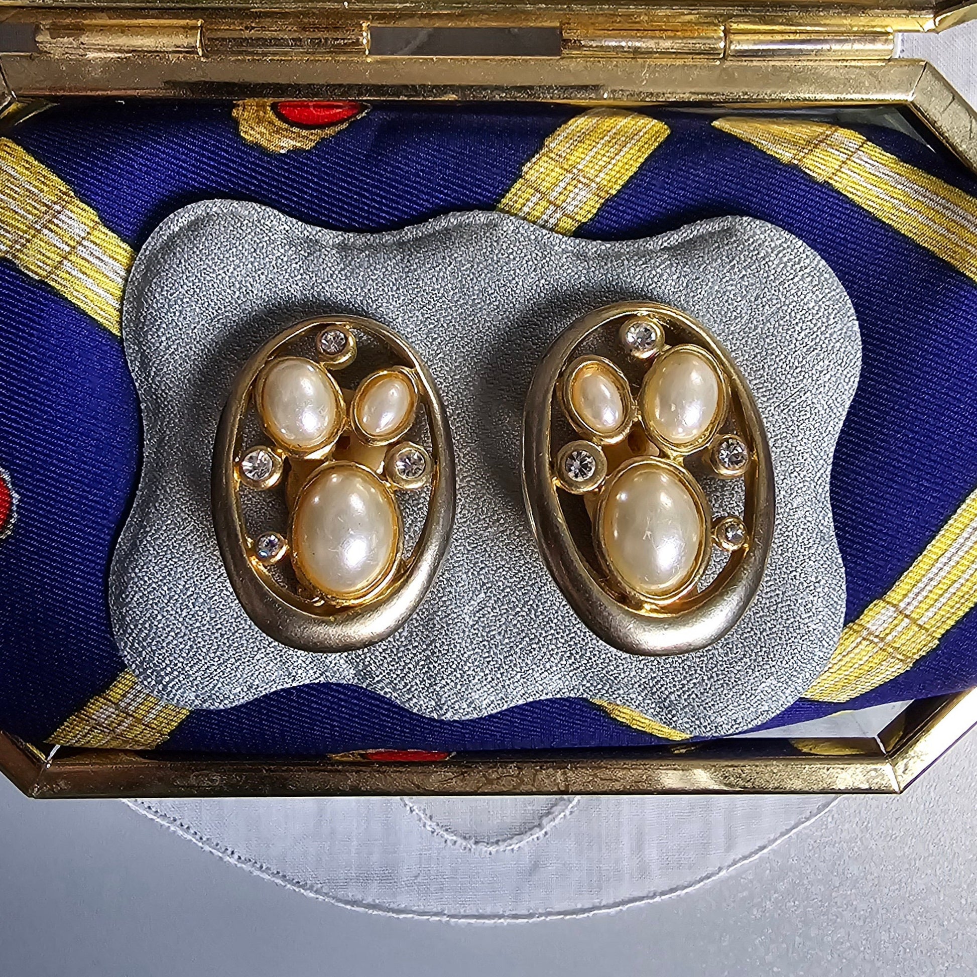 A beautiful pair of clip on earrings with oval faux pearl cabochons and small clear crystals on gold plated metal