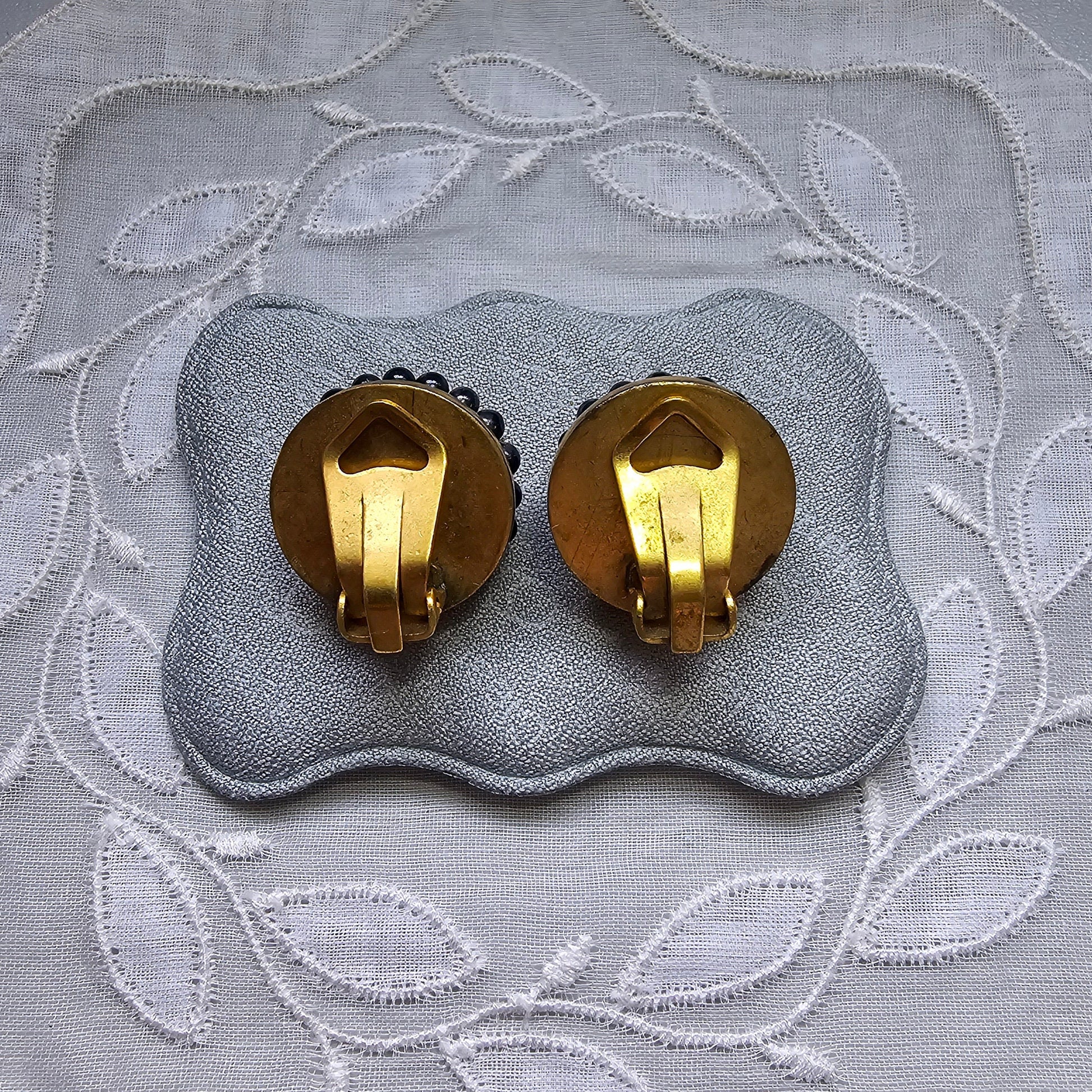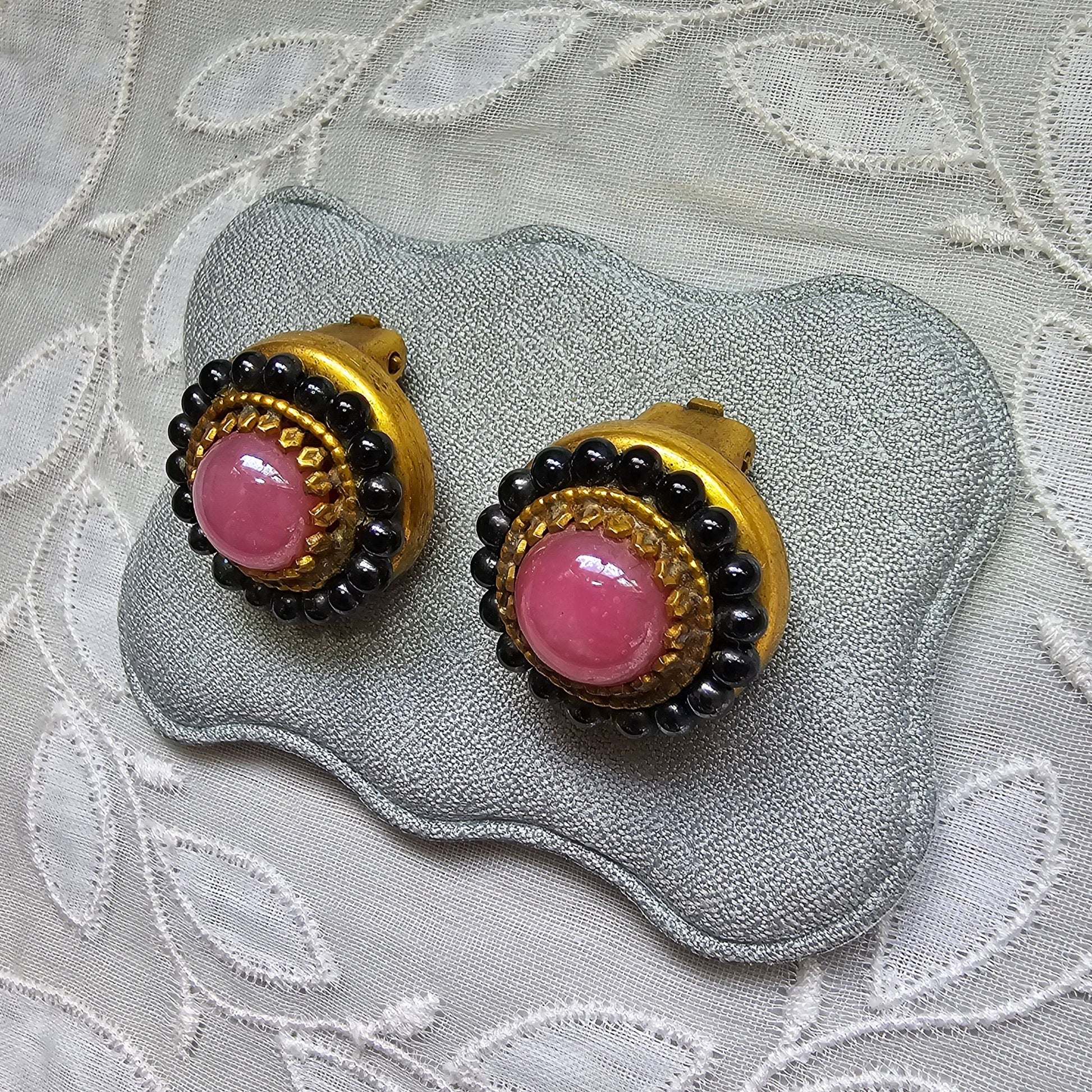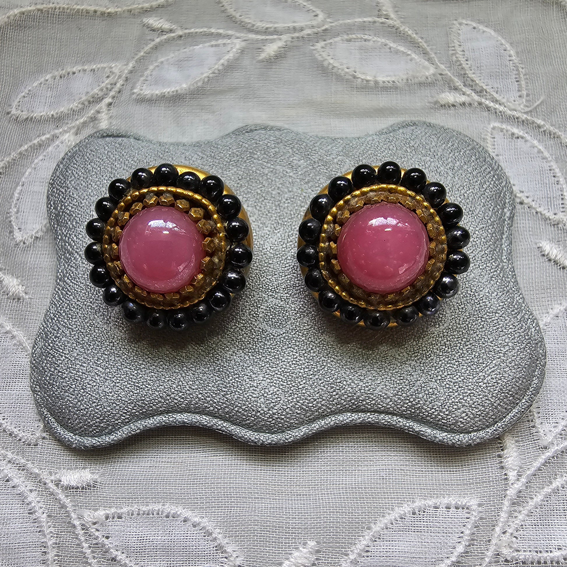 A stunning pair of round clip on earrings with beautiful pink and black glass beads set on vintage brass metal