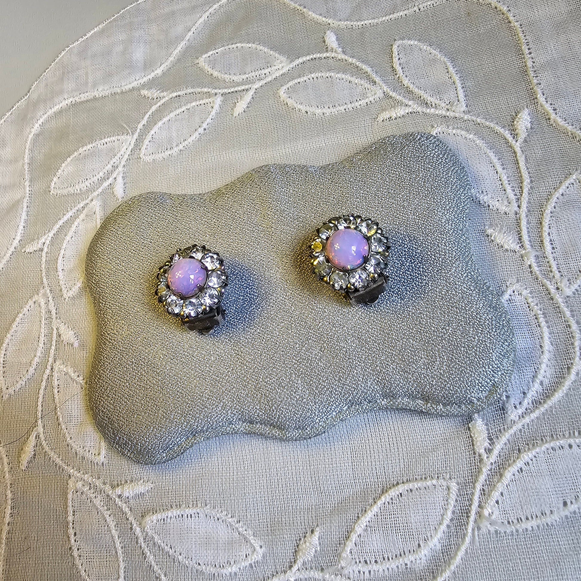 A lovely pair of small halo earrings with pink opaline crystal surrounded by small clear crystals on rhodium plated metal