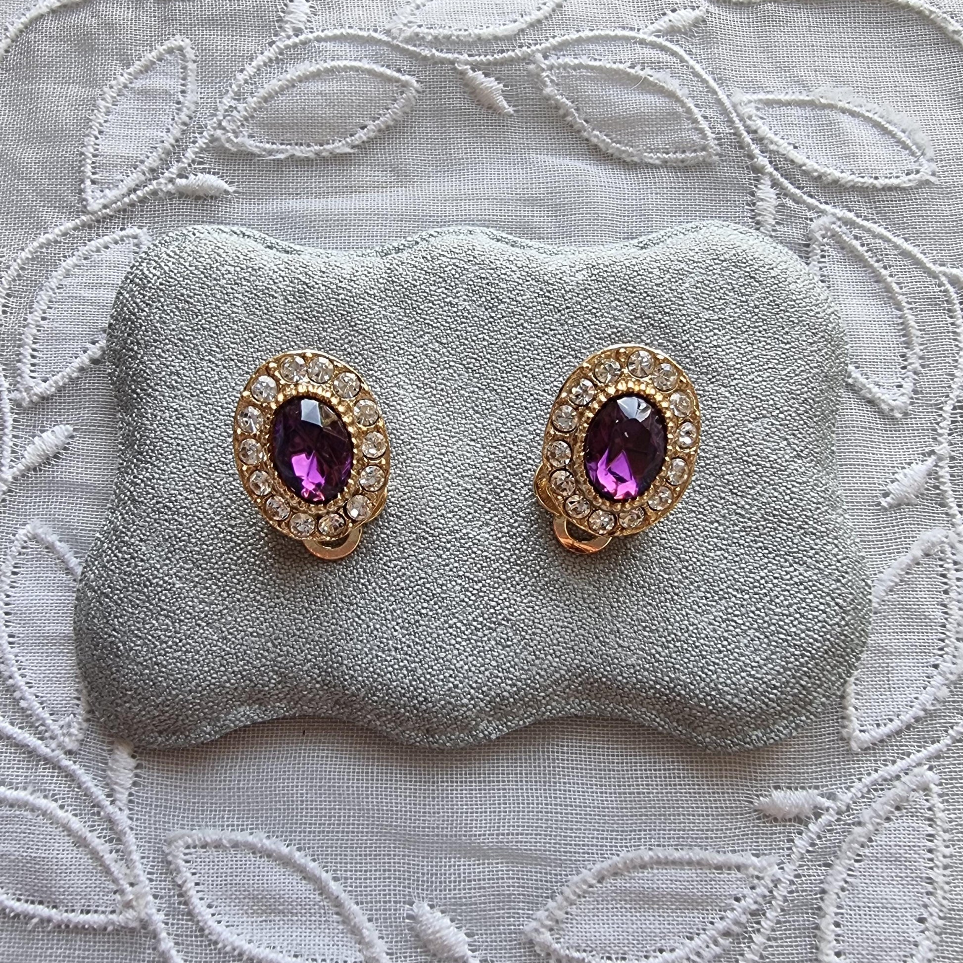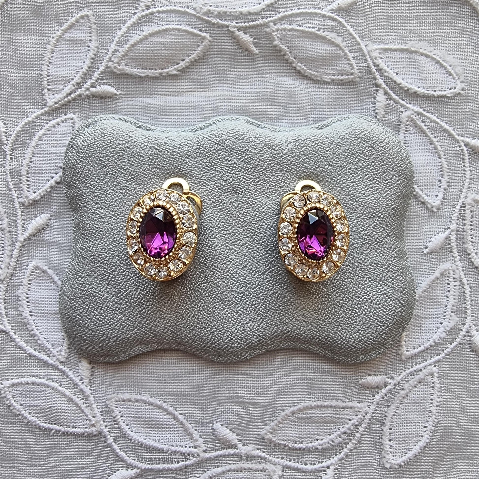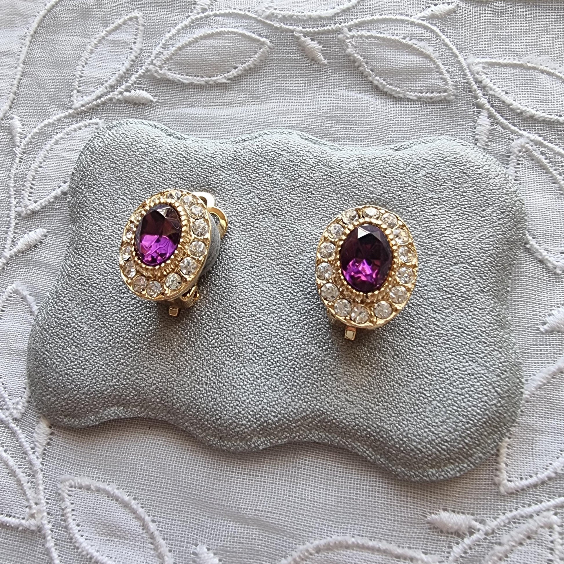 A beautiful pair of small clip on earrings with purple and clear crystals on gold plated metal