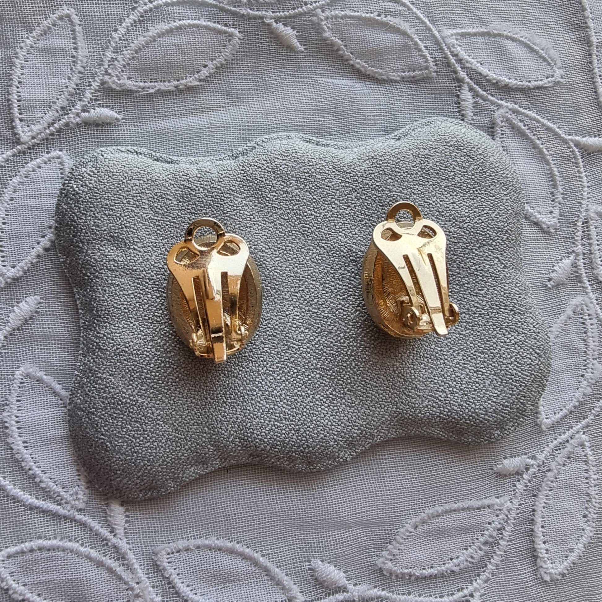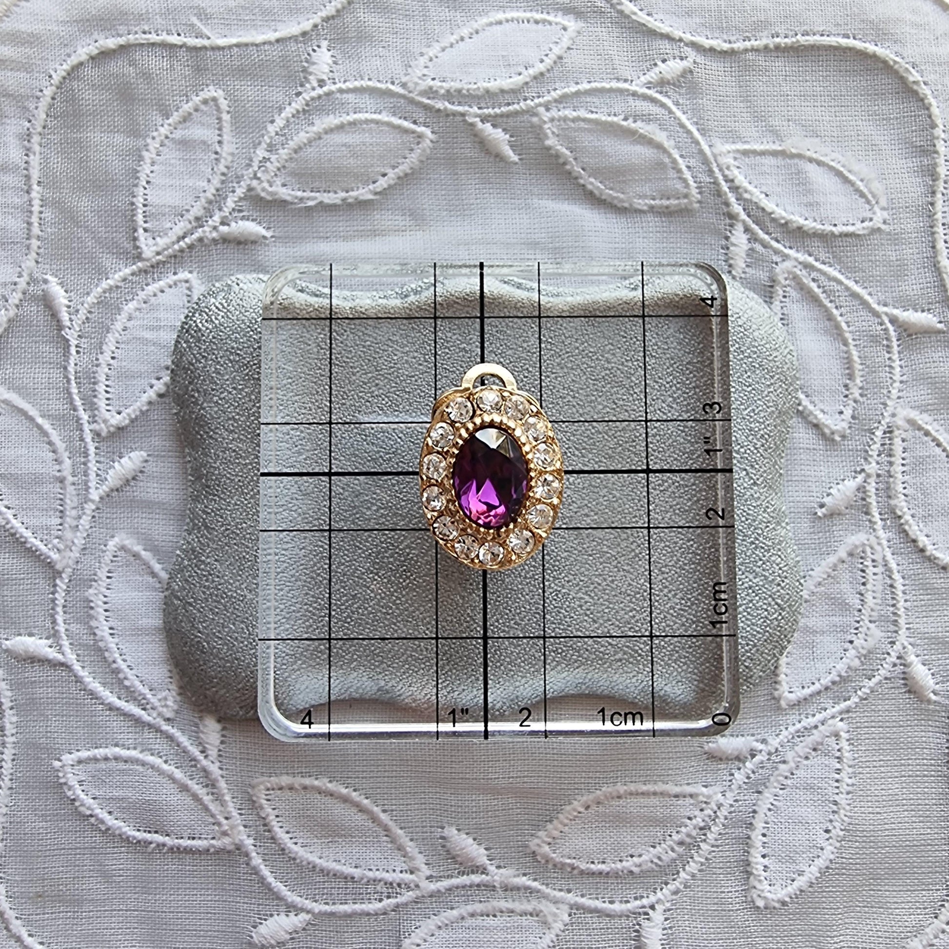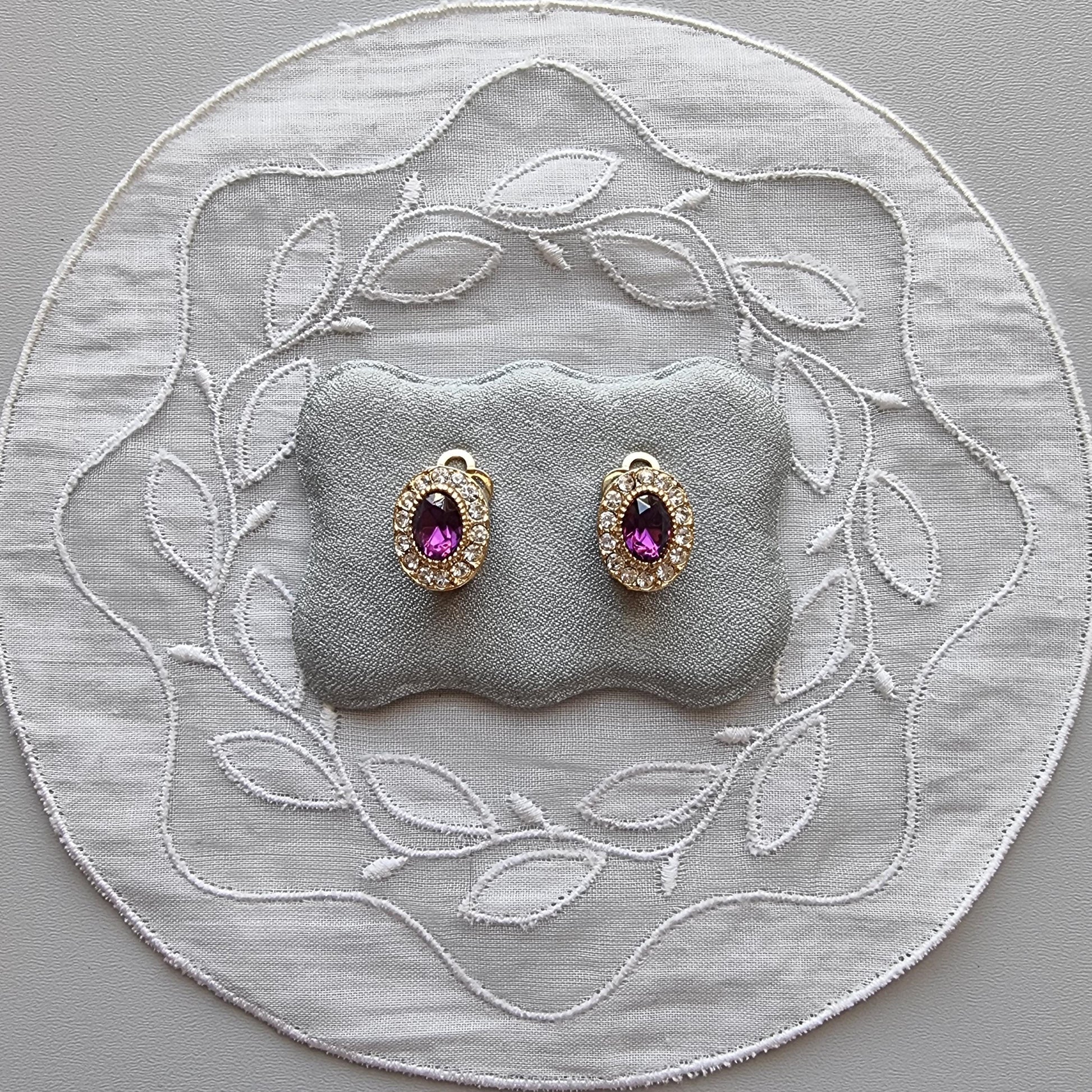 A beautiful pair of small clip on earrings with purple and clear crystals on gold plated metal