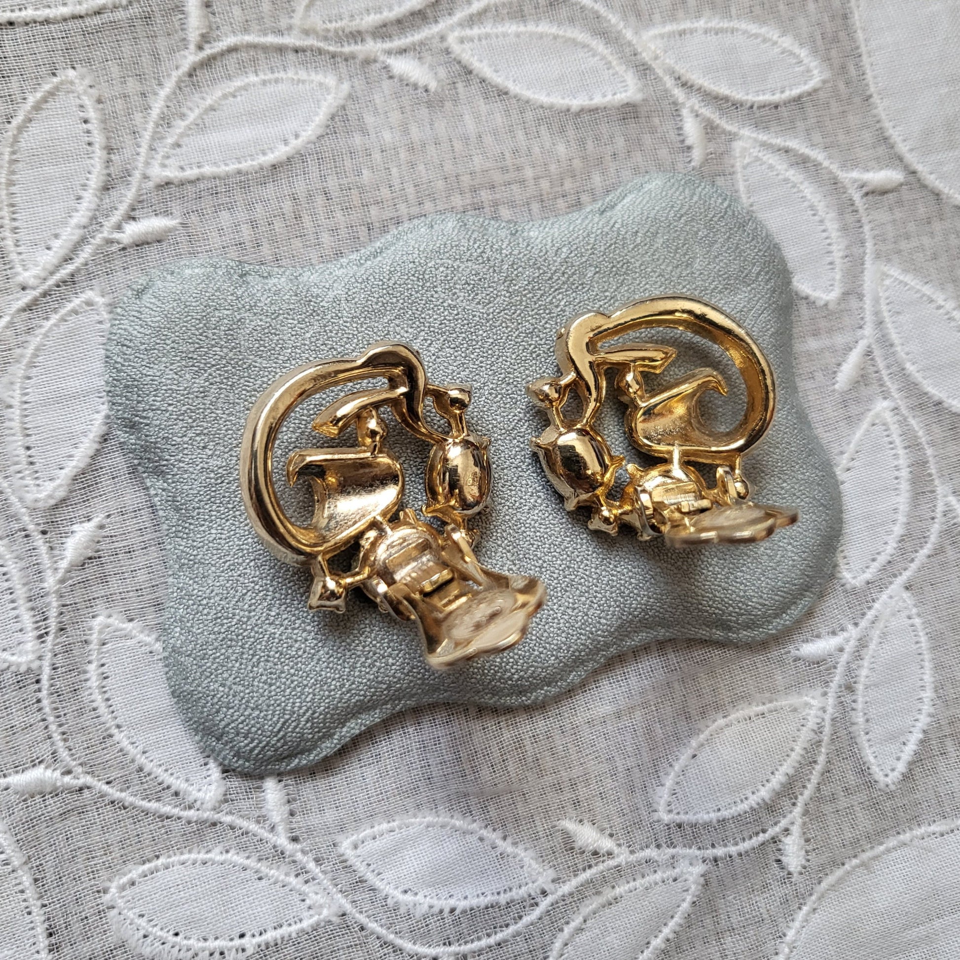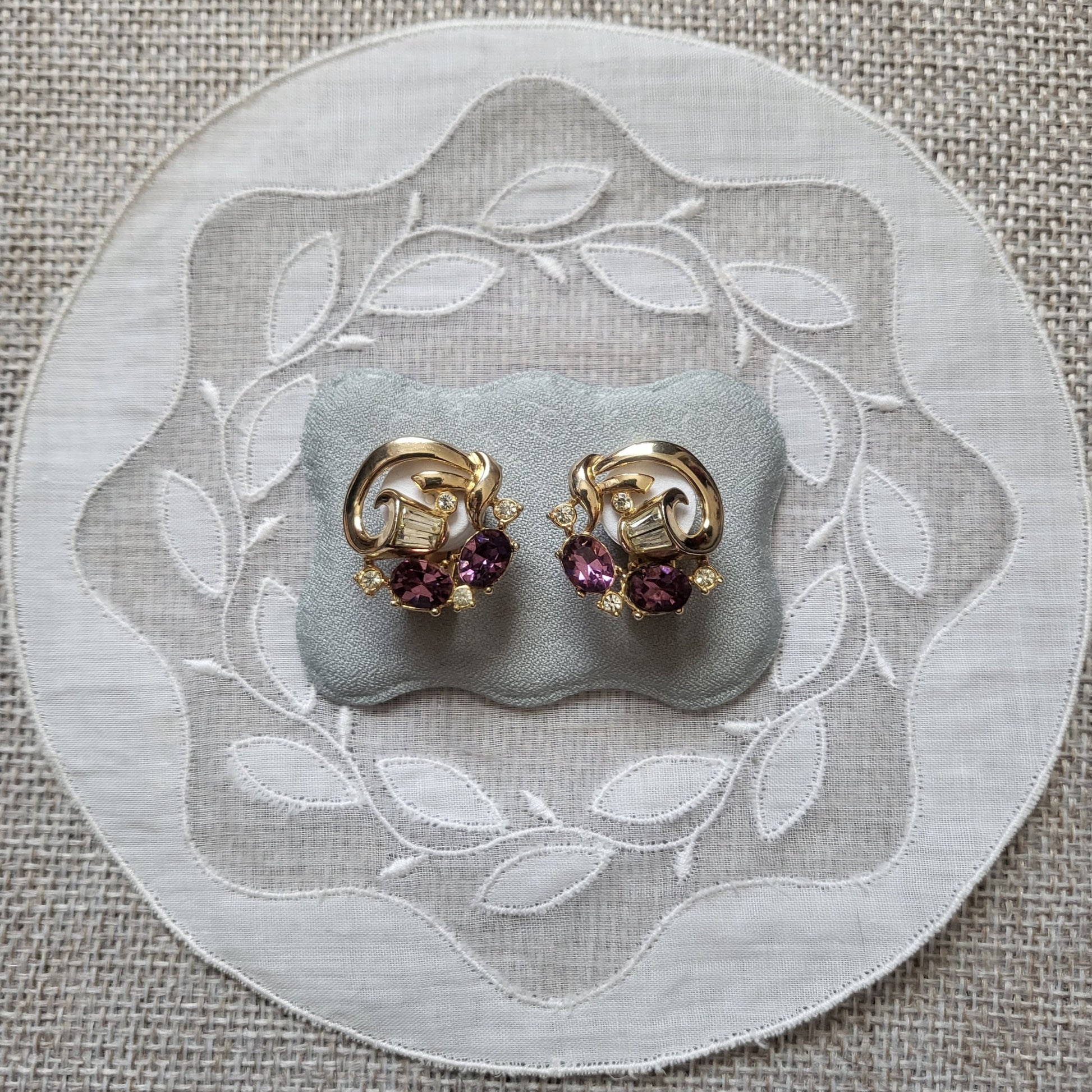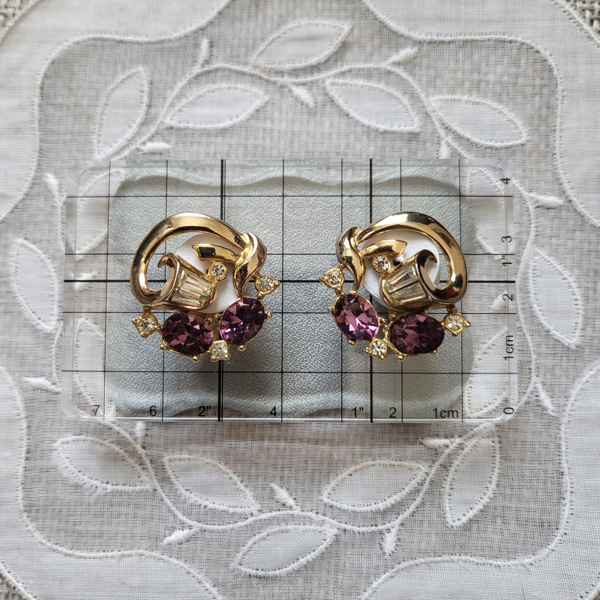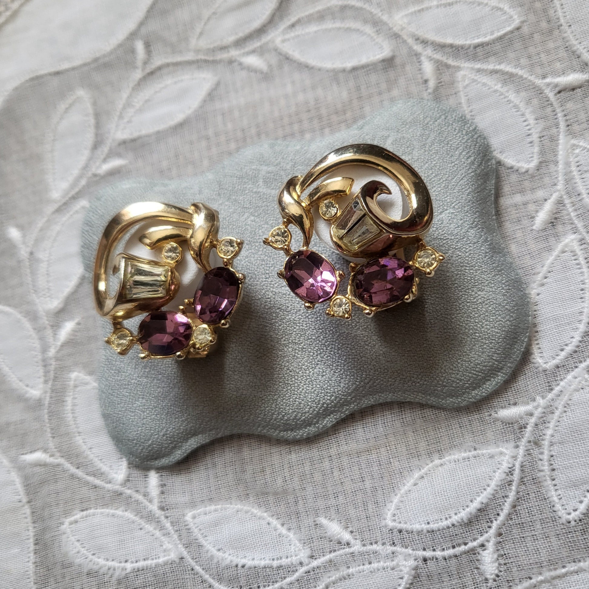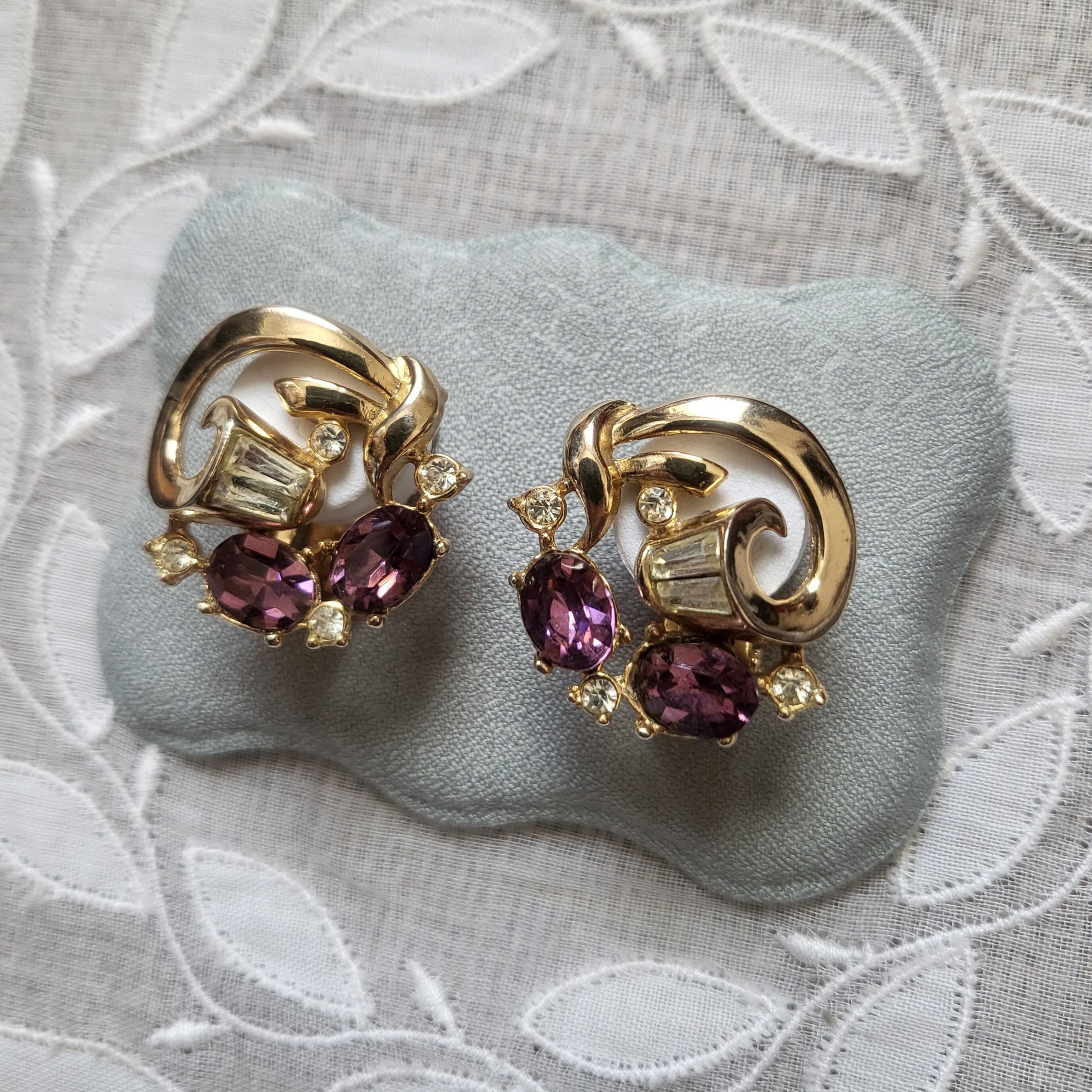 A beautiful pair of clip on earrings with purple and clear crystals on gold plated metal