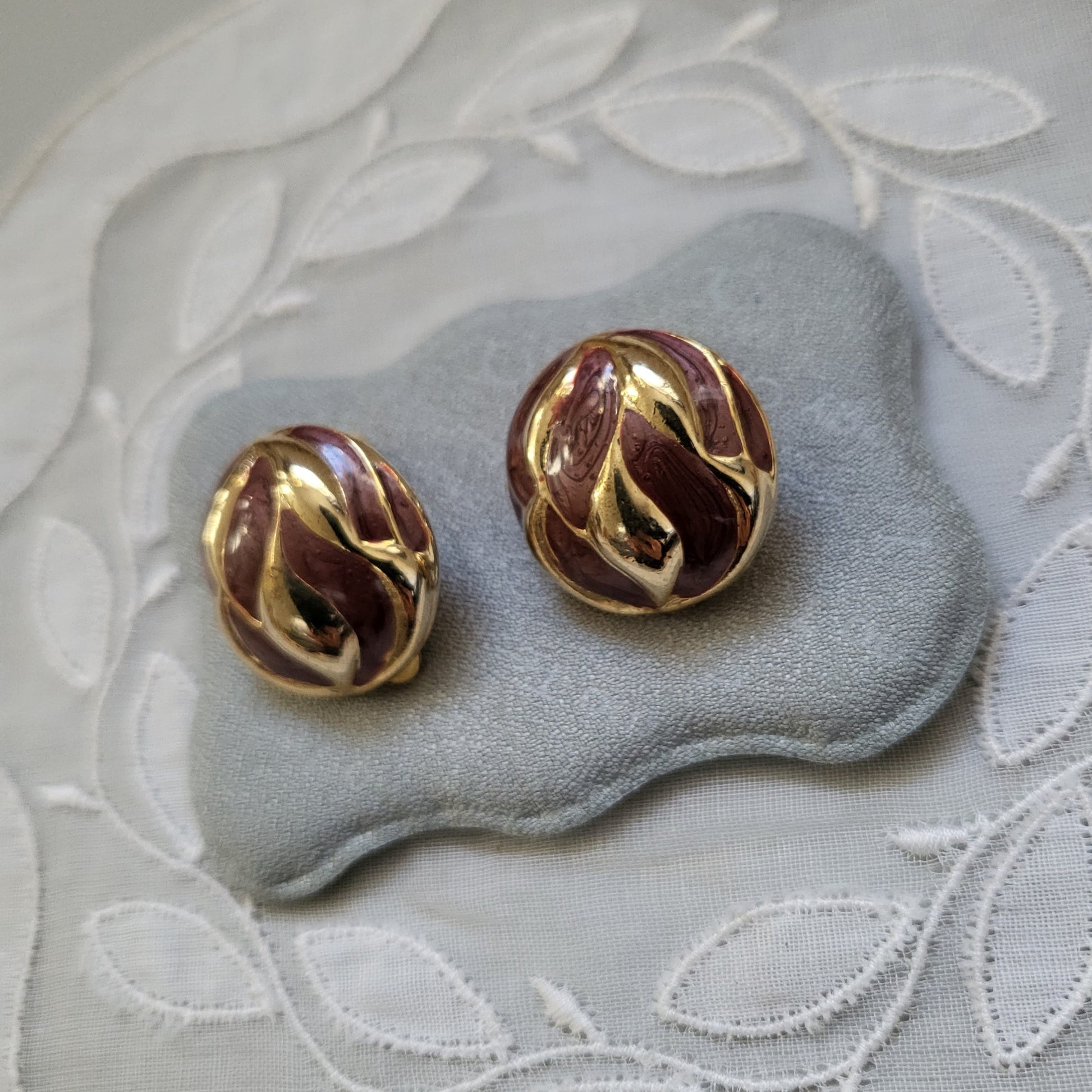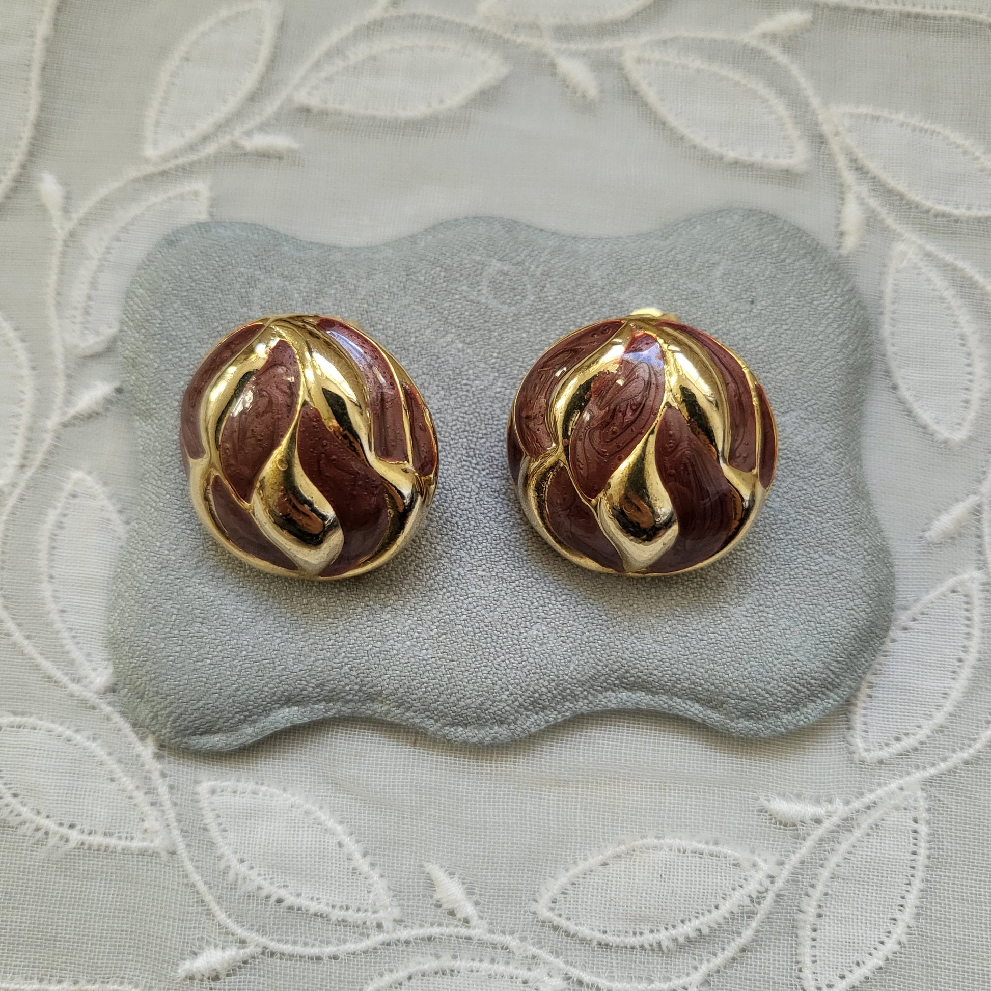 A chic pair of round clip on earrings in abstract design with red brown enamel on gold plated metal