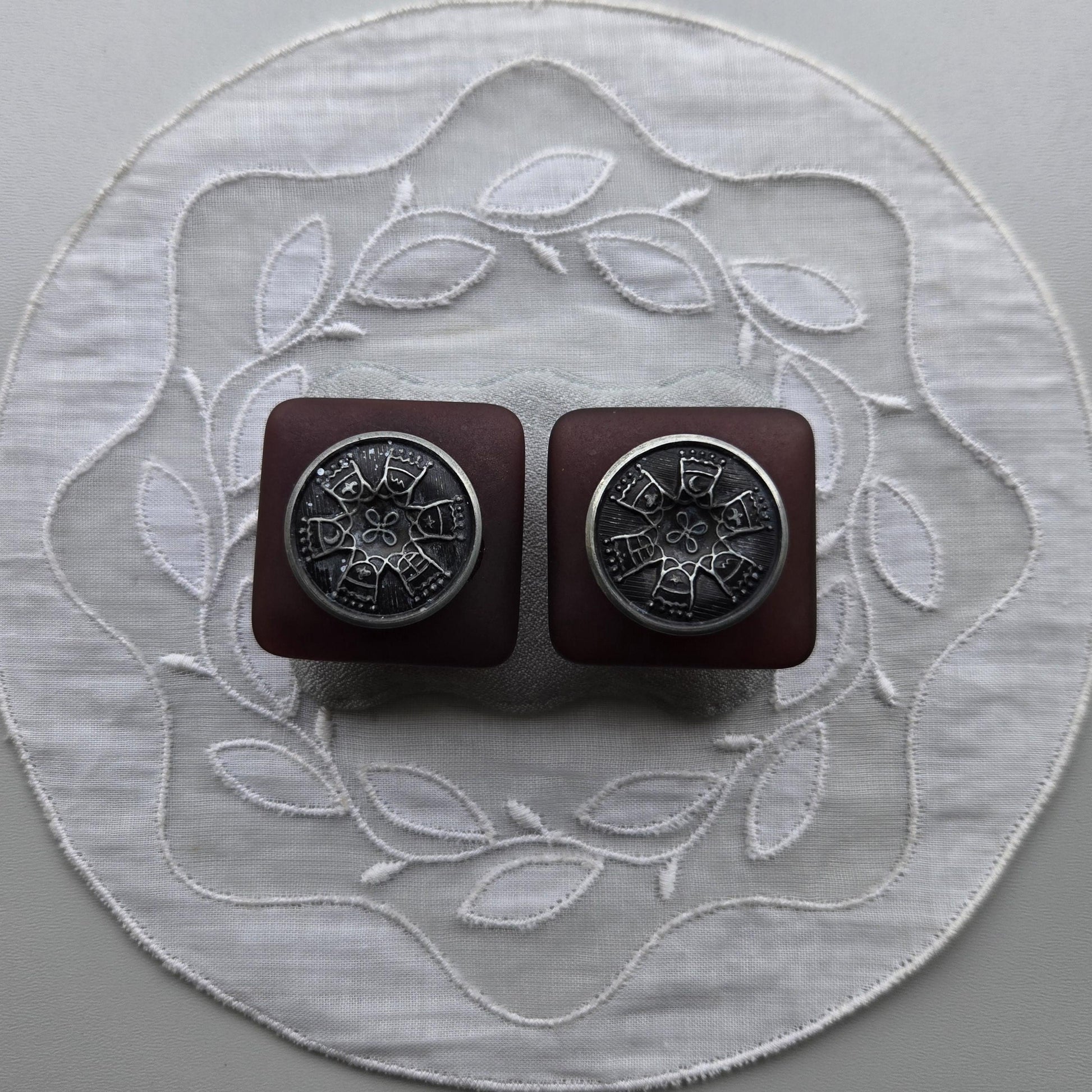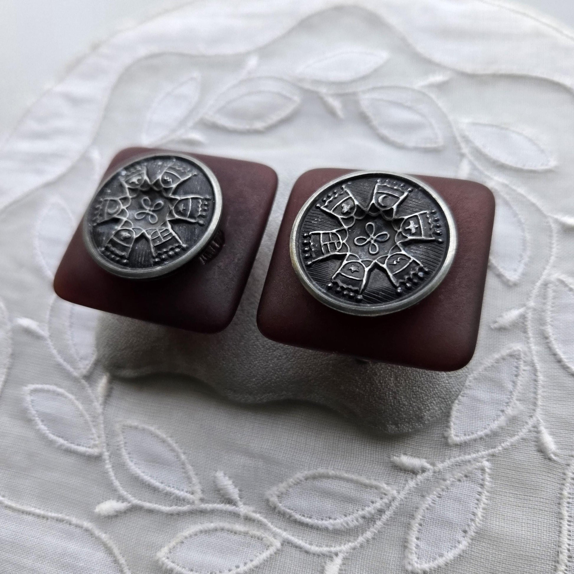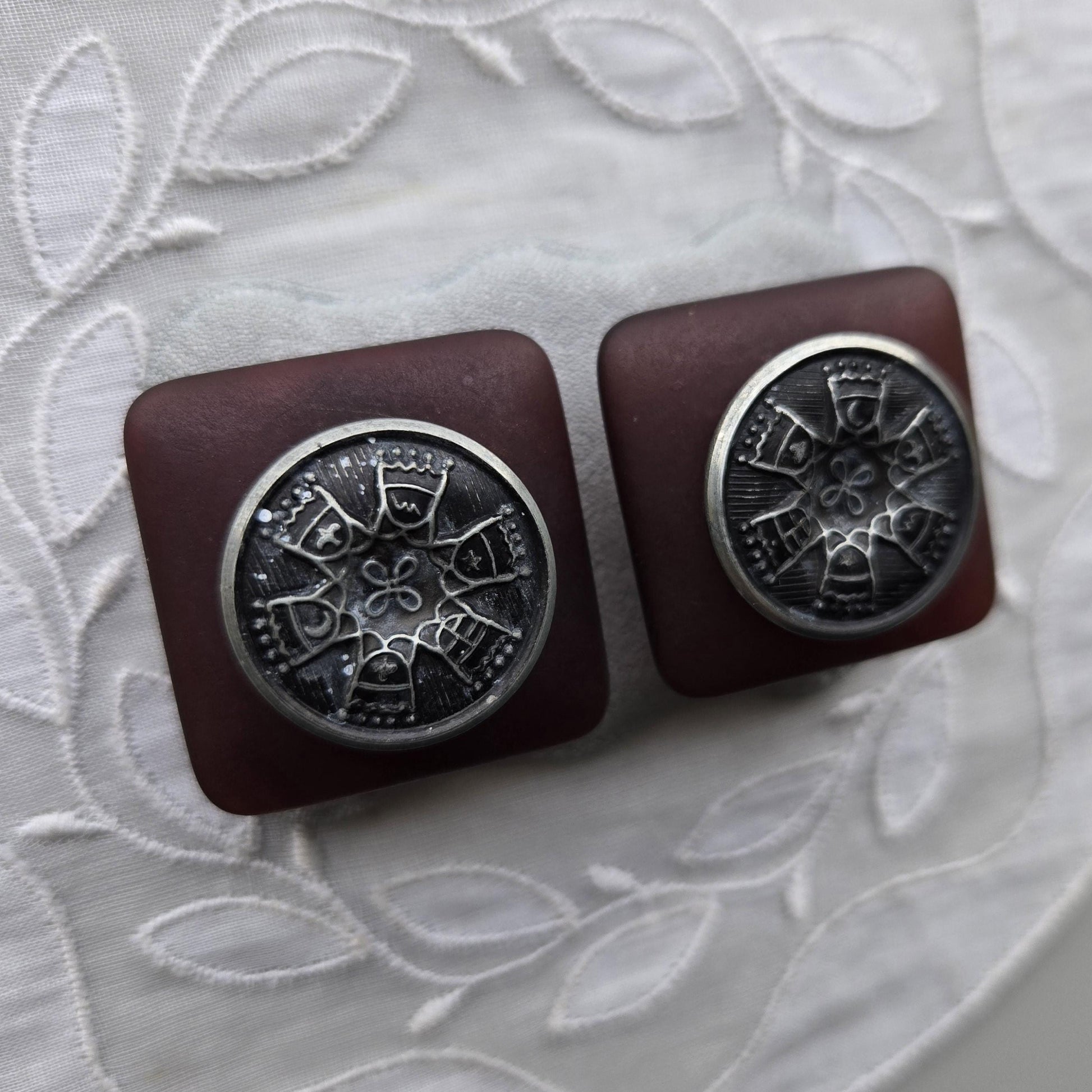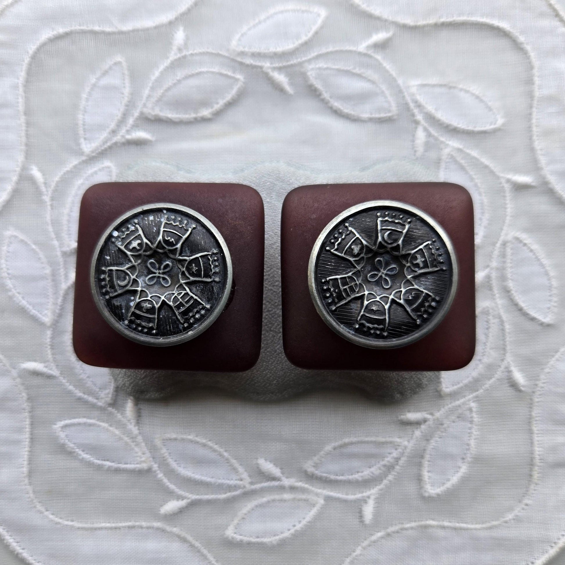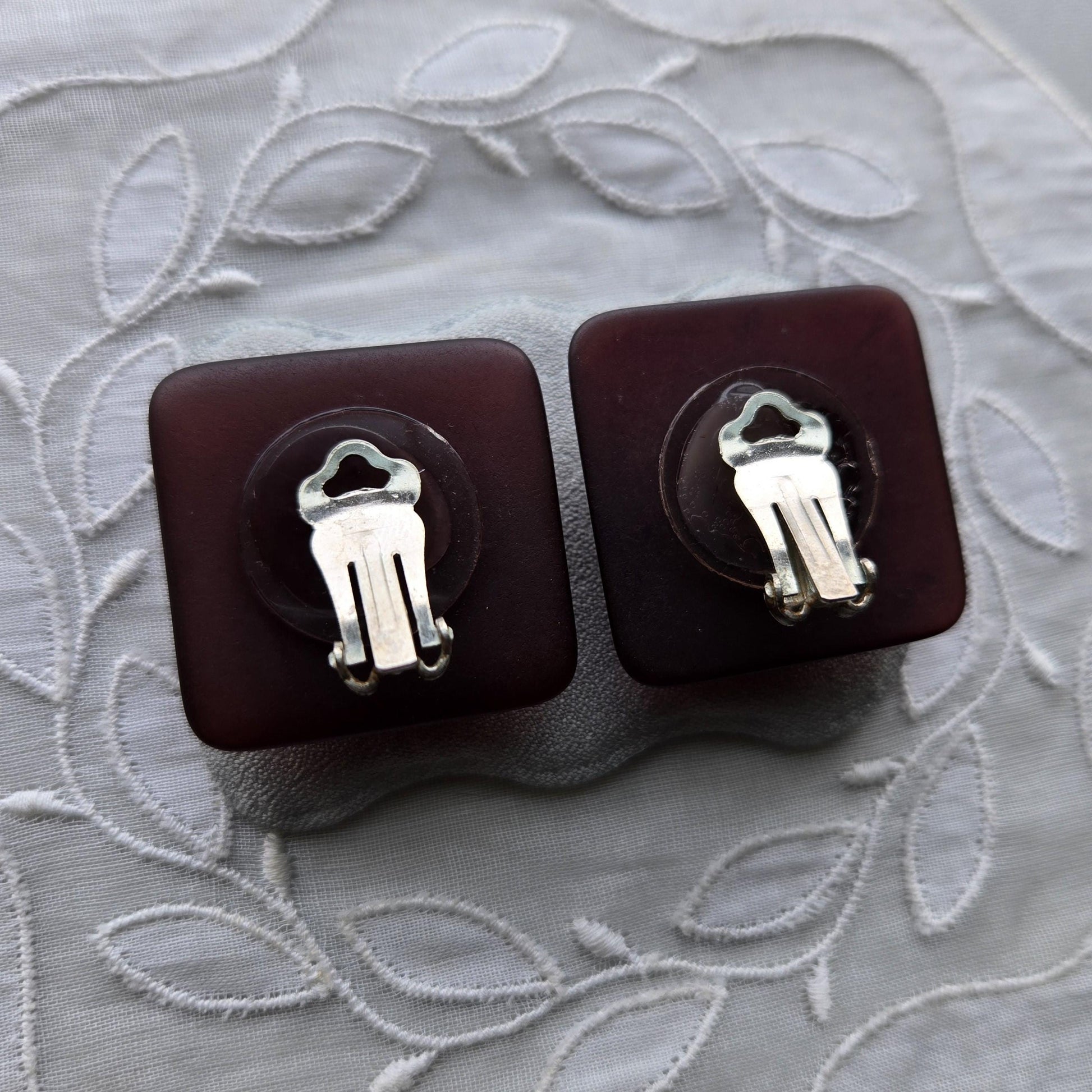 A chic pair of clip on earrings with silver tone plaque and red brown old acrylic