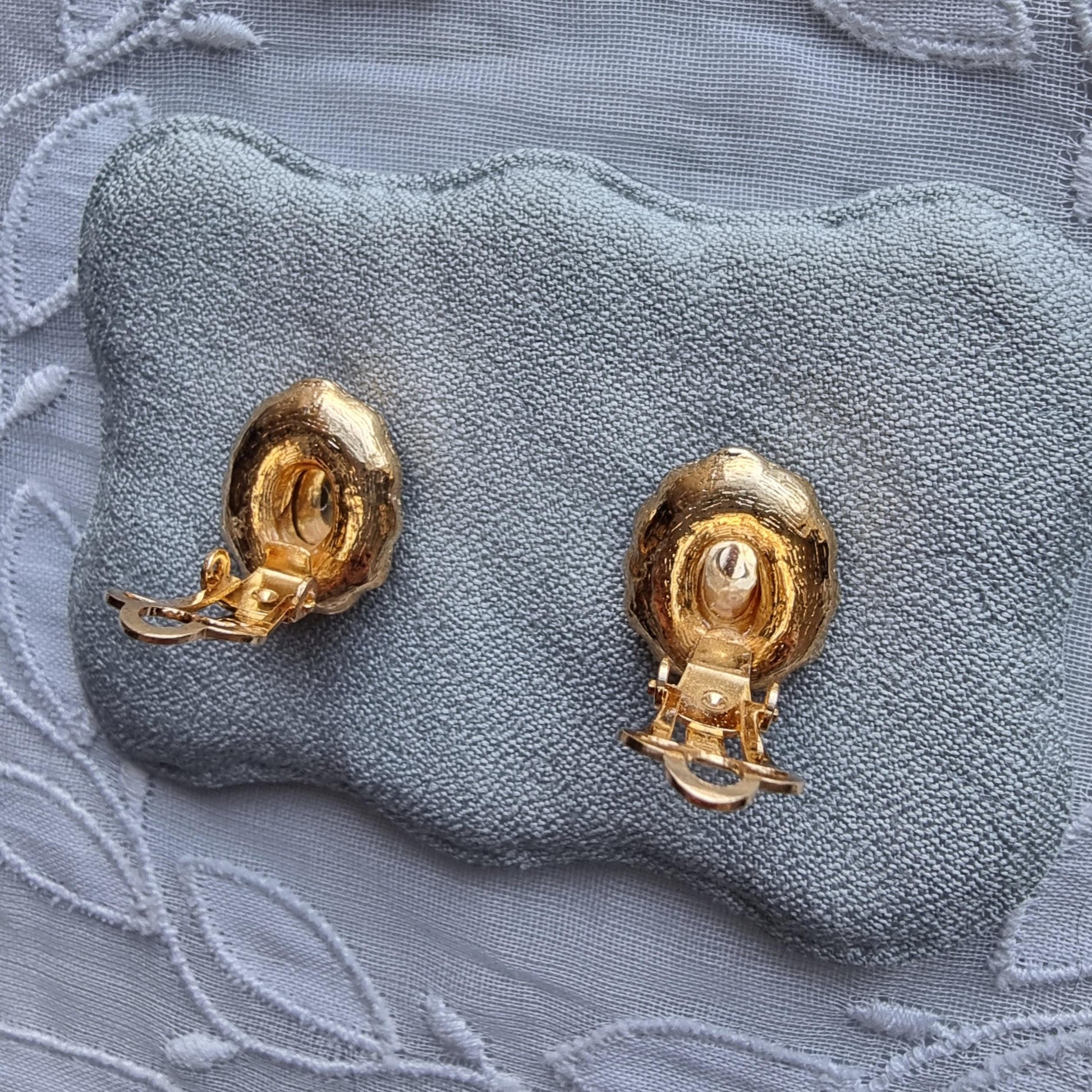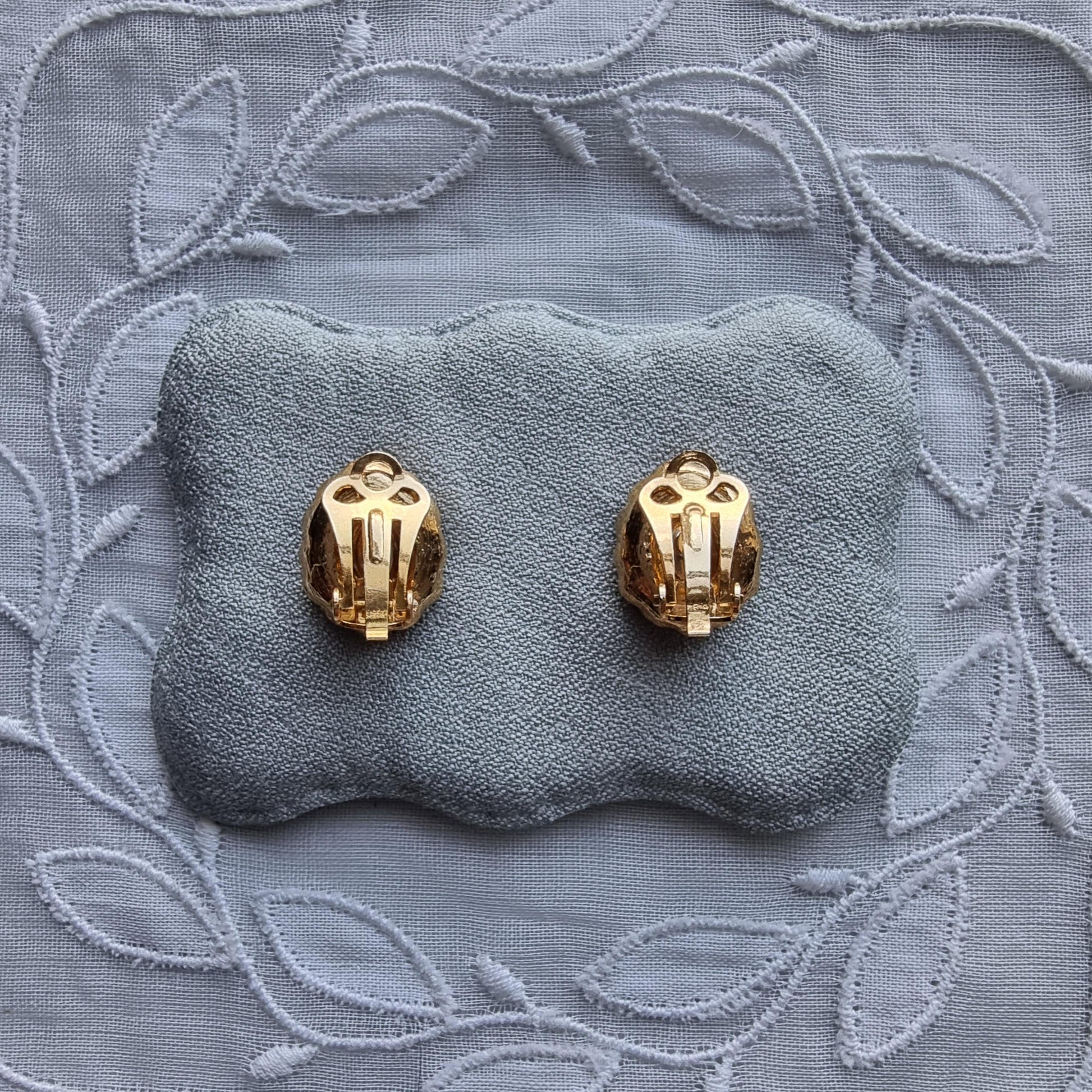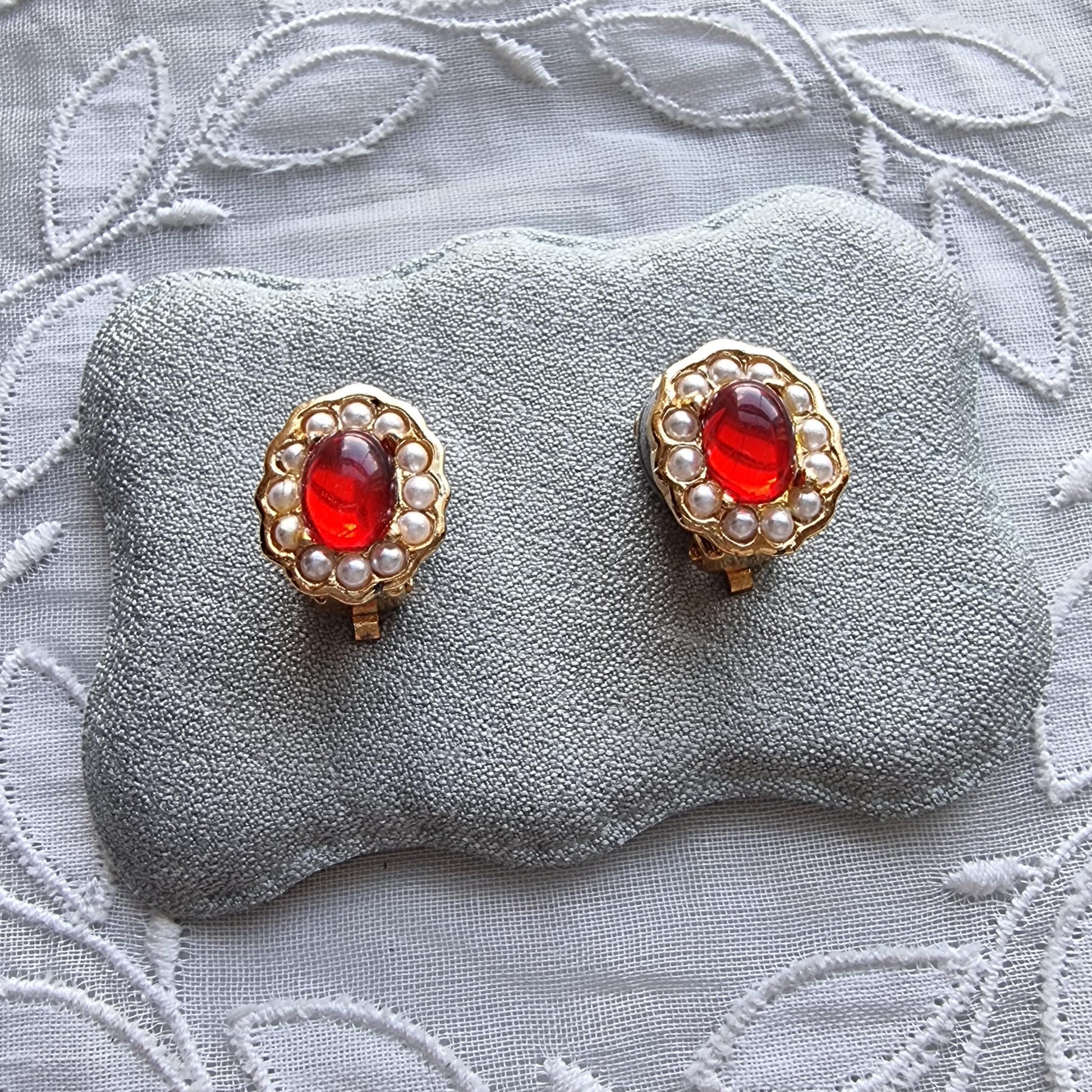 A lovely pair of small clip on earrings with beautiful red cabochon glass and faux pearls set on gold plated metal