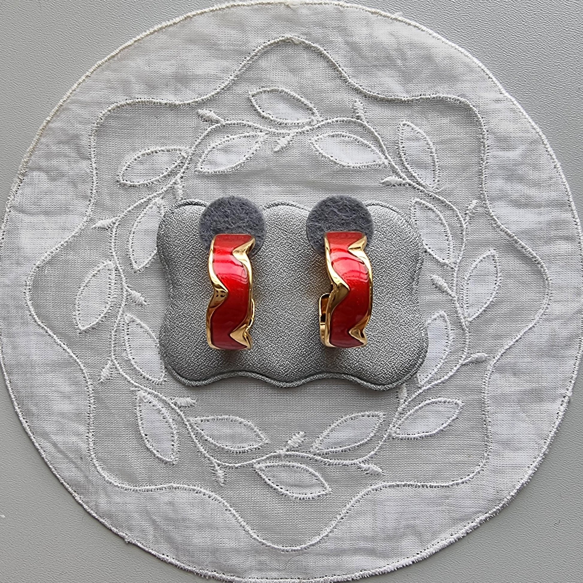 A chic pair of hoop clip on earrings in abstract design with clear red enamel on gold plated metal