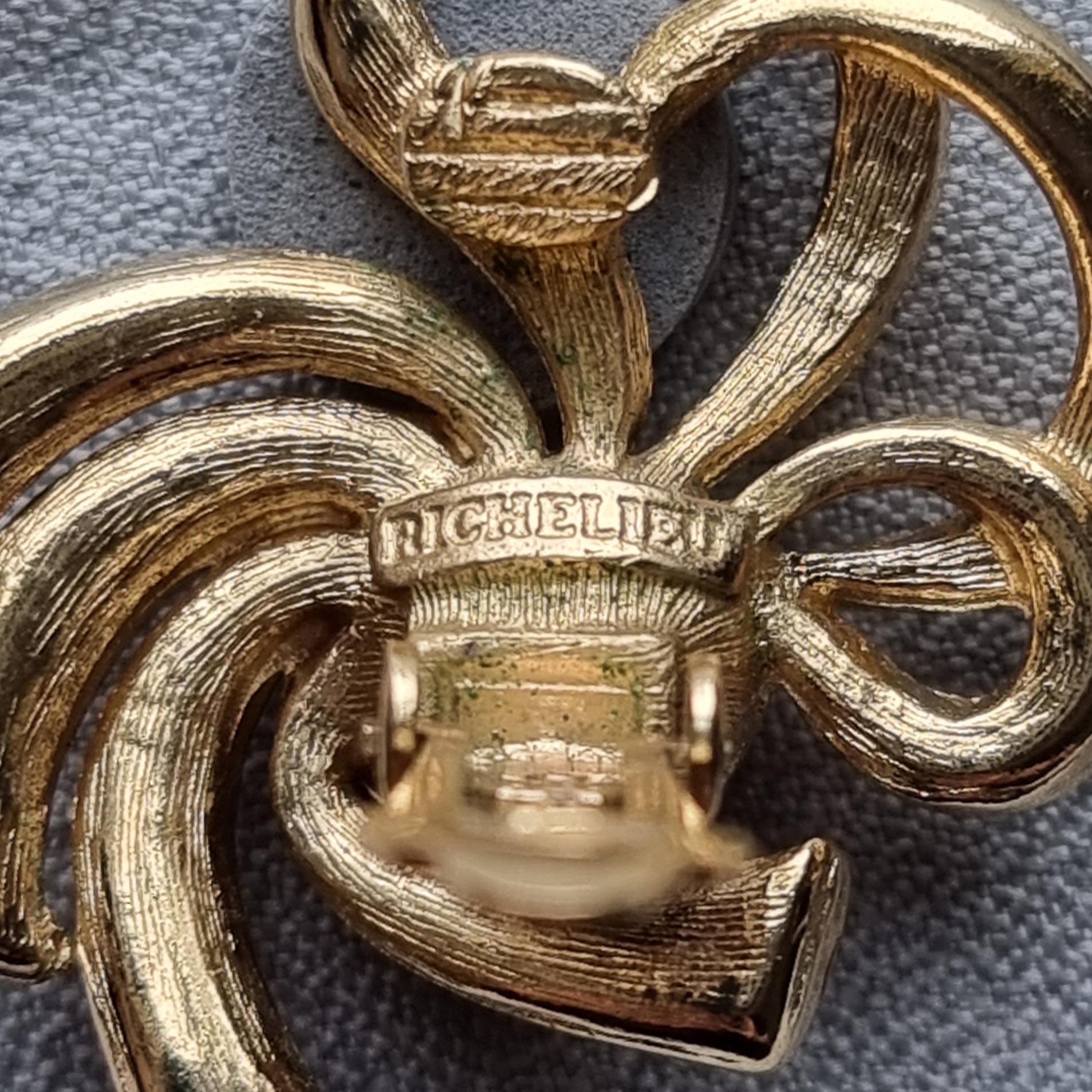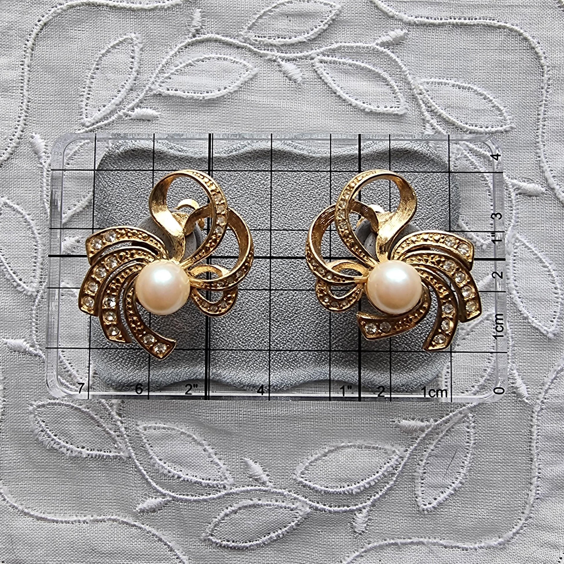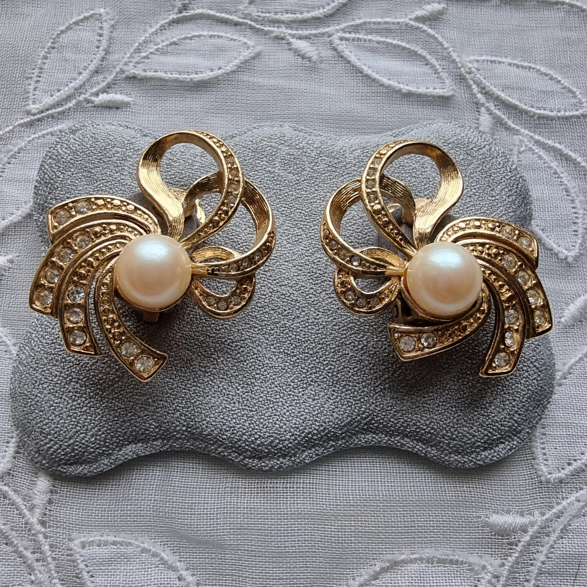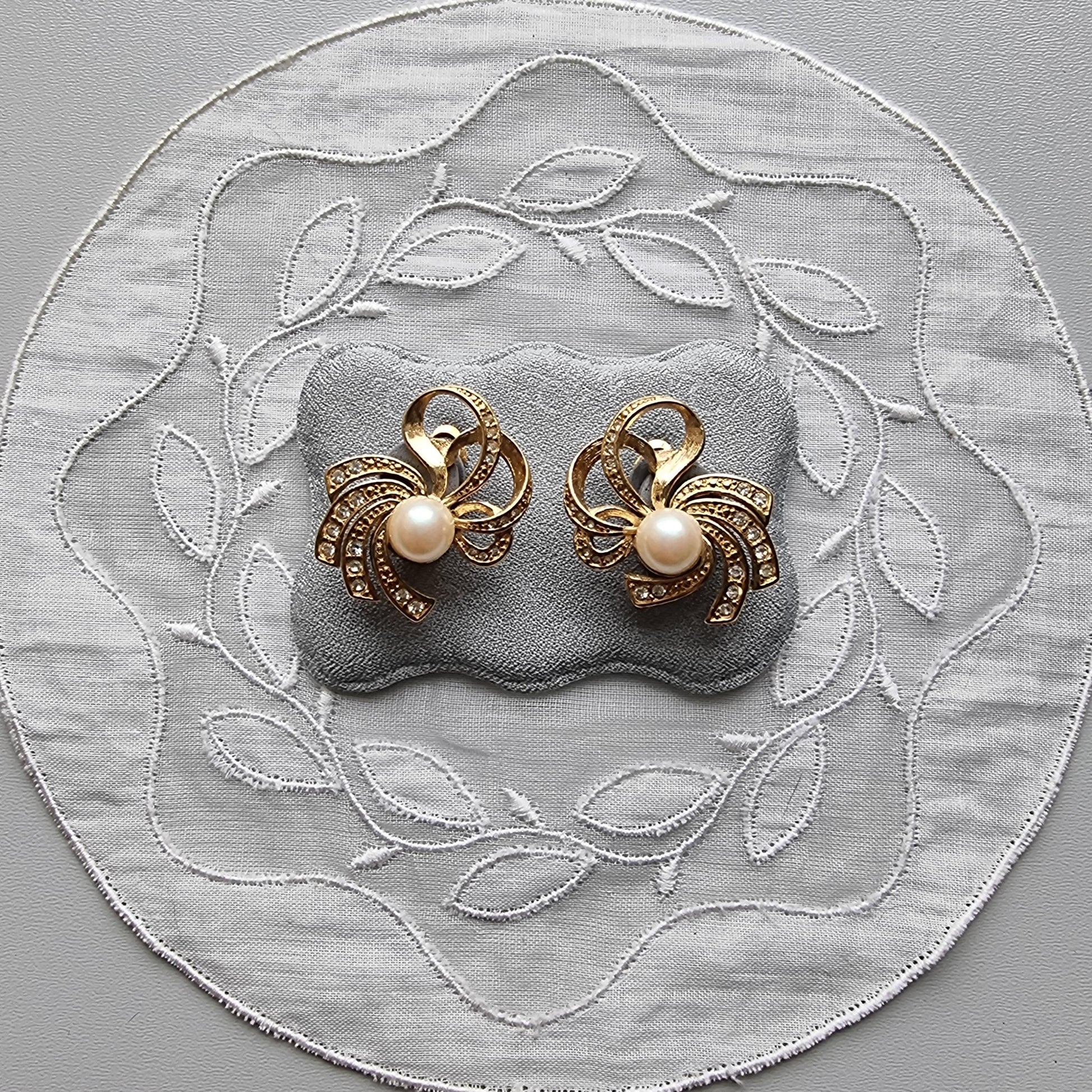 A beautiful pair of delicate bow clip on earrings by Richelieu with faux pearls and clear crystals on gold plated metal
