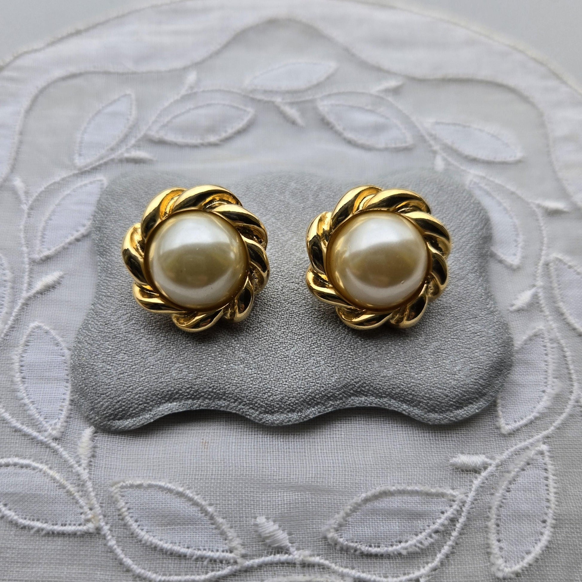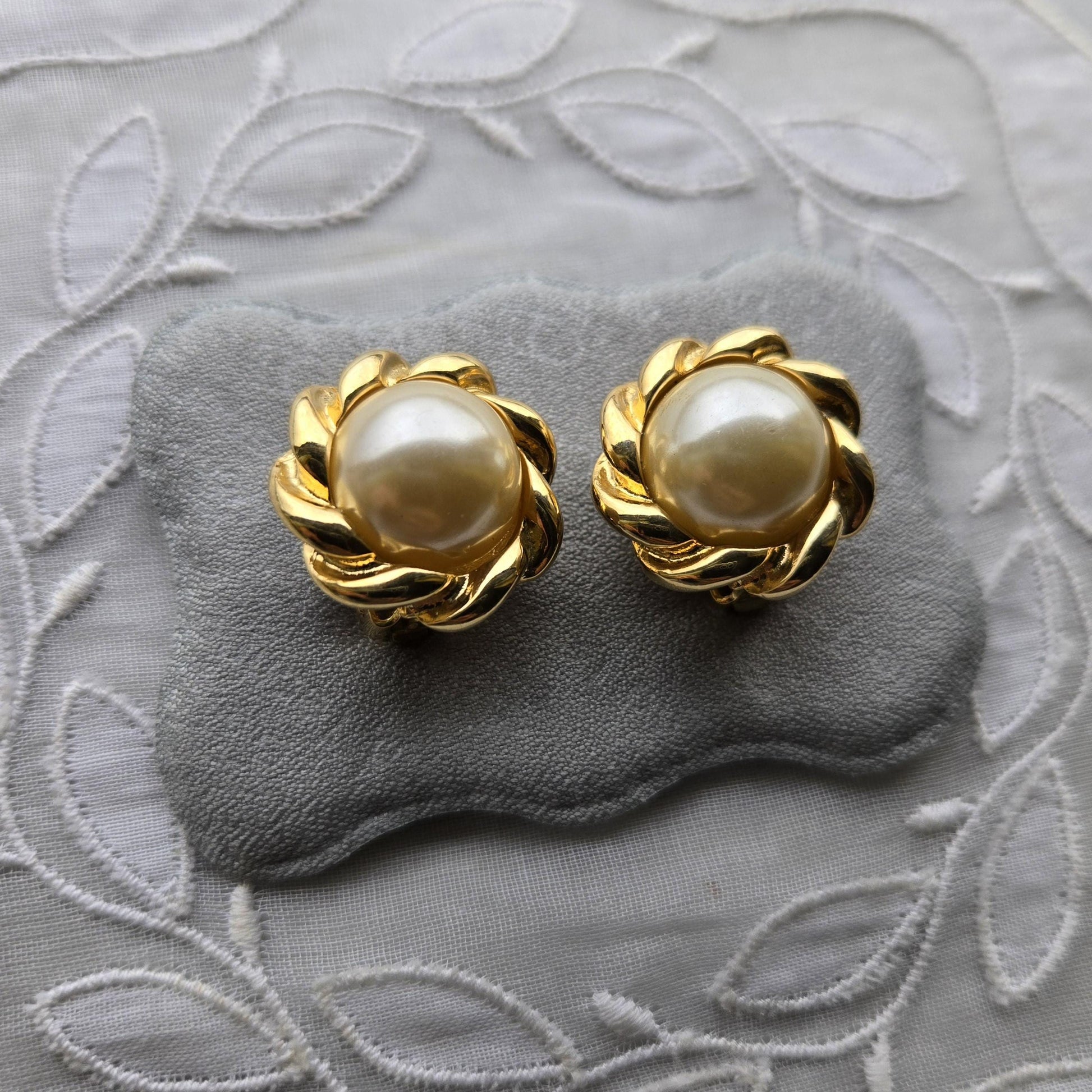 A classic pair of pearl clip on earrings with faux pearl cabochon on gold plated metal