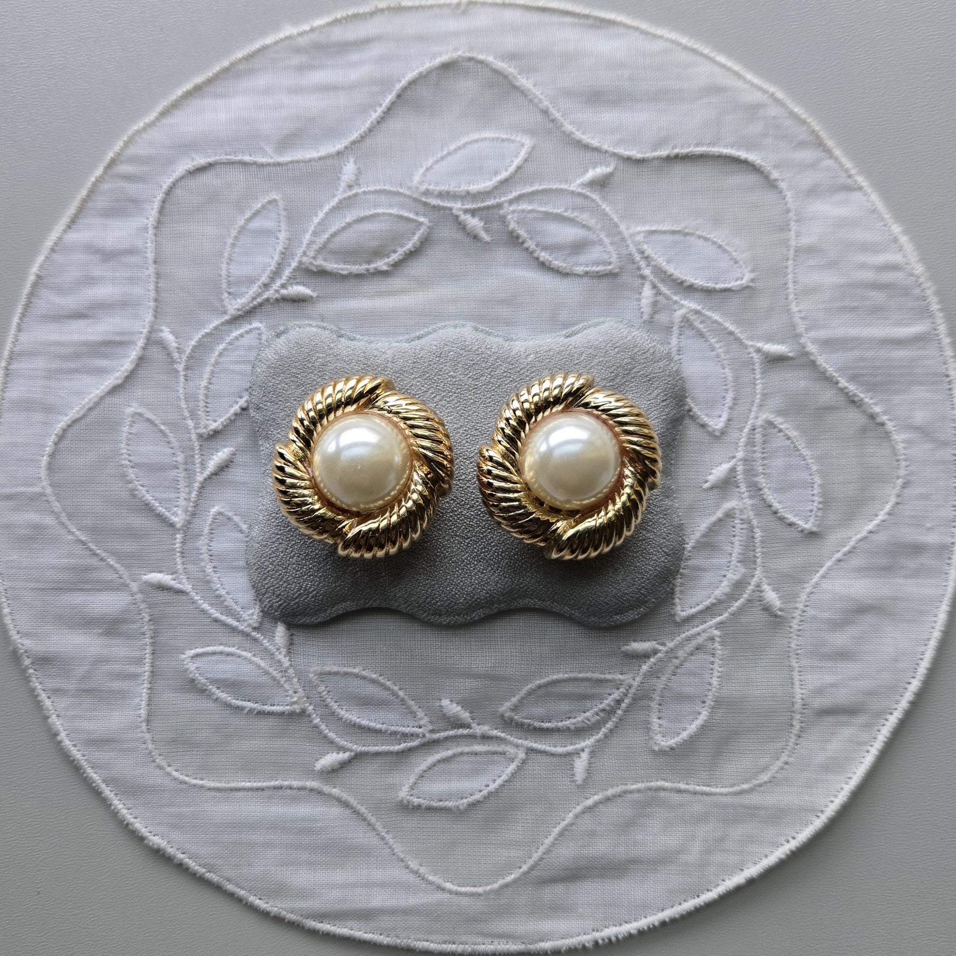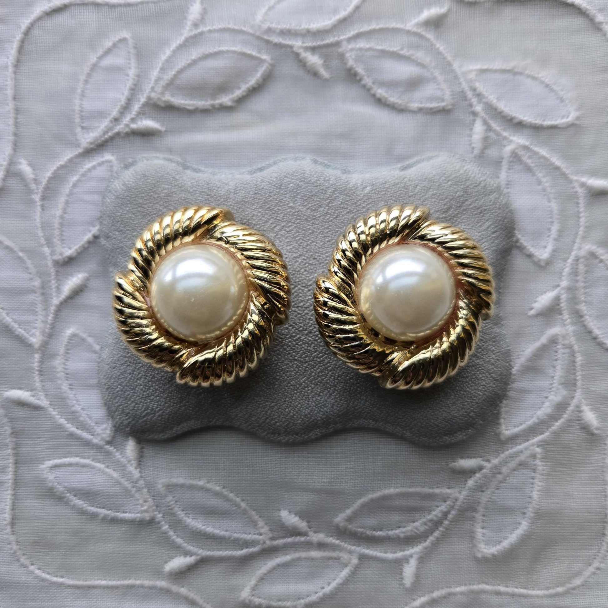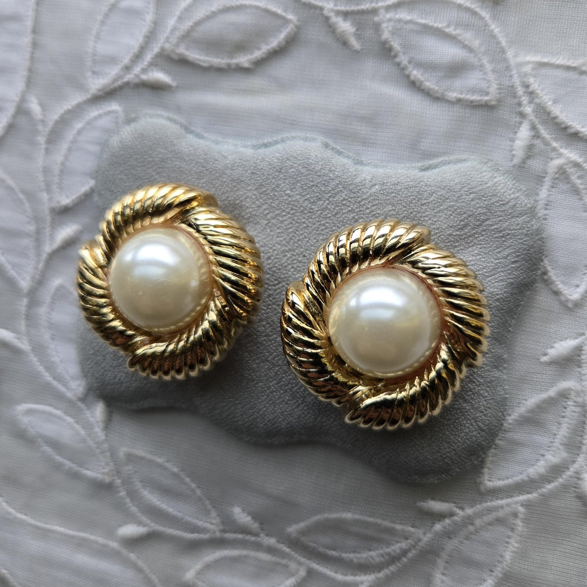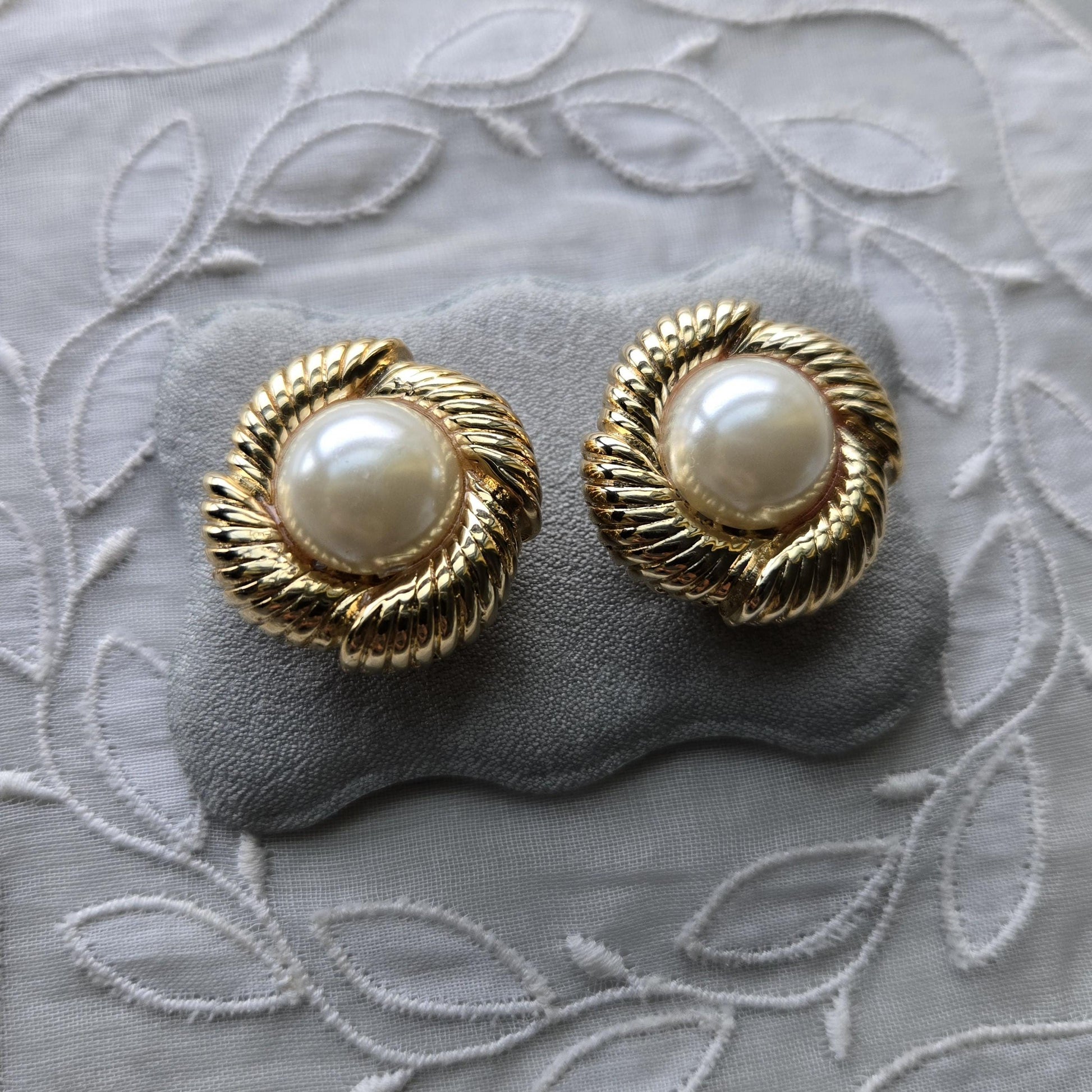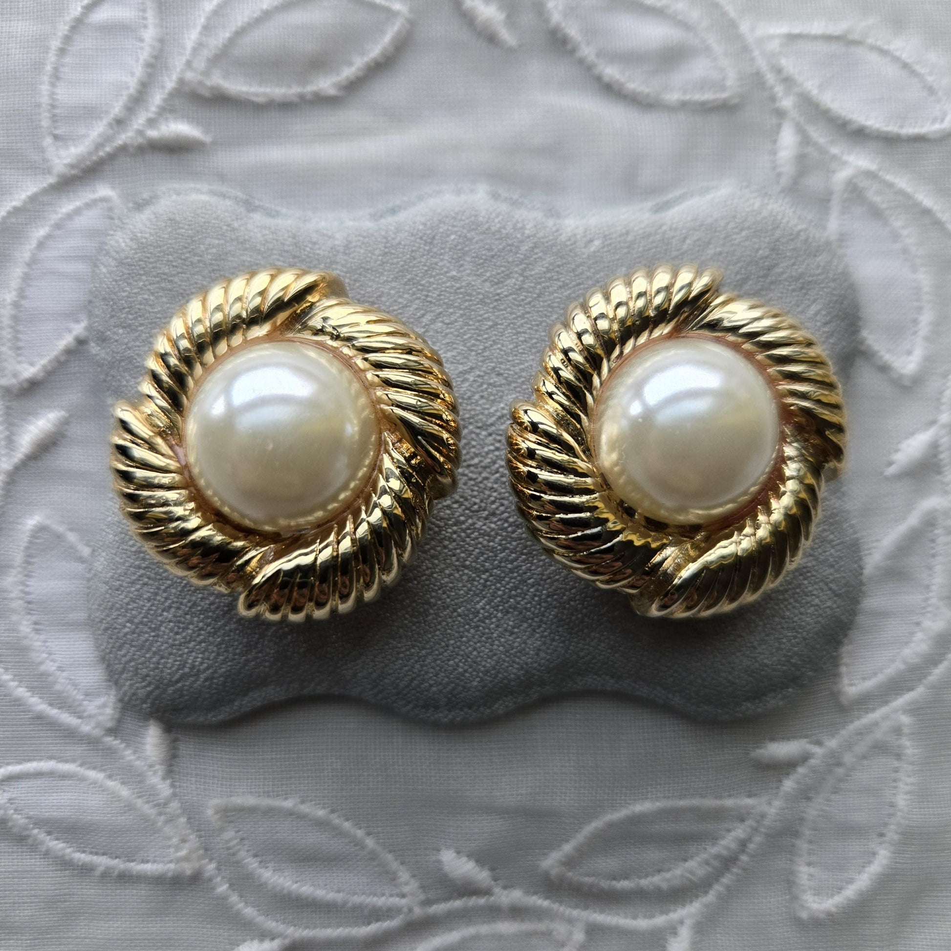A gorgeous pair of pearl clip on earrings with faux pearl cabochon on gold plated metal