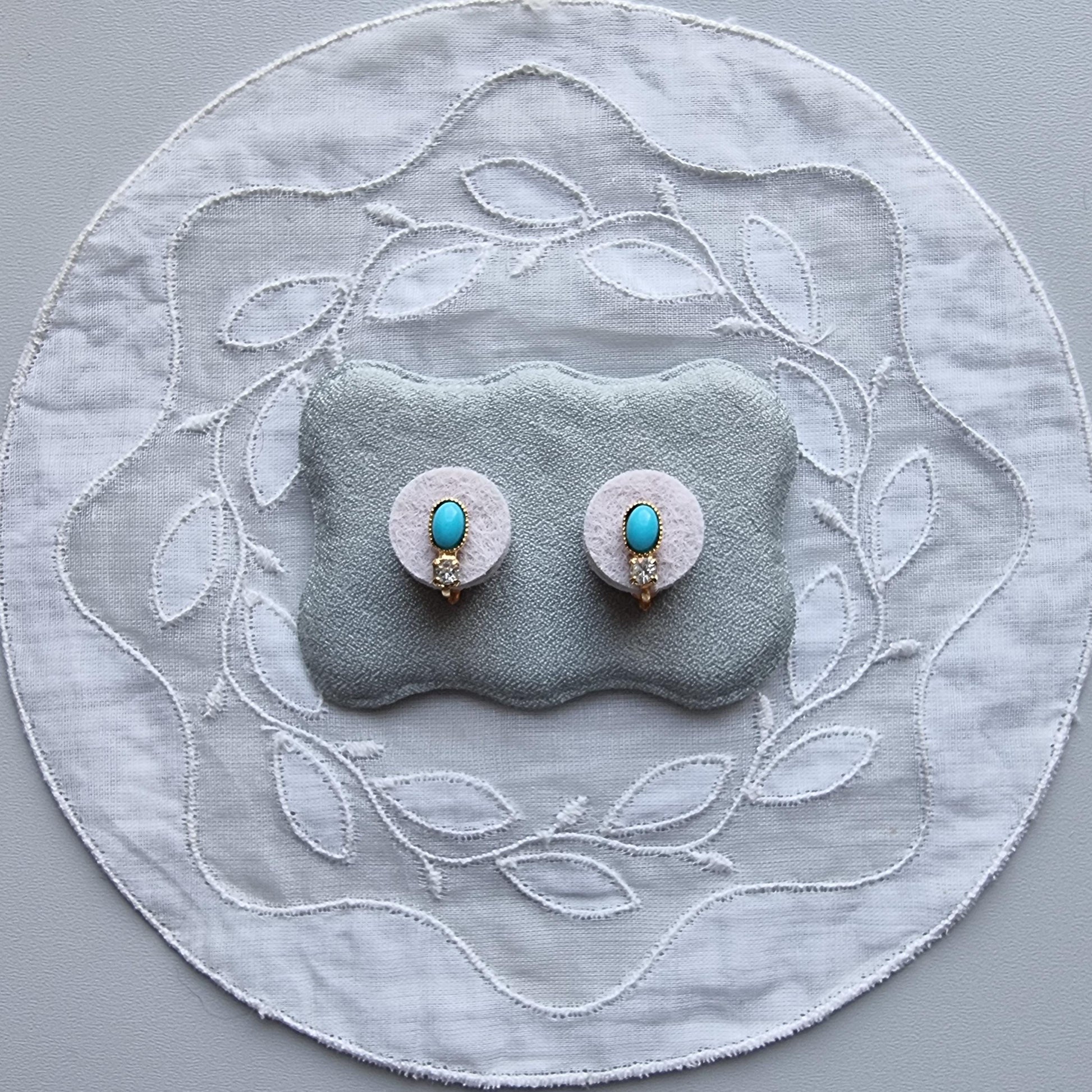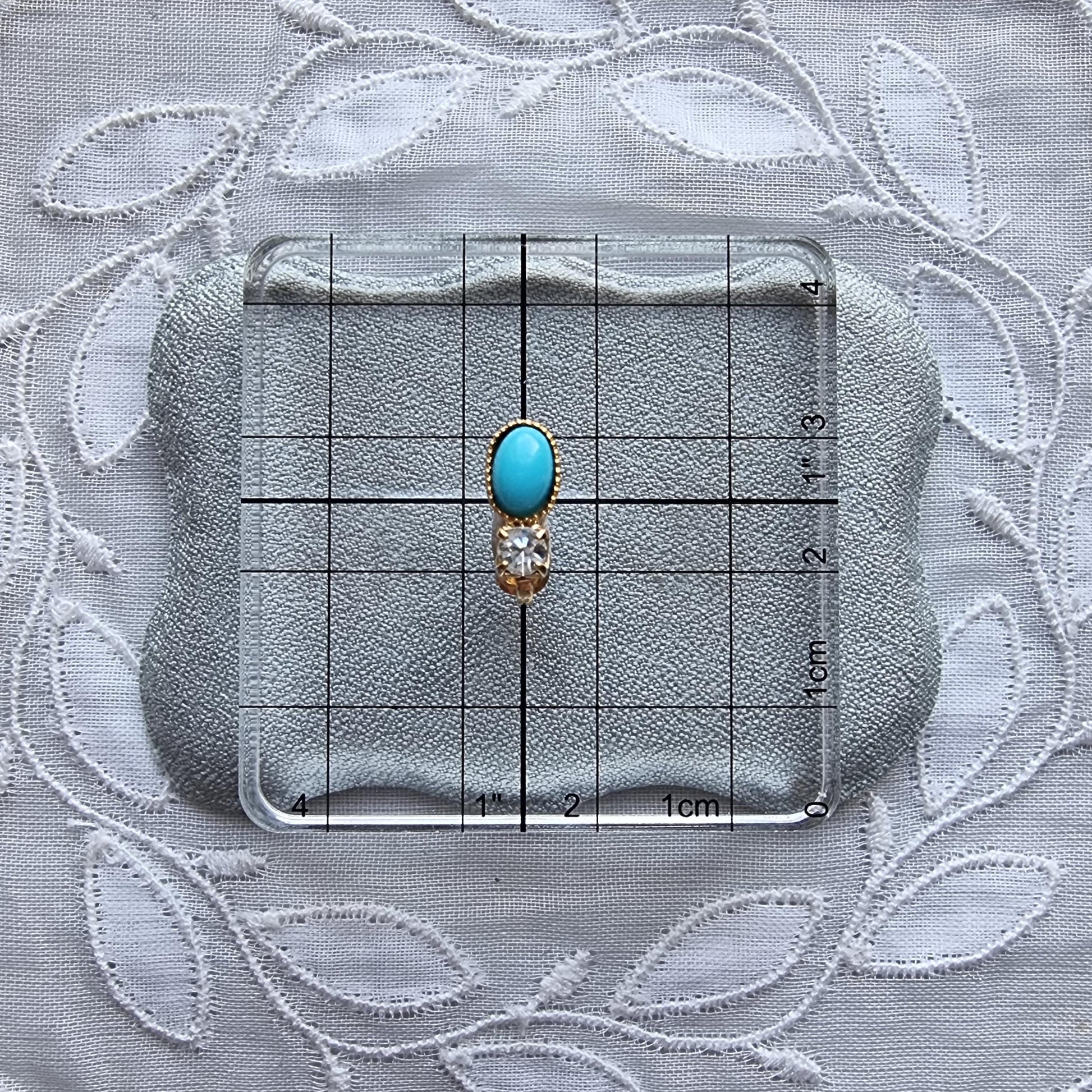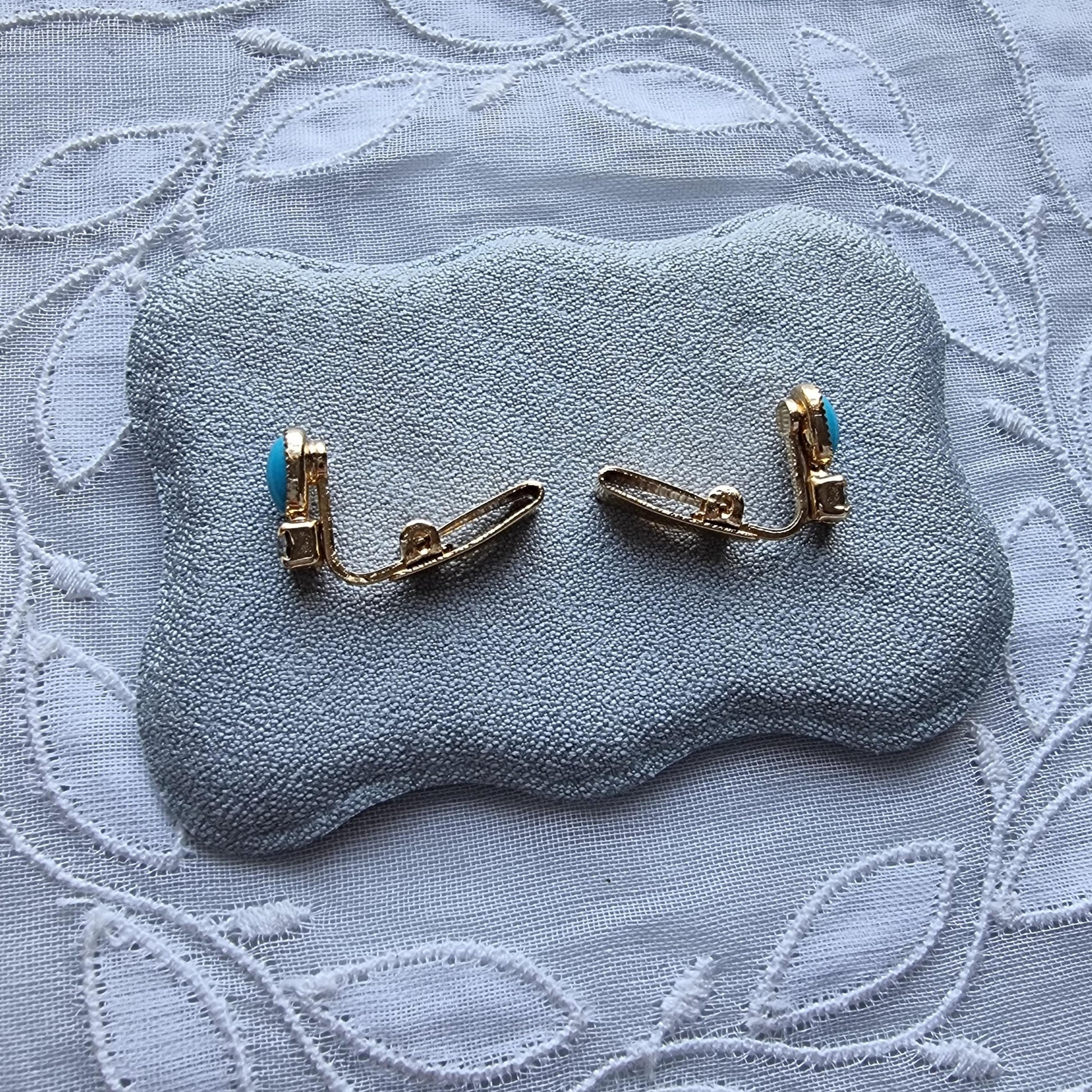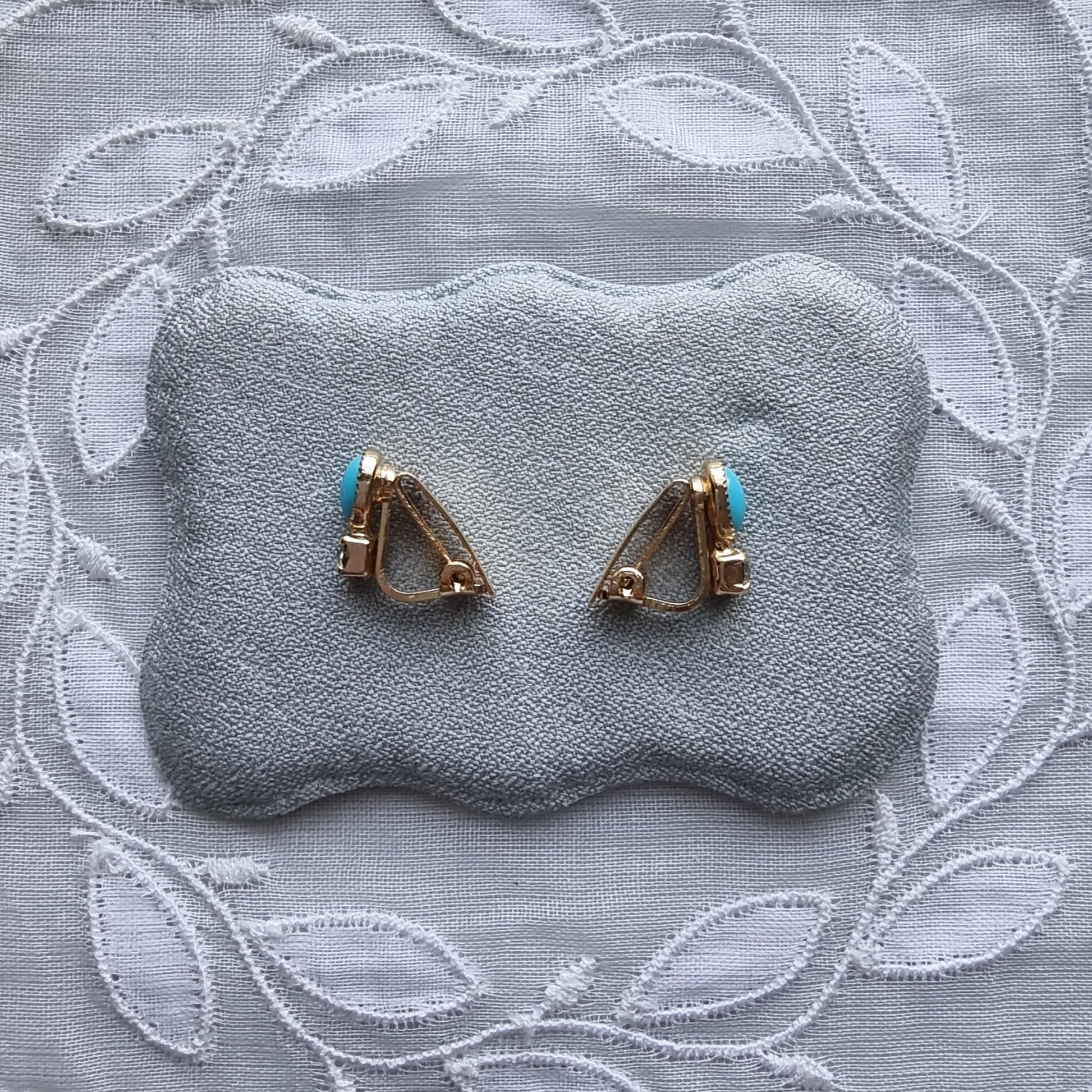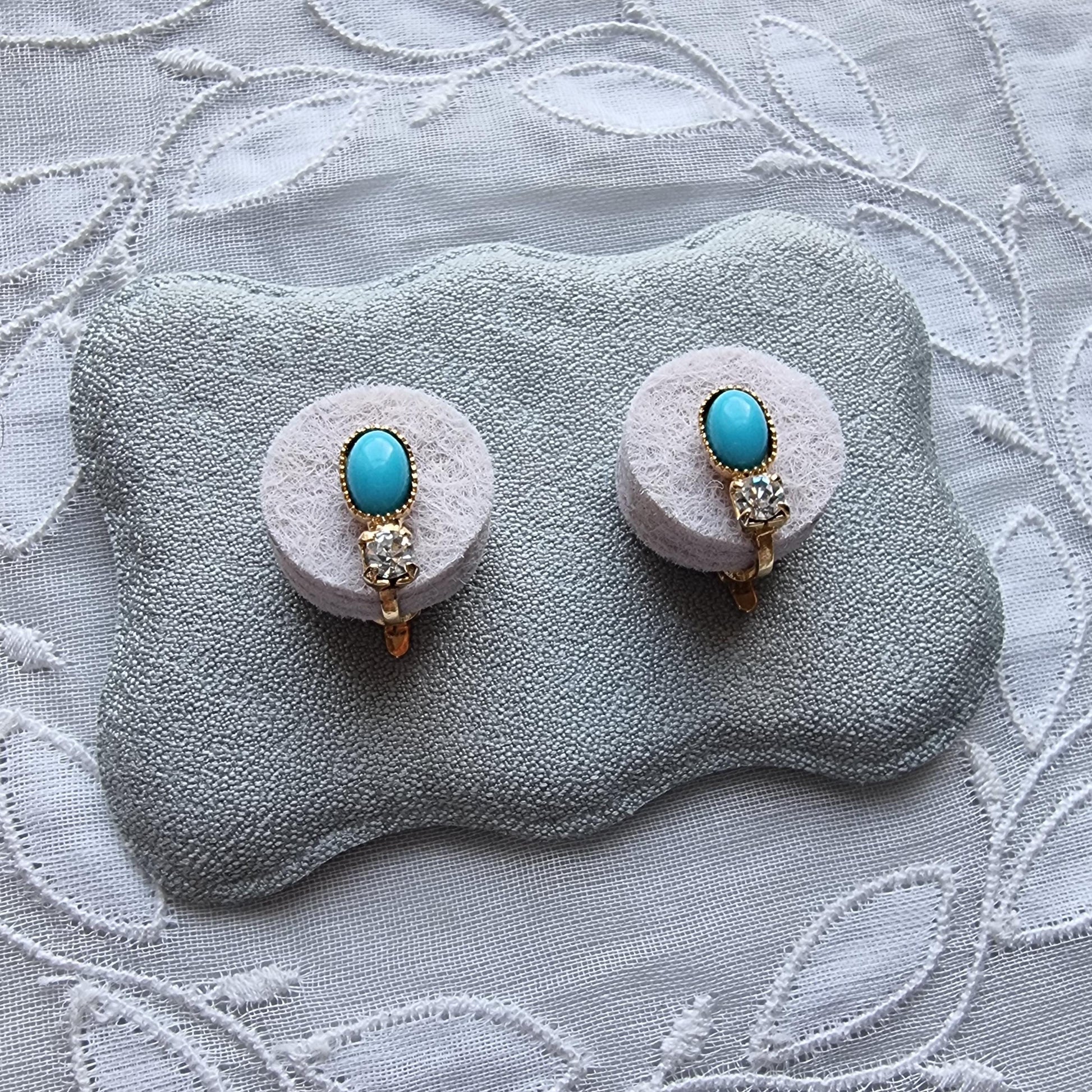A sweet pair of small clip on earrings with faux turquoise cabochon and small clear crystal on gold plated metal